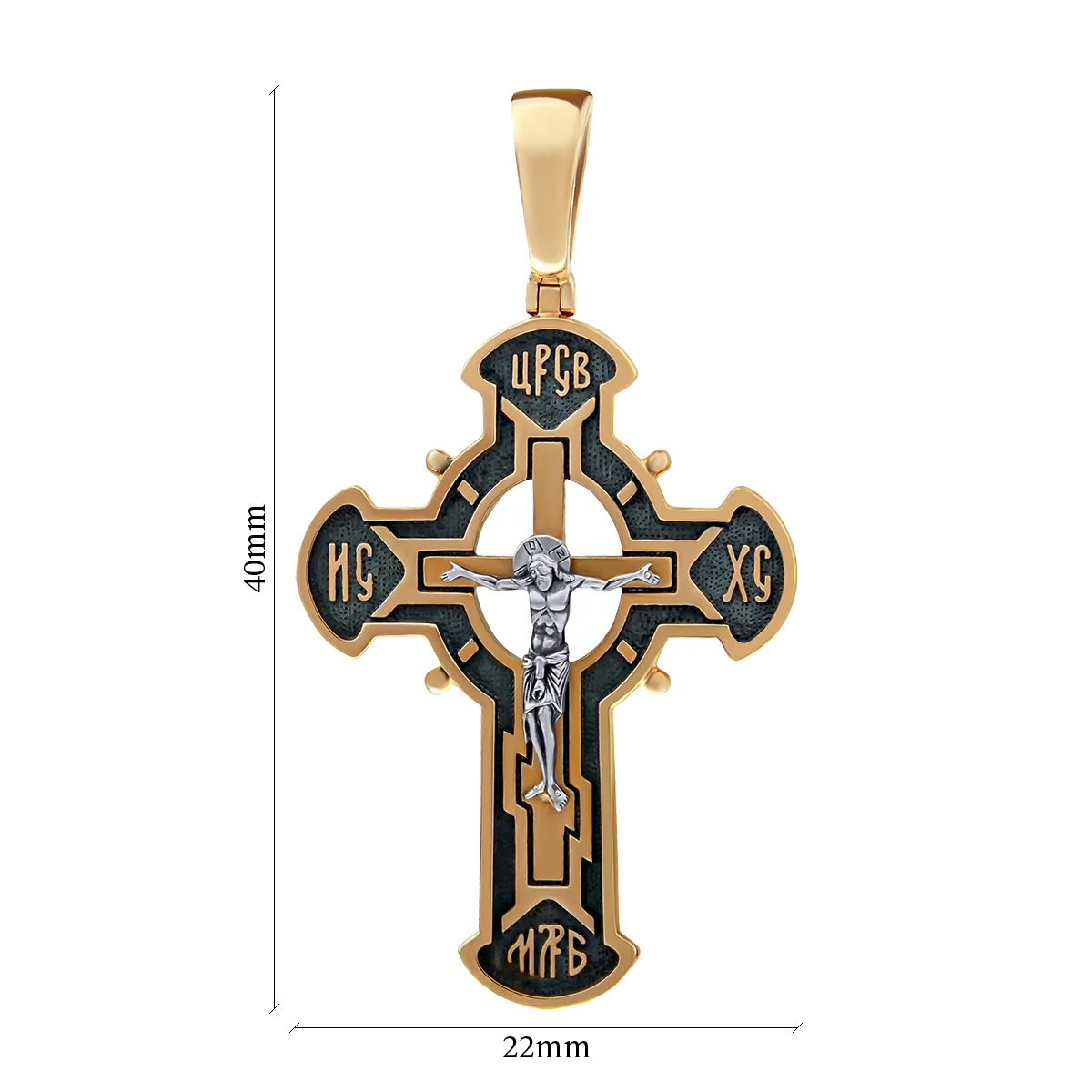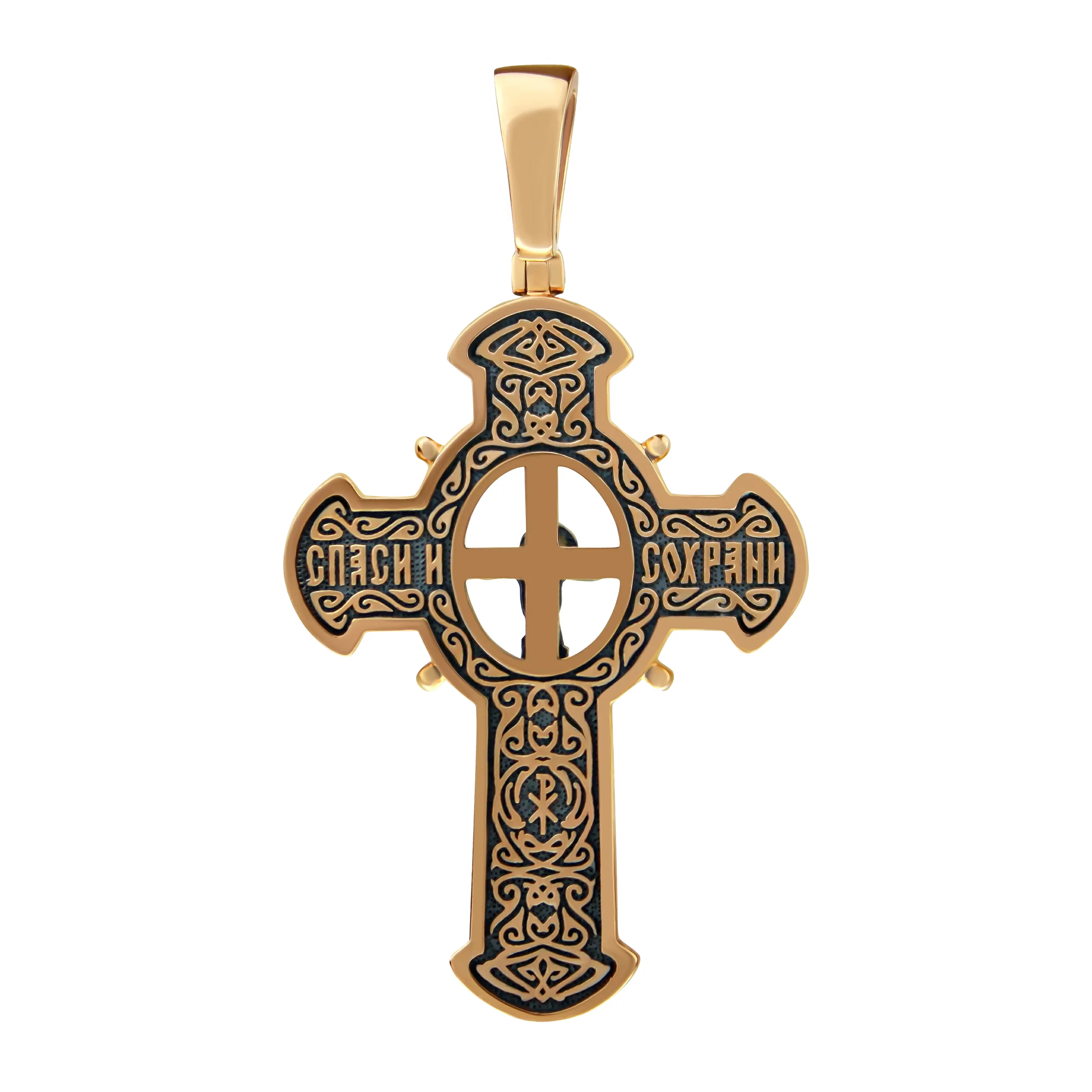 Поєднання приємного відтінку червоного золота з чорнінням – стильний дизайнерський прийом для унікальної прикраси. Кольори вишукано грають між собою, а форми, лінії та фактури здатні завершити ідеальну композицію. Золотий хрестик із чорнінням наочно демонструє подібний підхід. Головною родзинкою виробу є його незвичайна форма з акцентними штрихами та лініями. Відносно невелике за розміром розп'яття не губиться на насиченому дизайнерському тлі. Тильна сторона прикраси не поступається основній завдяки унікальній текстурі візерунчастого орнаменту й оксамитового чорніння.
