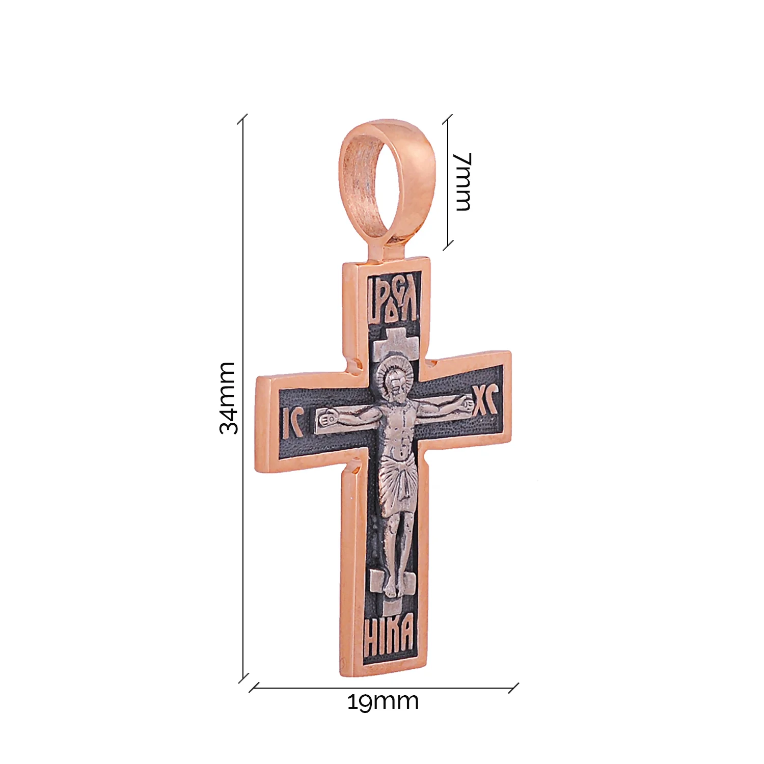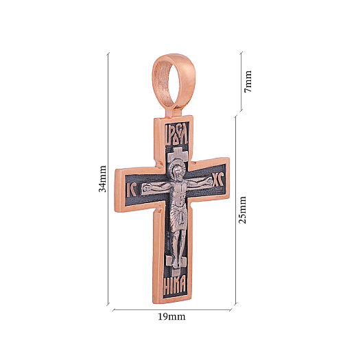 Натільний хрест із червоного золота з чорнінням виглядає неймовірно красиво. У центрі прикраси – біле розп'яття, що різко контрастує з матовим чорним фоном. За допомогою техніки чорніння досягається ефект старовини. Матеріал виробу – золото 585 проби – славиться твердістю і практичністю в носінні. Велике вушко дозволить підібрати золотий ланцюжок на свій смак. Модель вигідно підкреслить будь-який образ – від класичного до екстравагантного. Завдяки ексклюзивному дизайну й універсальності коштовність буде чудовим подарунком чоловікові або жінці.