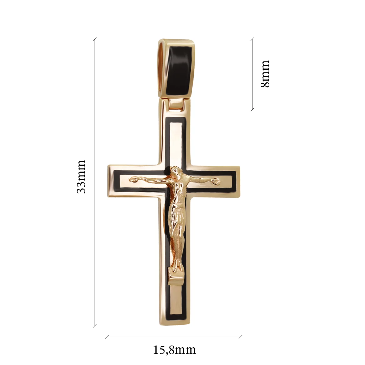 Цей яскравий і виразний хрестик стане гарним елементом вашого образу. Виконаний у згоді з православною традицією, складається не просто з фігурки місця розп'яття, а й об'ємного зображення Ісуса. Прикраса зроблена з червоного золота. Сплав 585 проби зарекомендував себе як красивий, міцний та стійкий до пошкоджень. Характерний відтінок зумовлений вмістом міді. Покриття чорною емаллю створює оригінальний акцент. Прямі лінії та правильні кути сподобаються любителям стриманих прикрас. Модель красиво виглядатиме на чоловічій або жіночій шиї.