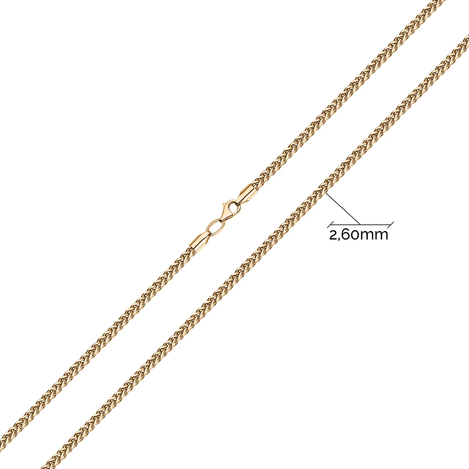 Ланцюжок у плетінні колосок виконано з червоного золота 585 проби, що надає йому теплого сяйва і довговічності. Цей матеріал вирізняється своєю міцністю, а також легкістю в догляді, що дає змогу прикрасі залишатися у відмінному стані протягом довгого часу. Застібка карабін відома своєю надійністю і легкістю у відкритті та закритті, що робить ланцюжок ідеальним для щоденного носіння. Цей ланцюжок стане чудовим подарунком для будь-якої важливої події - дня народження, ювілею або весілля.