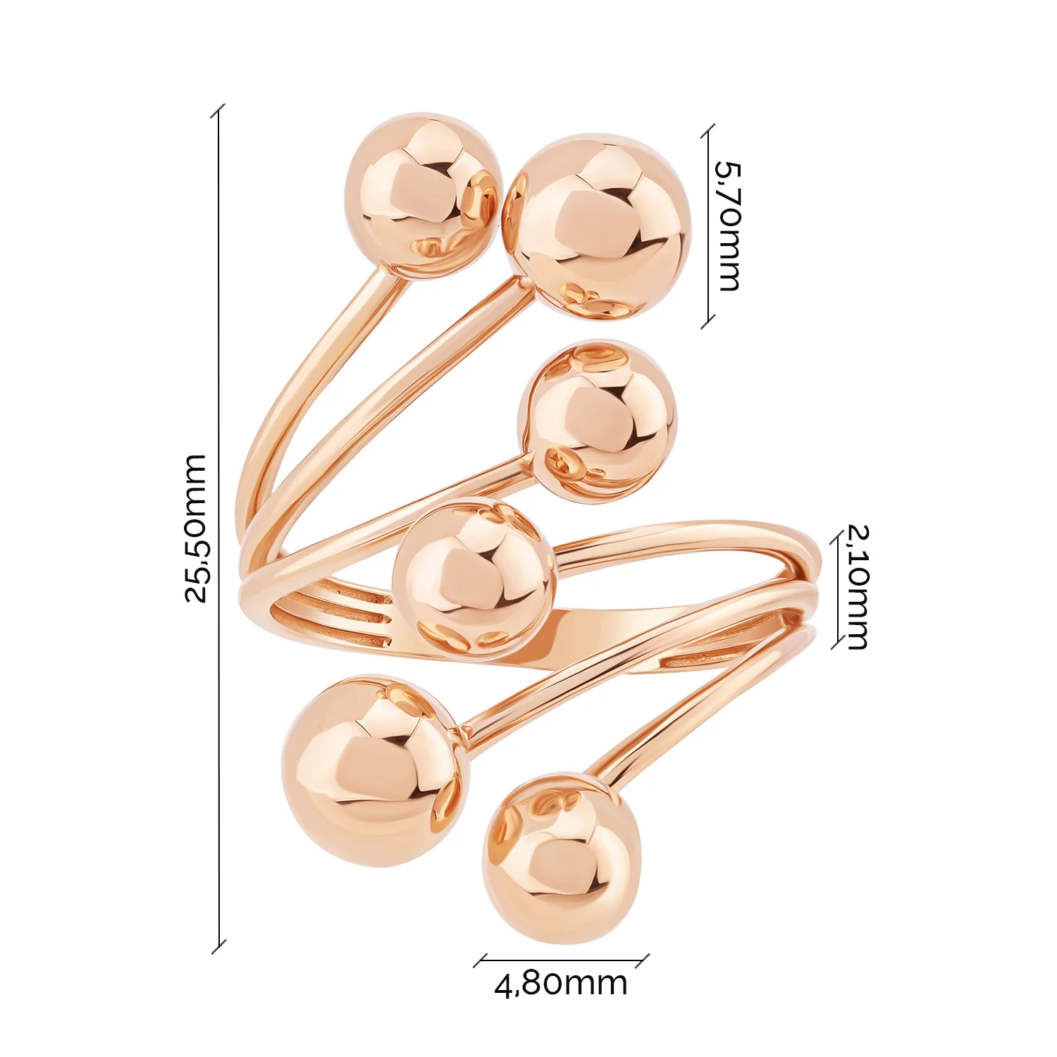 Каблучка із червоного золота «Кулі» — універсальна прикраса на жіночу руку, що привертає увагу геометричним стилем та об'ємною формою. Вона виконане з висококласного дорогоцінного металу 585-ї проби з додаванням міді в лігатуру сплаву, що надає йому насичений теплий відтінок. Основа каблучки розходиться на три смуги, оздоблені кулями. Завдяки цьому виріб виглядає широким і добре помітним на руці. Його можна поєднувати із сережками, браслетами та іншими ювелірними прикрасами, доповнюючи ними повсякденні вбрання і не тільки.