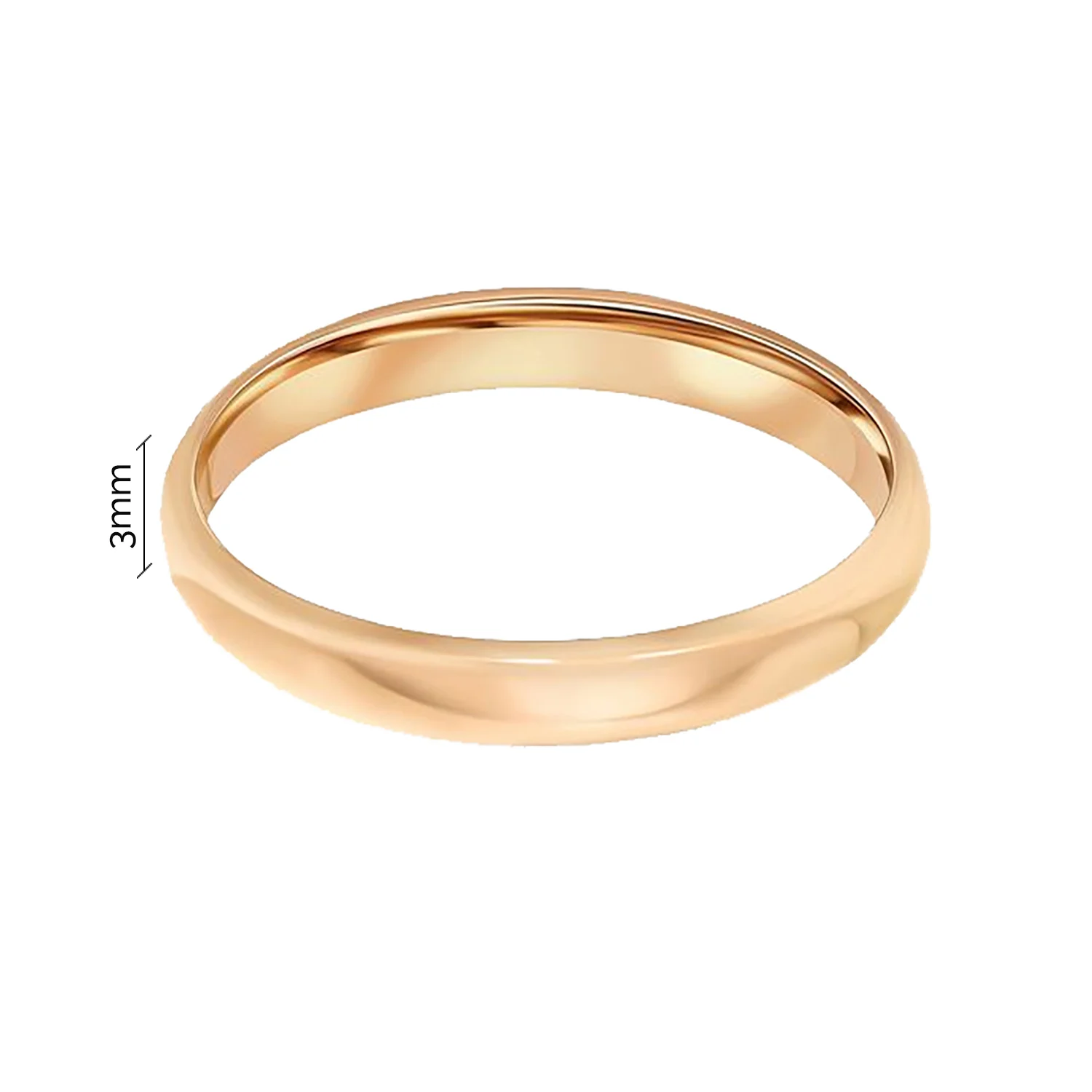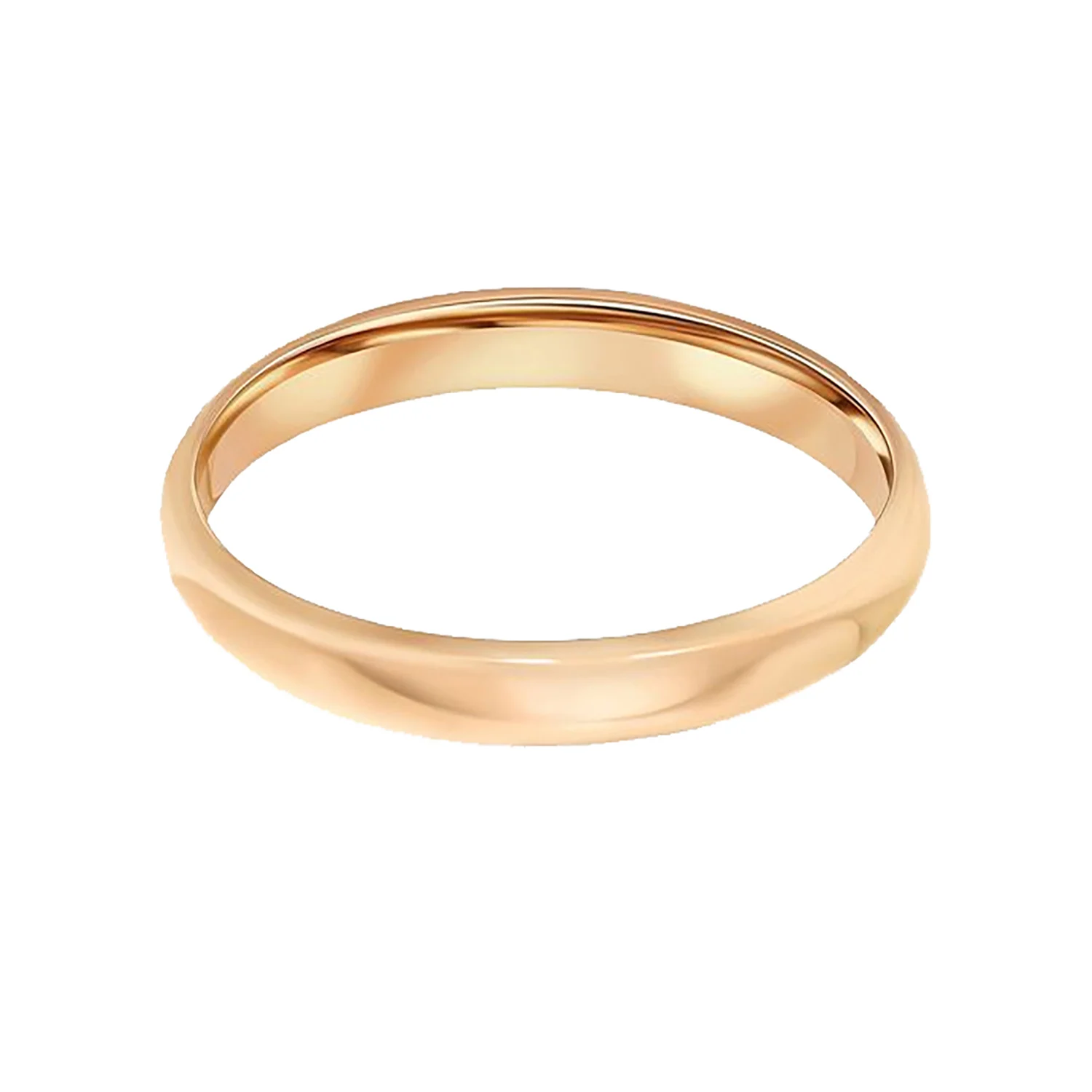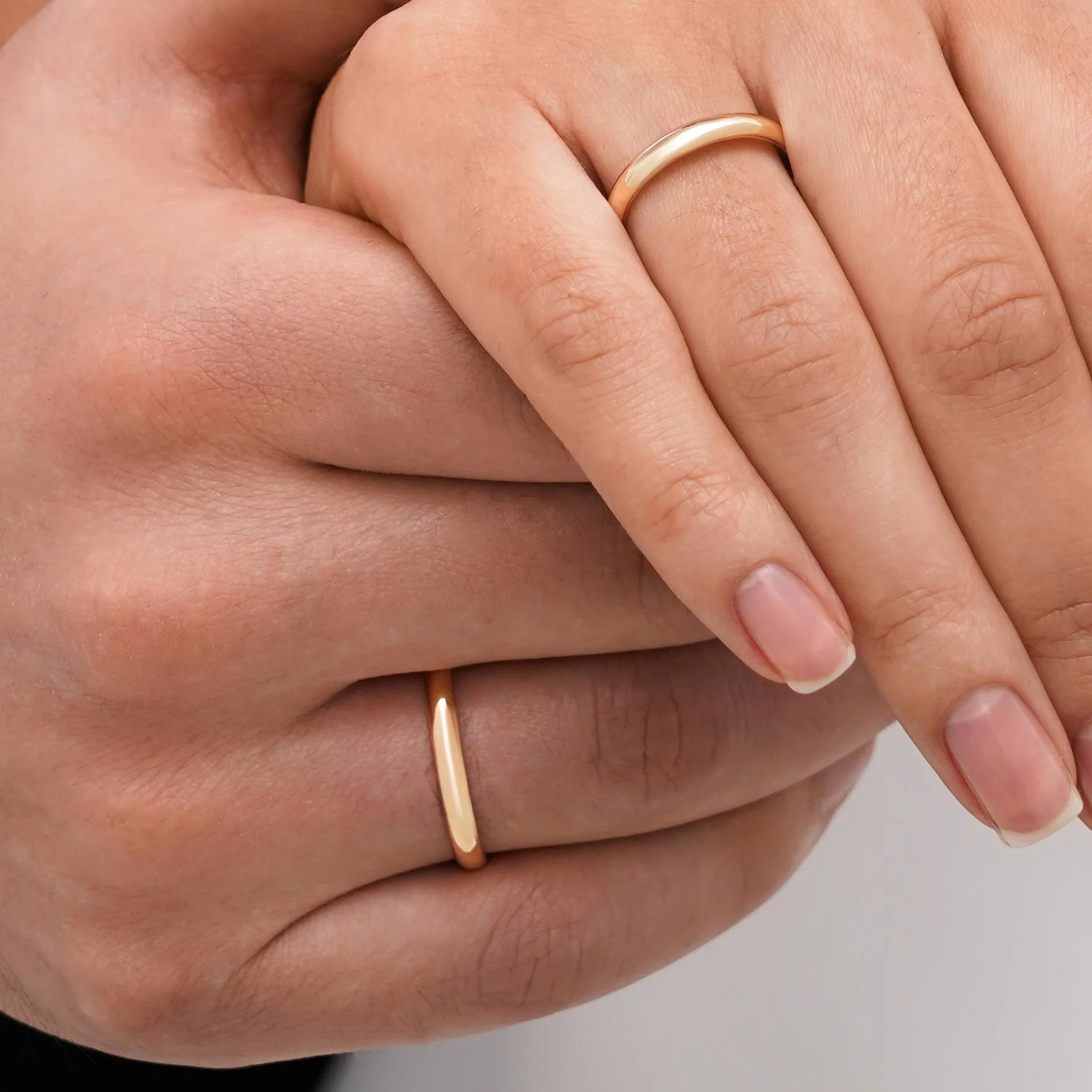 Обручка з червоного золота 585 проби — достатньо тонка, щоб її майже не відчувати на безіменному пальці, та одночасно елегантна. Форма шинки виробу злегка. Шляхетний червоний колір металу забезпечує наявність в металі лігатури — міді. Золото видає гарний мерехтливий блиск. Брак декору на обручці — гарна нагода носити її з іншими ювелірними прикрасами з гравіюванням або інкрустацією камінням. Цей витончений виріб підійде нареченим, які віддають перевагу мінімалізму.