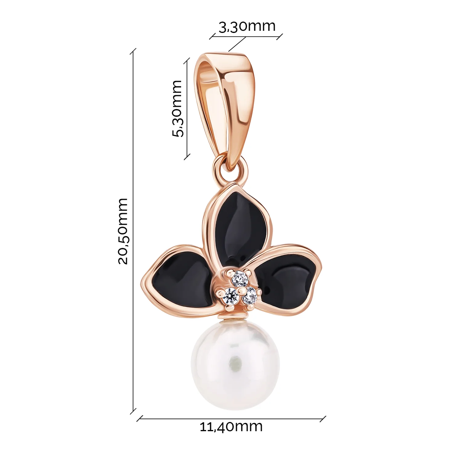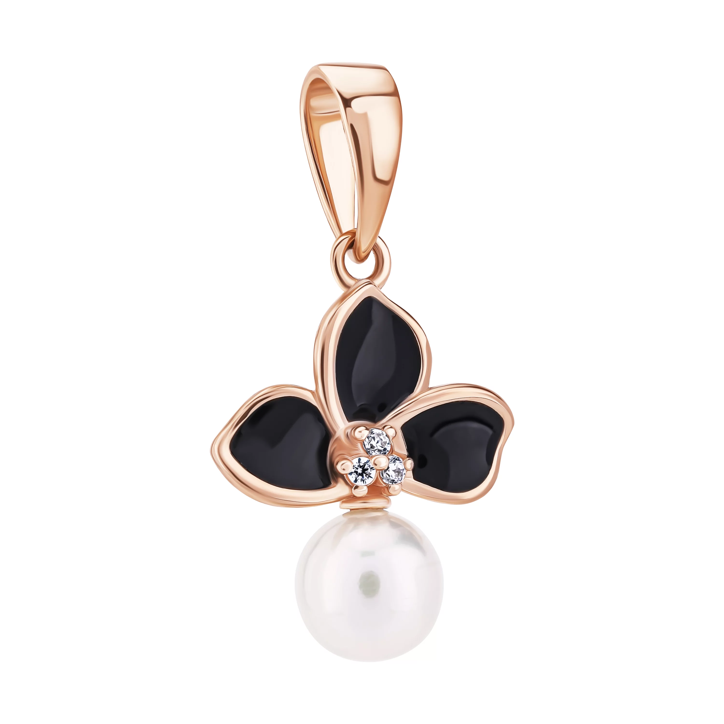 Стильний підвіс "Флора" у білому золоті з емаллю, перлиною та фіанітами - 1938503