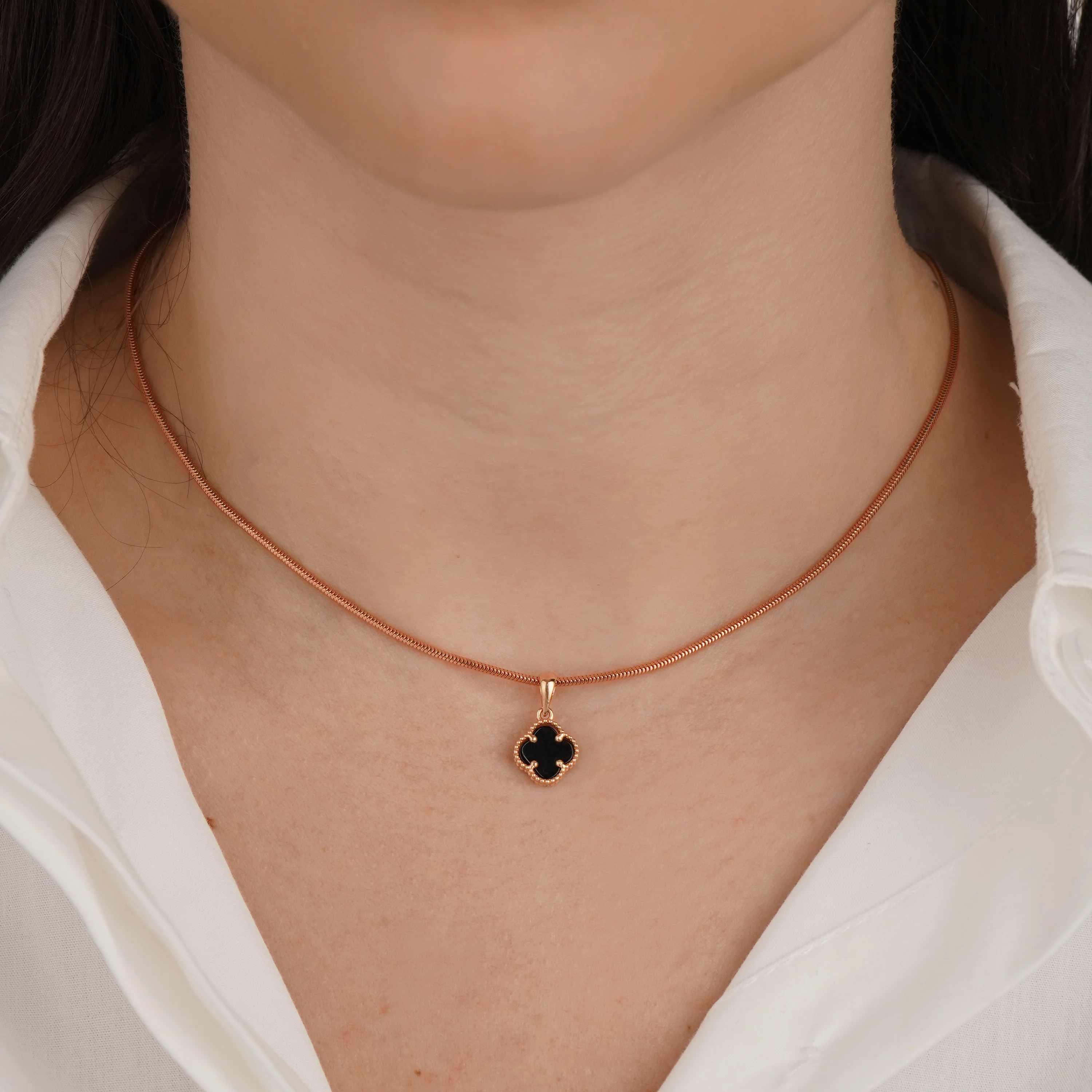 Підвіс у червоному золоті «Конюшина» з оніксом — вишукана ювелірна прикраса, яка ідеально впишеться у вечірній fashion-образ і додасть елегантної розкоші. Цей виріб у стилі Ван Кліф, його можна носити як соло, так і в ансамблі із сережками з таким же оформленням. Виконано підвіс із золота 585 проби. Насичений червоний відтінок дорогоцінного металу надає мідь (9,5%), додана в лігатуру його сплаву. Основа ювелірного виробу виконана у формі чотирилистої конюшини та прикрашена темним оніксом із фантазійним огранюванням.