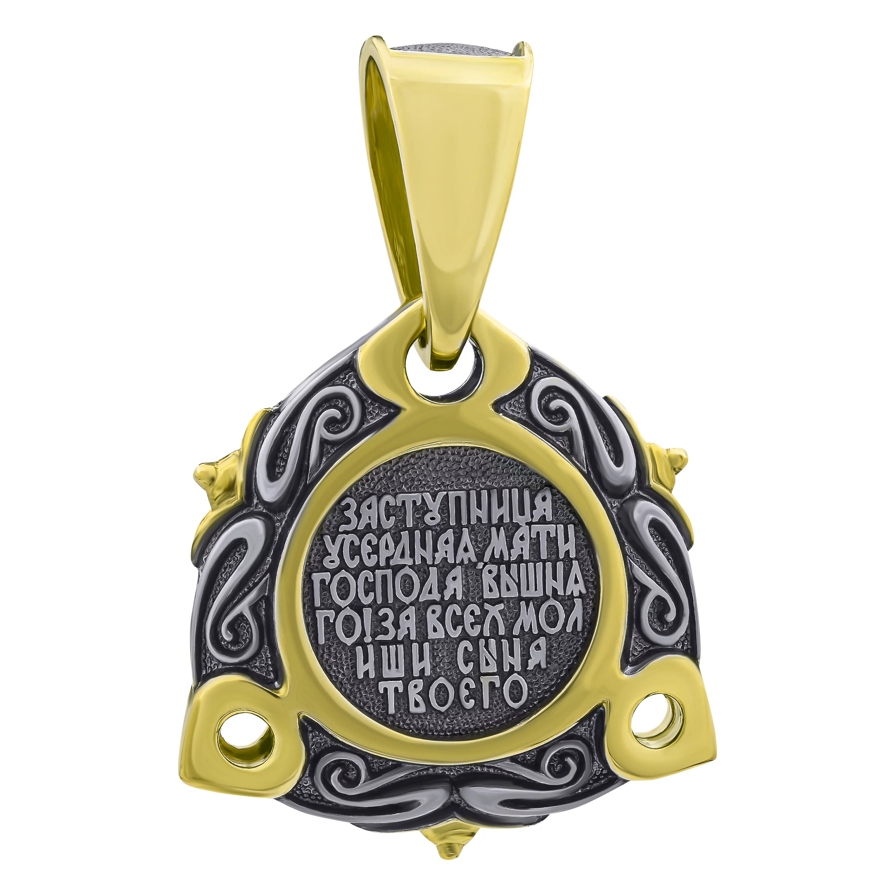 Срібна ладанка Богородиця Казанська з символічним текстом на зворотному боці. Виготовлена зі срібла 925 проби, що має високу стійкість, завдяки чому підходить для постійного носіння. Виріб декорований чорнінням і позолотою. Тендітні візерунки і витончена форма роблять прикрасу не просто оберегом, а й естетичним, привабливим виробом. Гарний подарунок на хрещення або народження дитини, також буде прекрасним презентом для дорослої релігійної людини. Можна носити на ланцюжку або шнурку разом із натільним хрестиком.