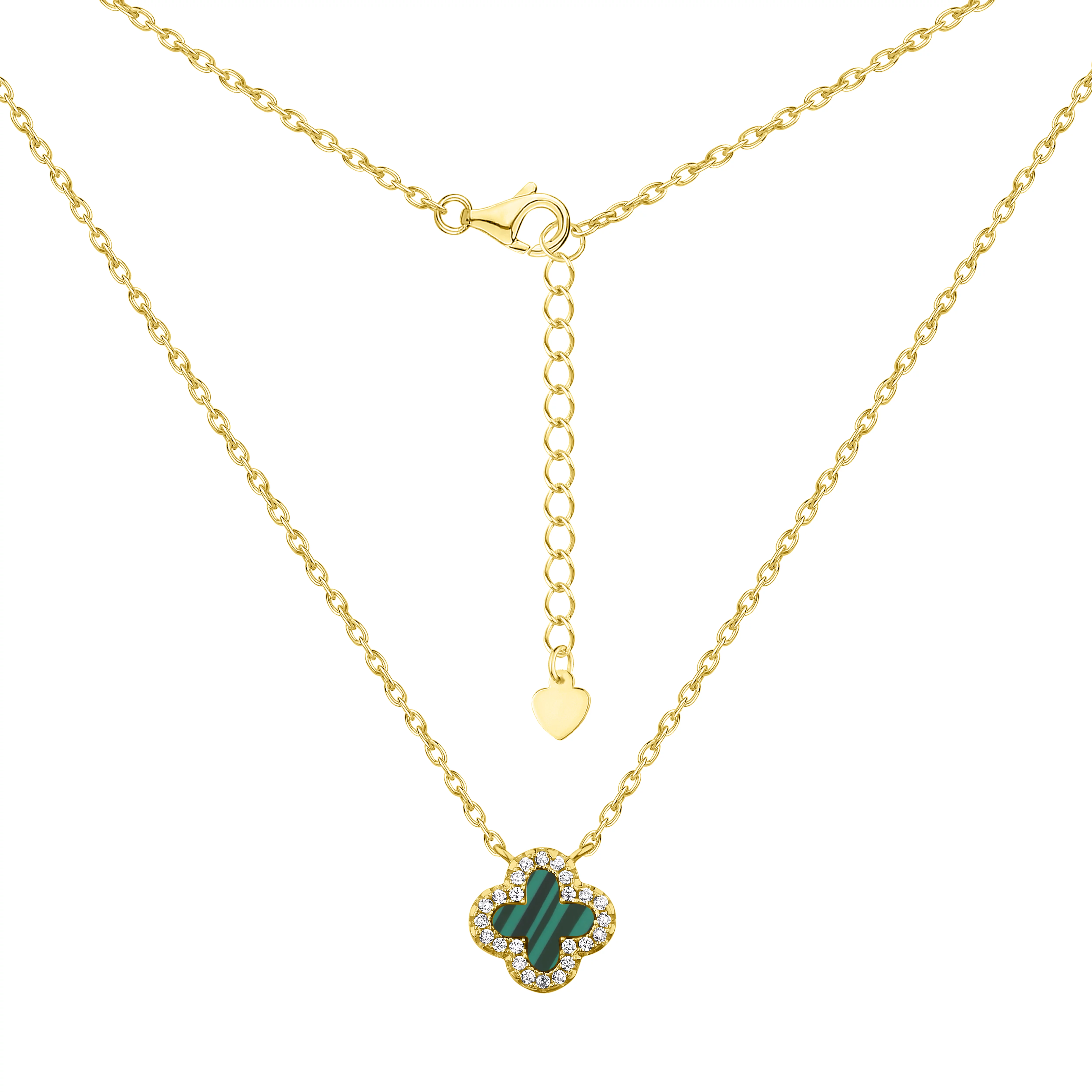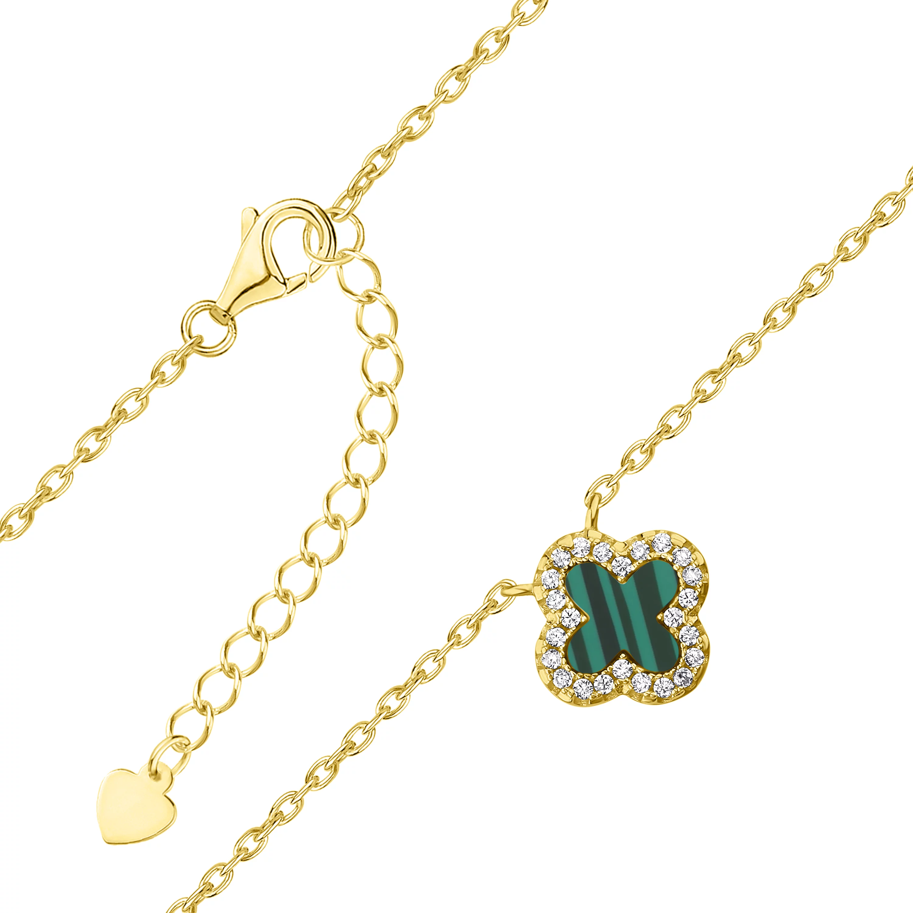 Стильне кольє з підвісом зі срібла у формі конюшини з якірним плетінням з малахітом та фіанітами - 1935096