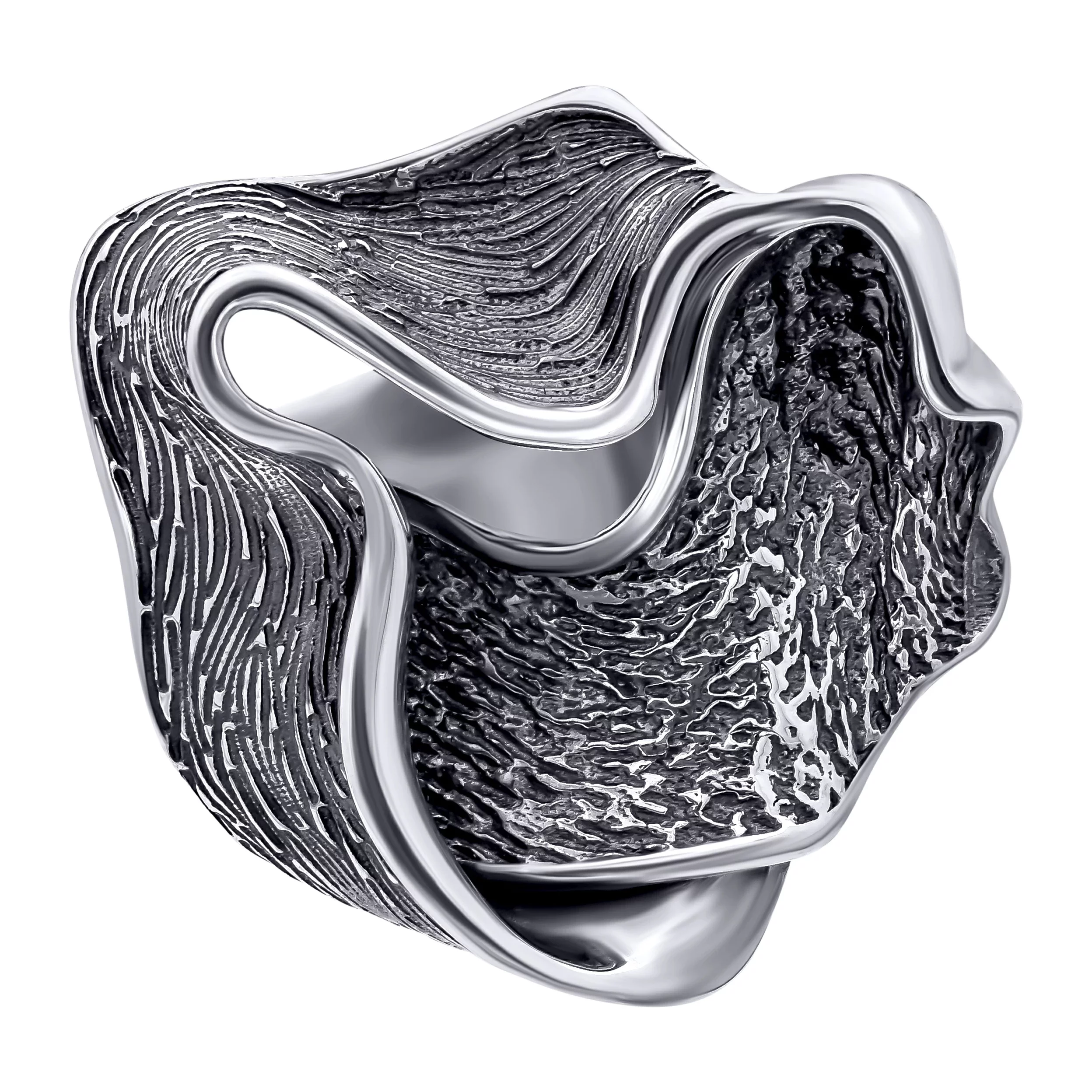 Жіноча каблучка з чорнінням вирізняється ексклюзивним зовнішнім виглядом. Виготовлений виріб зі срібла проби 925. Обідок каблучки вирізняється яскравим білим кольором. Покриття прикраси чорнінням, що складається з сульфідів міді, срібла та сірки, додає їй відтінку антикварності. Декором слугує абстракція, яку створюють срібні стрічки, які хаотично переплітаються. Їхня поверхня вкрита тонкими смугами, заглиблення між якими затемнені. Жіноча каблучка має цікавий вигляд на пальці, доповнить образ у стилях гранж, кежуал. Буде стильним подарунком до свята.