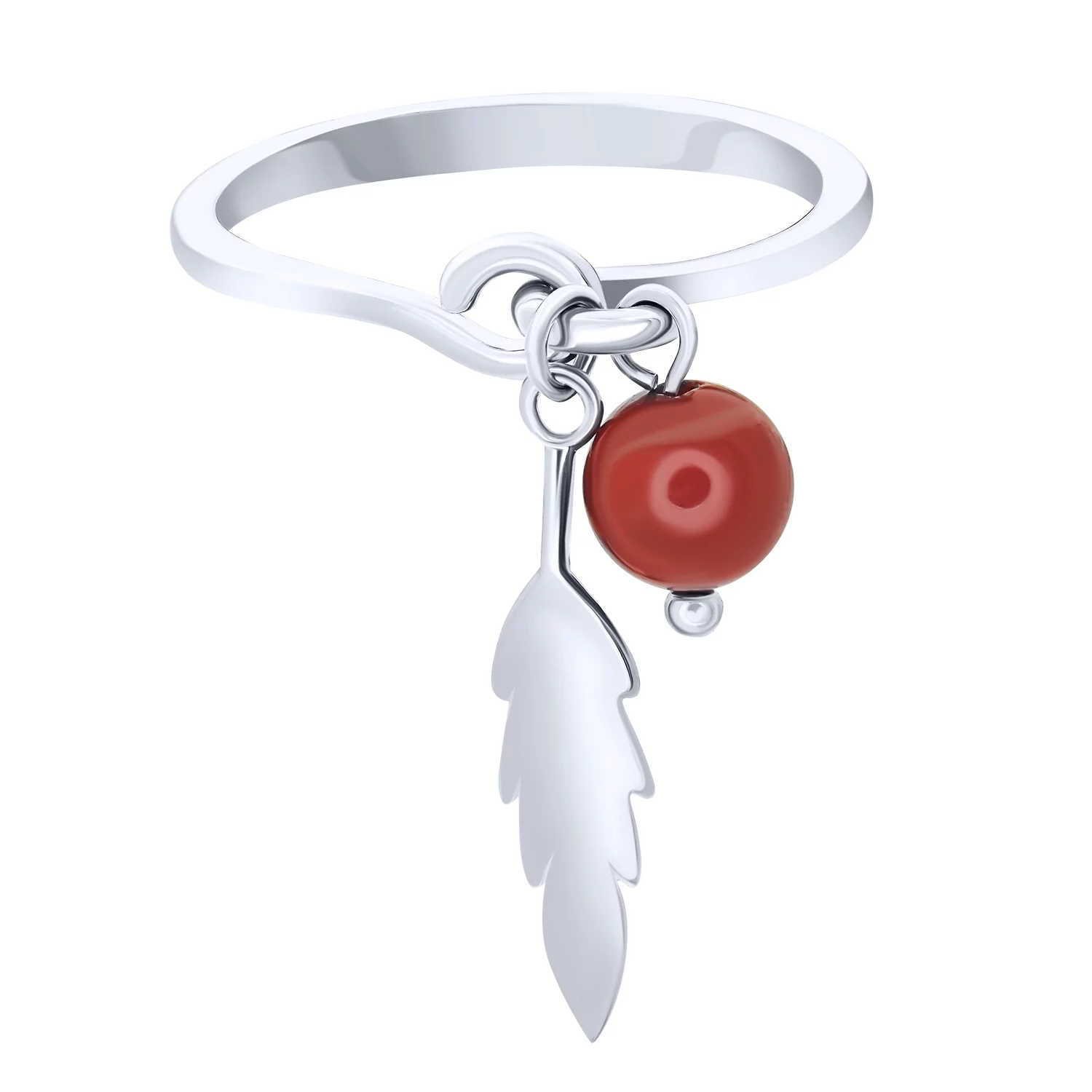 Срібна каблучка з підвісним коралом і листочком - 1742852