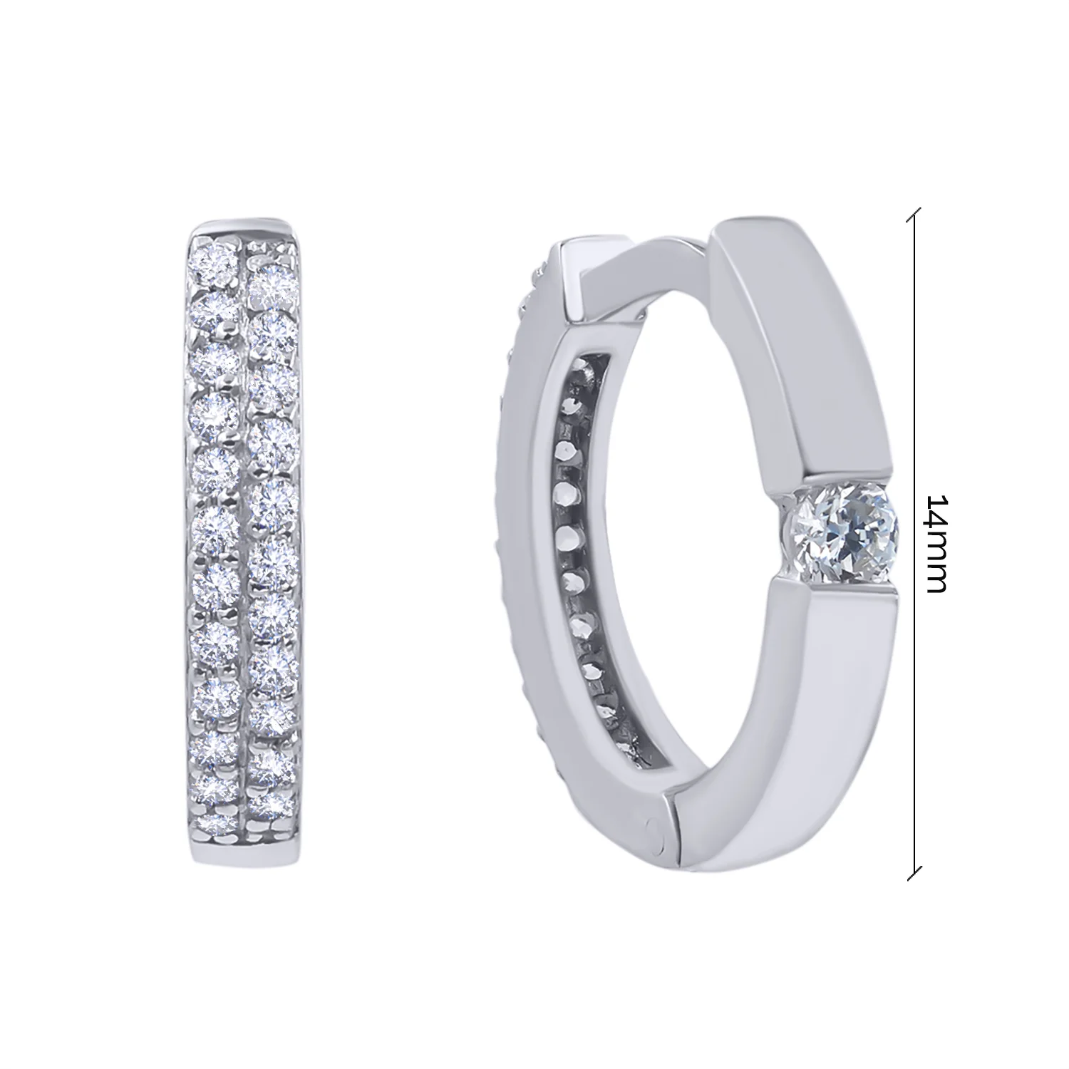 Сережки-кільця зі срібла 925 проби — безпрограшний варіант для різних заходів. Покриття родієм захищає дорогоцінний метал від почорніння та посилює блиск. Поверхня однієї сторони усіяна доріжкою з безлічі фіанітів круглого огранювання у два ряди. У протилежній частині також розміщений один більший ювелірний камінь. Його діаметр відповідає ширині виробу. Кінці зафіксовано замком Конго. Таке кріплення практично не видно — створюється ефект цілісного кільця. Ця універсальна прикраса пасуватиме для будь-якого гардероба.