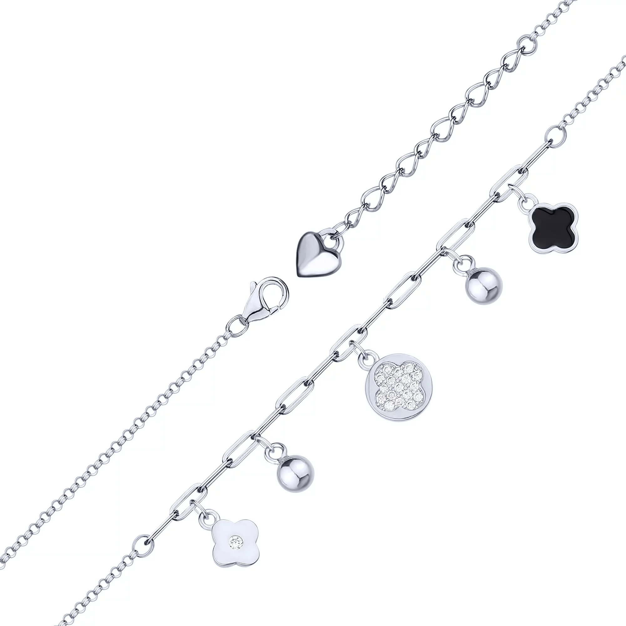 Елегантний срібний браслет з підвісами "Серце" з емаллю та фіанітами з комбінованим плетінням - 1961752