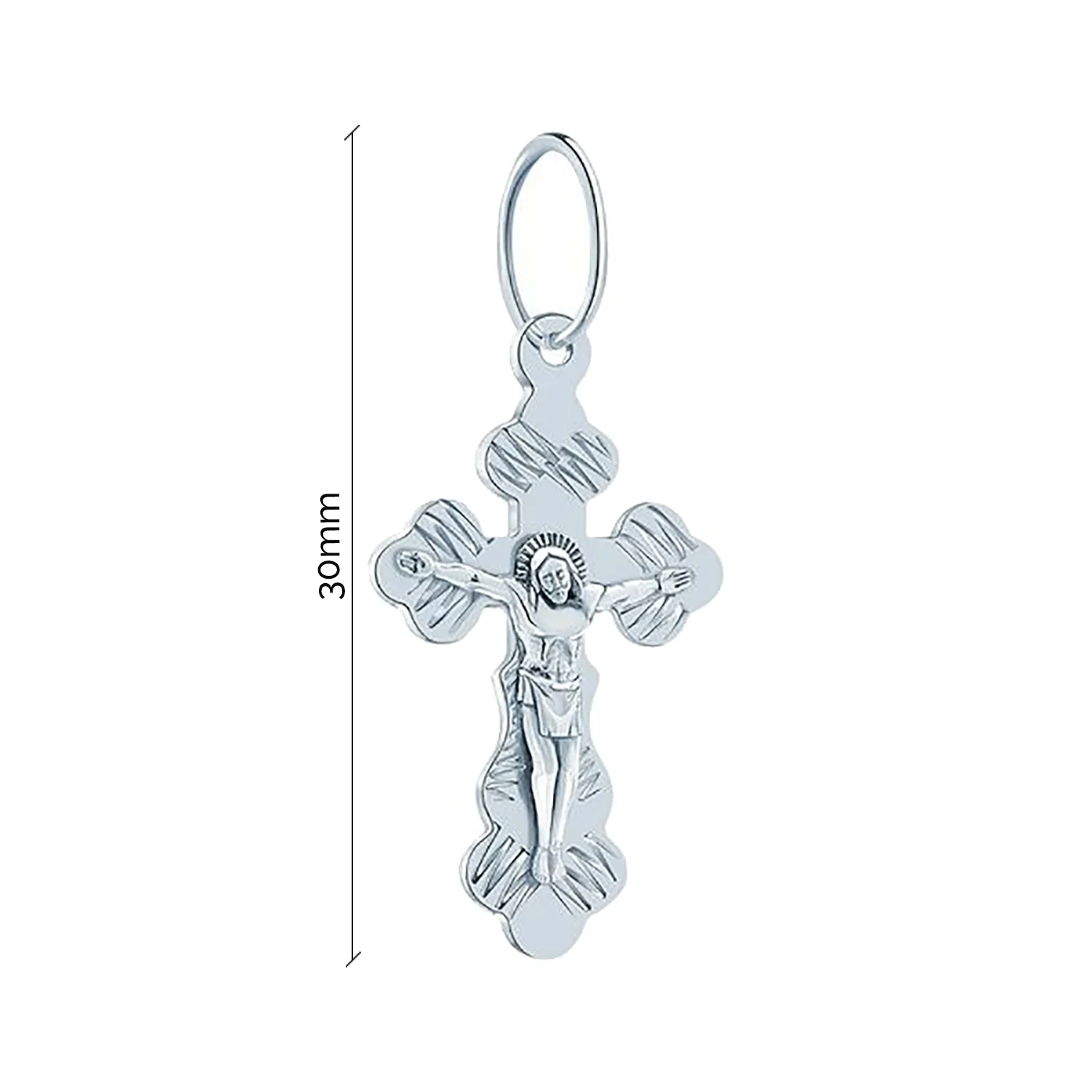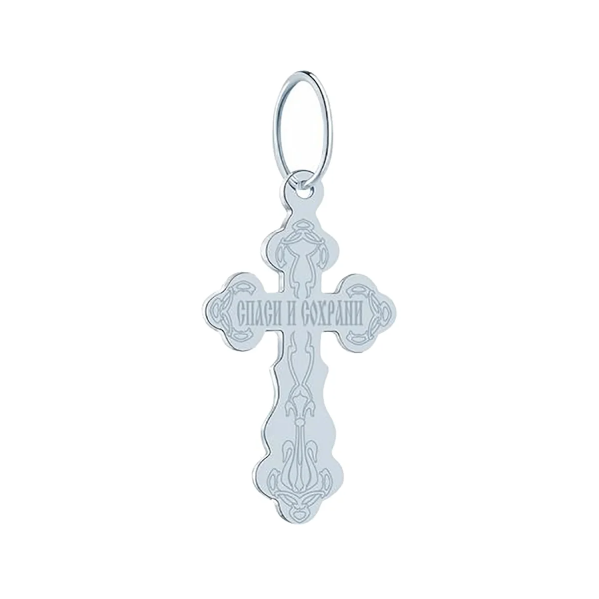 Срібний натільний хрестик – універсальний вибір прикраси-оберега для носіння кожен день і створення більш святкових образів. Благородство металу і завжди доречний білий блиск поєднуються з будь-якими іншими аксесуарами. Якісне срібло 925 проби зберігає своє сяйво, не окислюється і відмінно носиться протягом років. Гладкість фону в дизайні доповнюється акцентними штрихами та об'ємним розп'яттям. Плавність форм і ліній привносить виробу м'якості та витонченості. На тильній стороні хрестика розміщено сакральний напис, що надає виробу сили оберега і сакрального сенсу для власника.