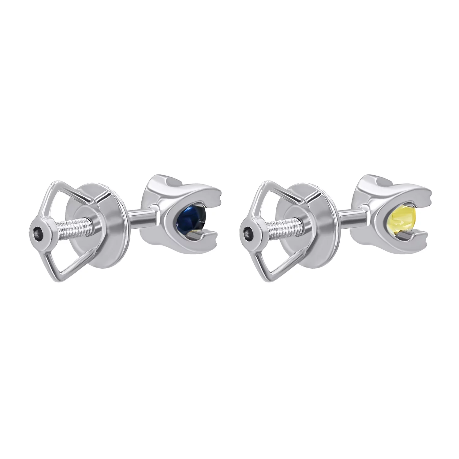 Сережки-гвоздики з розсипом діамантів та сапфіром у білому золоті - 1801644