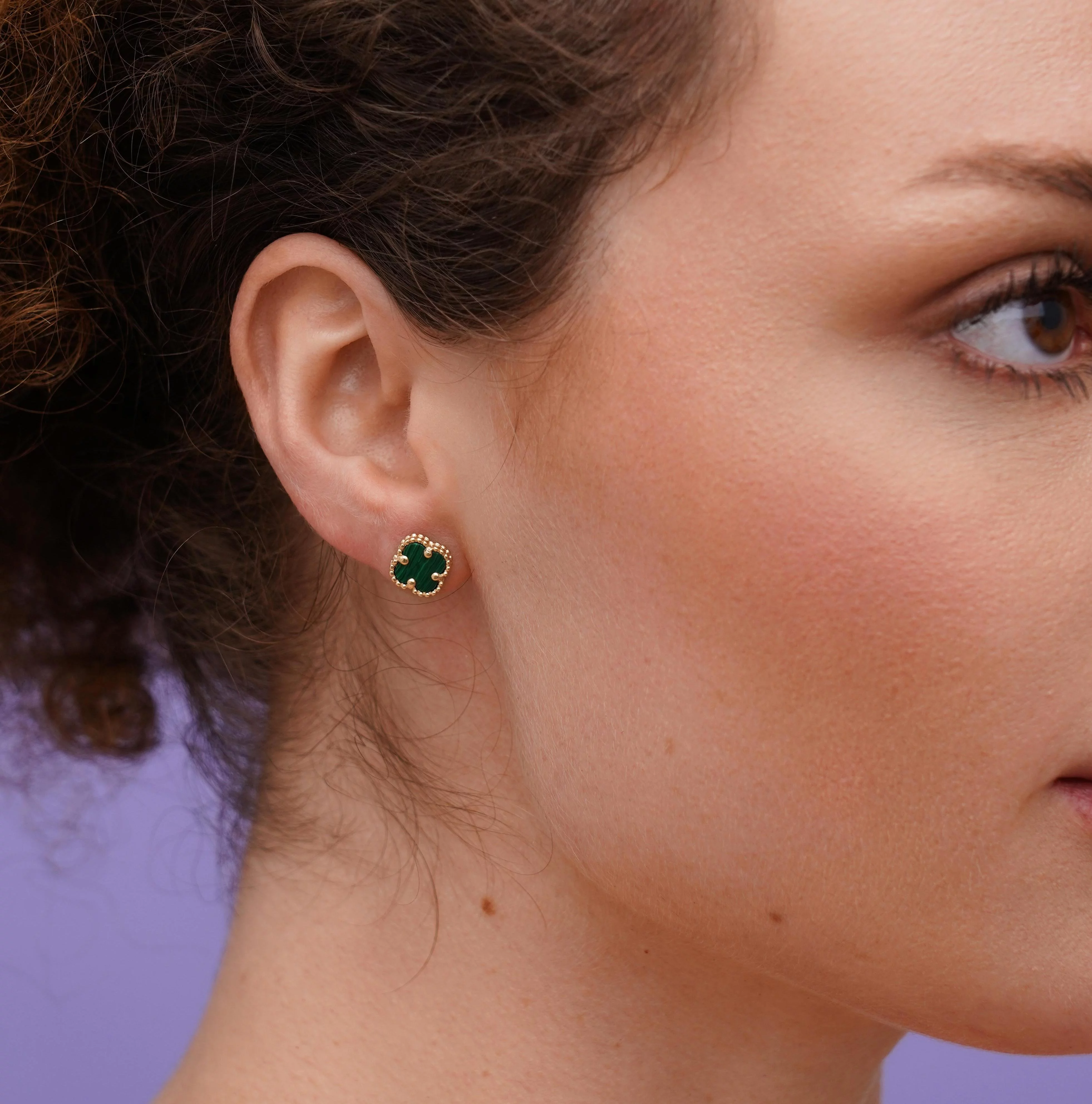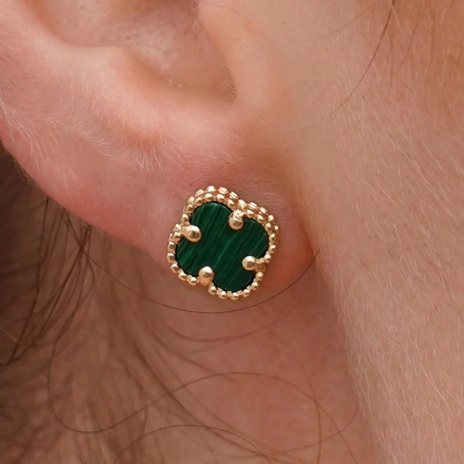 Срібні сережки-гвоздики "Конюшина" з жовтим родіюванням з малахітом та фіанітами - 1880151