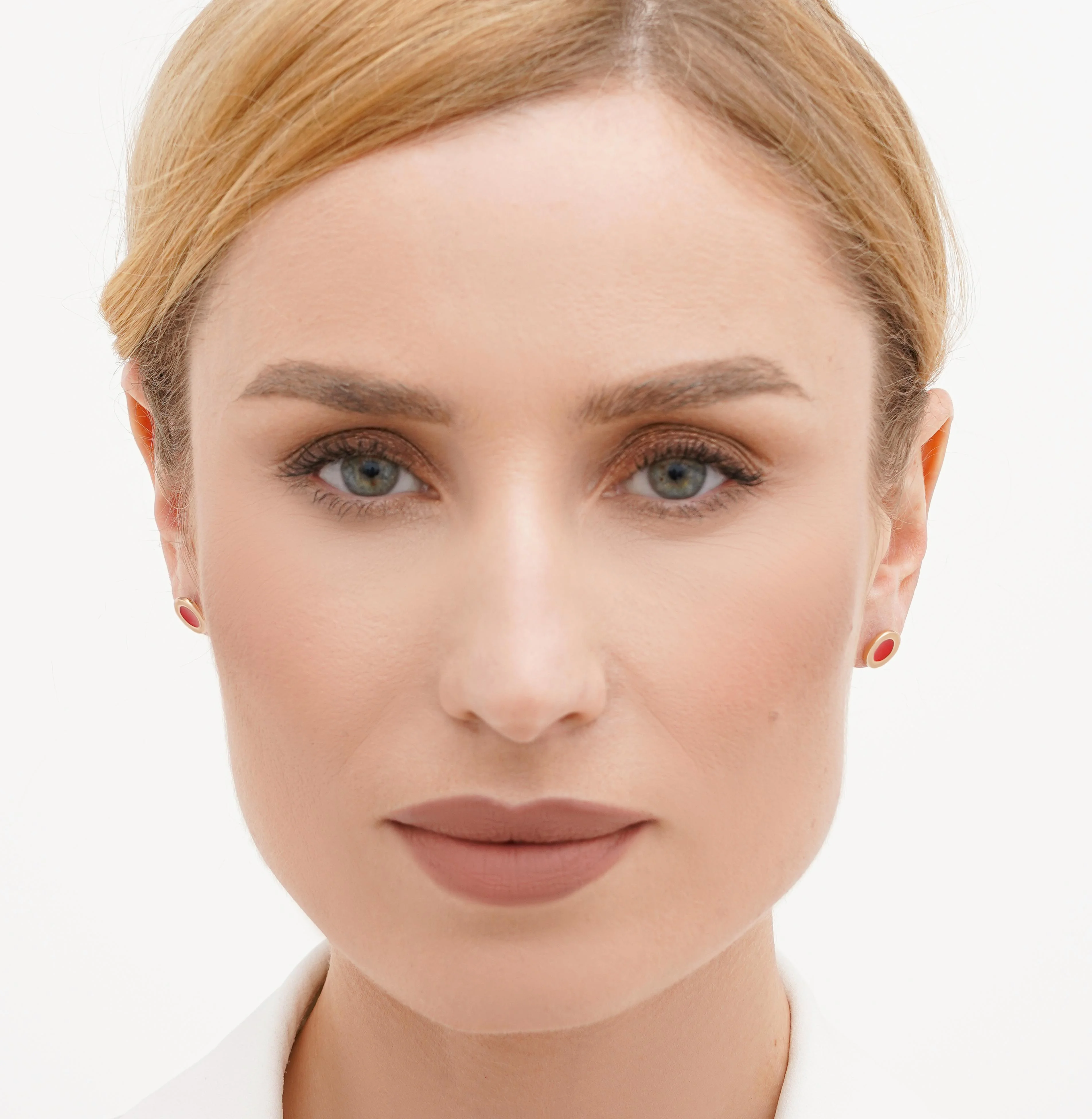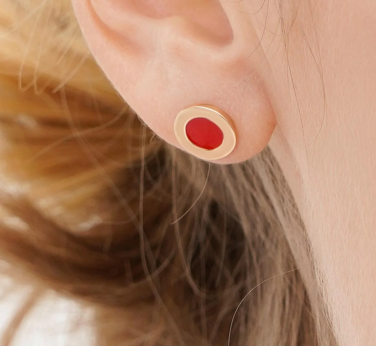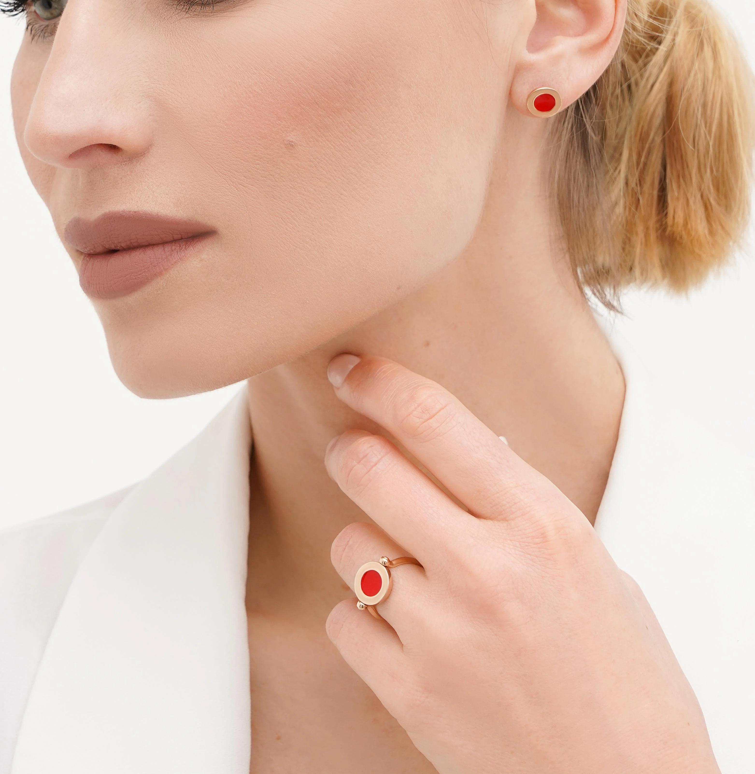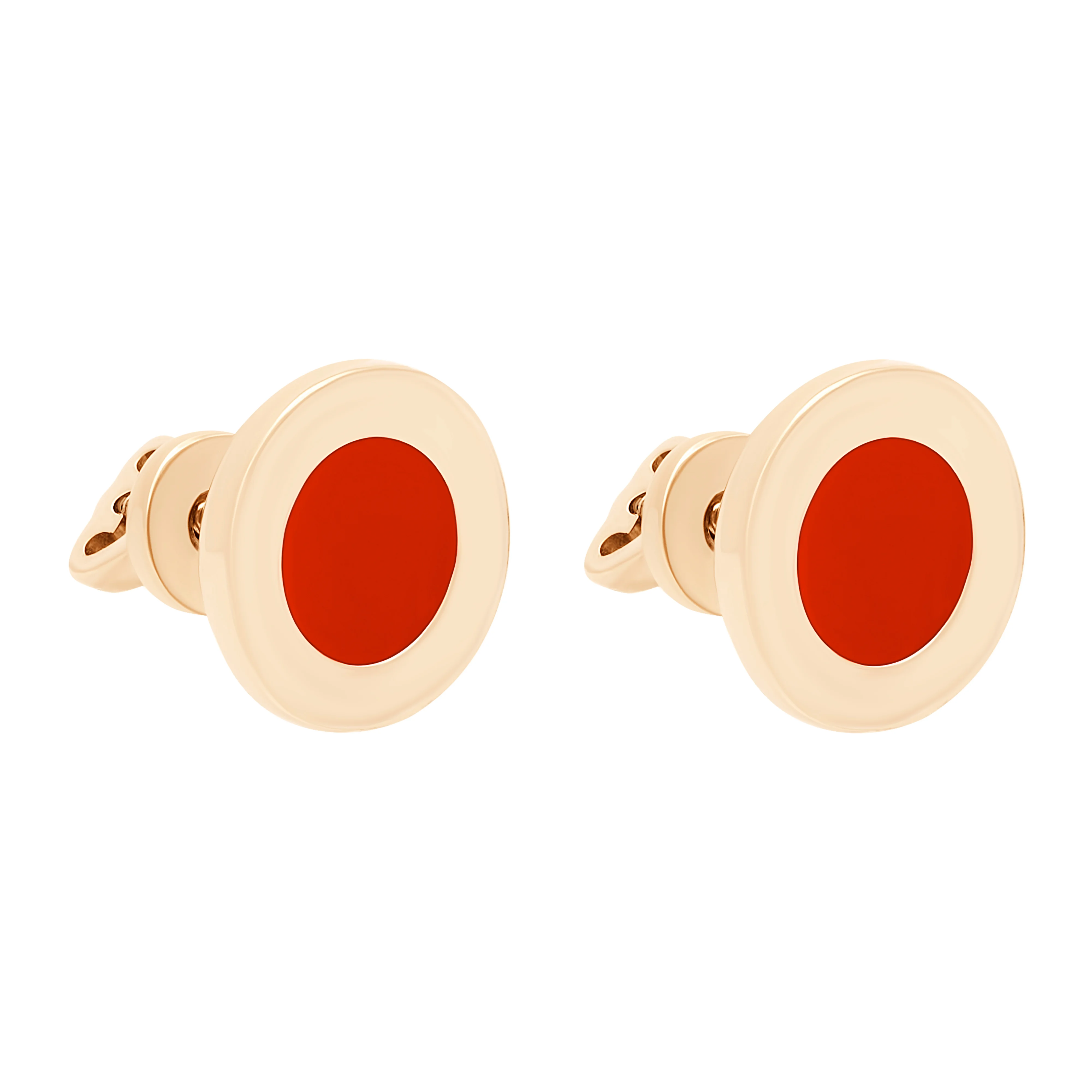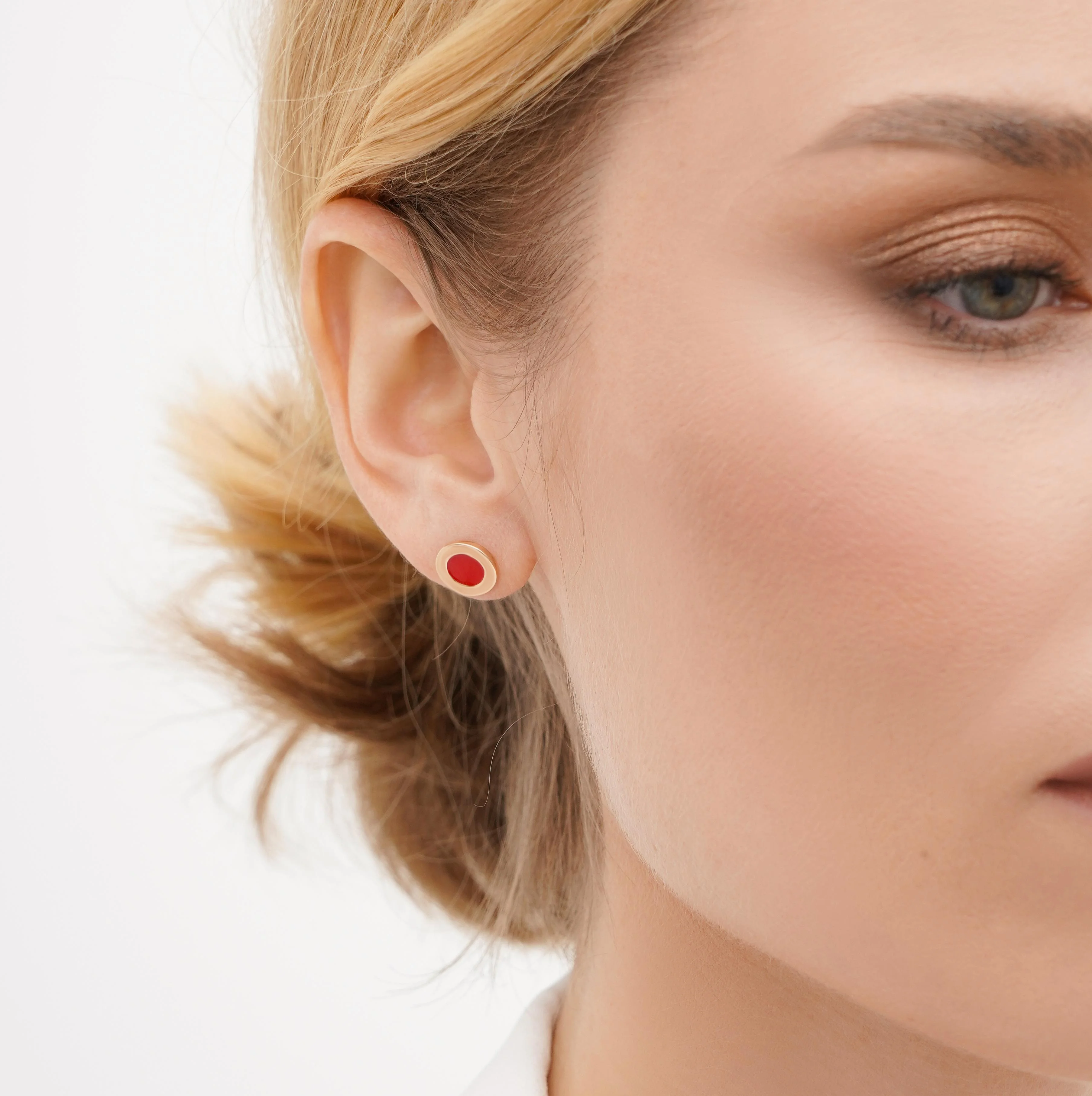 Стильні сережки-гвоздики "Флора" з червоного золота з емаллю та фіанітом - 1927691