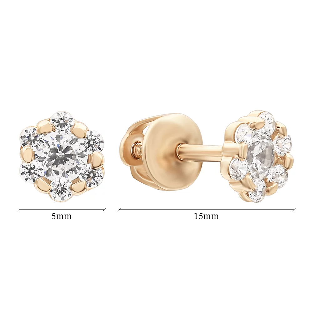 Сережки-гвоздики з червоного золота з фіанітом у вигляді квіточки - 1445201