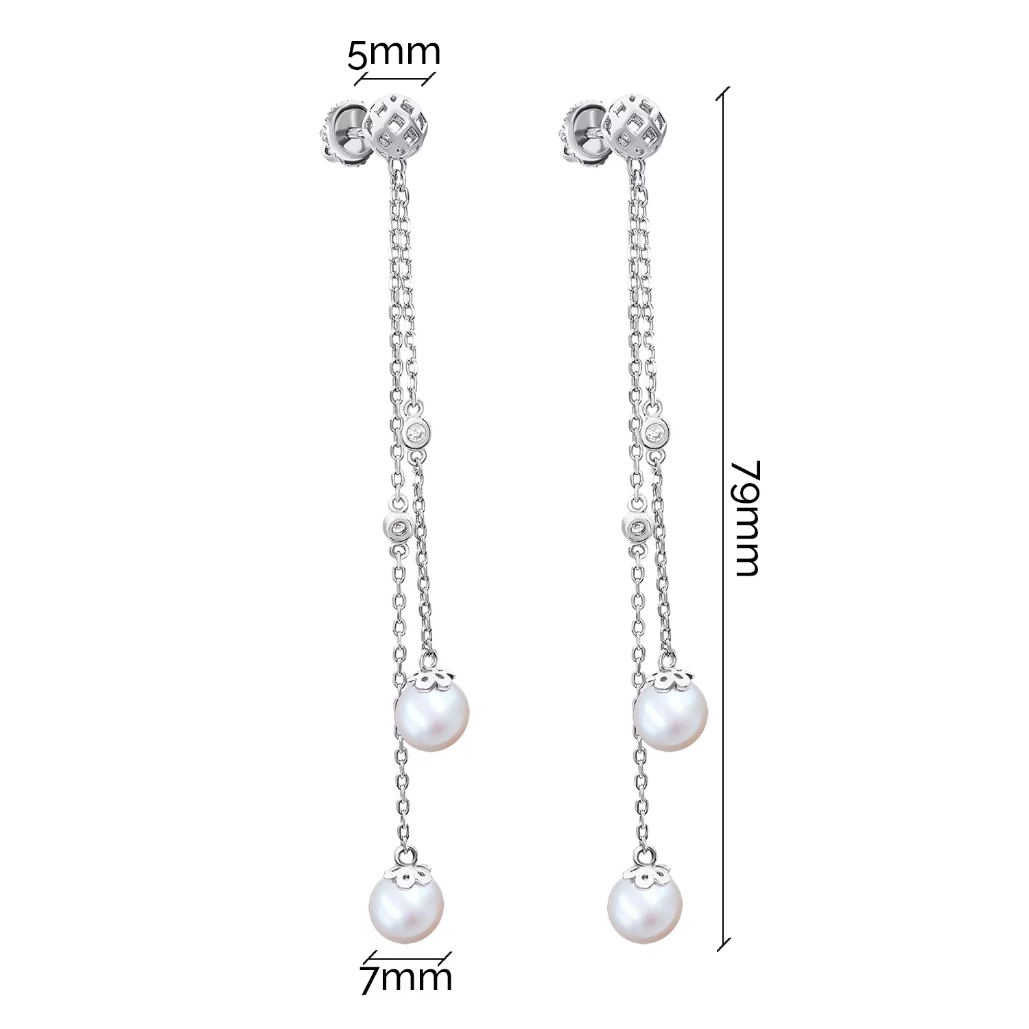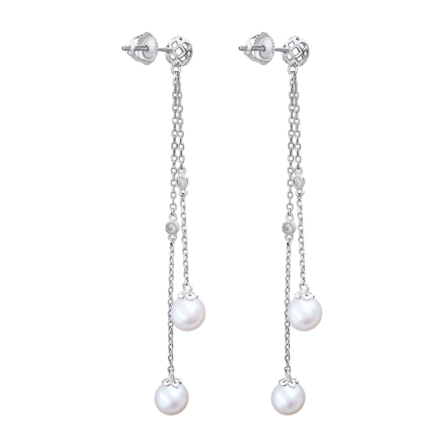 Стильні сережки з підвісами у білому золоті з перлинами та фіанітами - 1949826