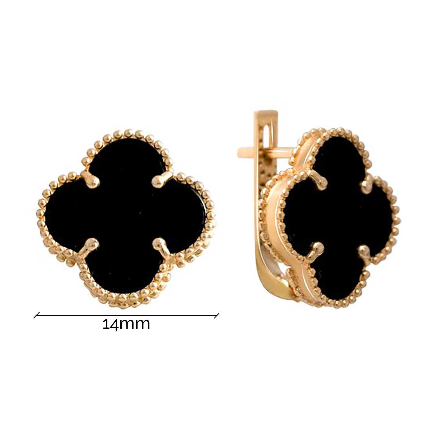 Це стильні та ефектні сережки в трендовому дизайні конюшини — візитівки французького ювелірного бренду Van Cleef & Arpels. Прикраса створена з червоного золота 585 проби з серцевиною із чорного онікса. Це напівдорогоцінний магічний камінь із легким смугастим забарвленням чорних відтінків та унікальним скляним блиском. Сережки застібаються на міцний англійський замочок, що гарантує надійне кріплення. Вони невеликі та легкі, майже невагомі на вухах. Одинаково припадуть до душі поціновувачам екстравагантних виробів та любителям делікатних прикрас.