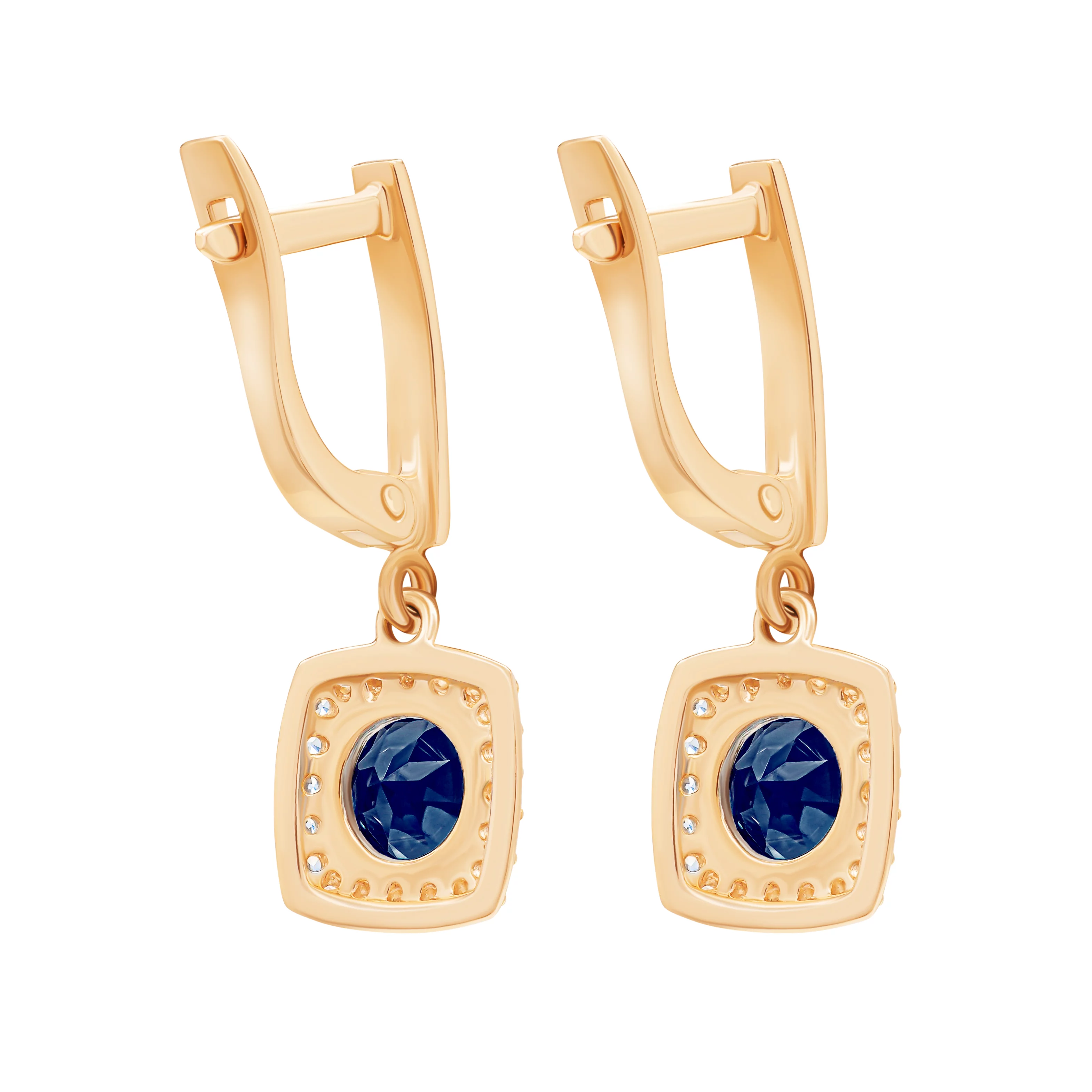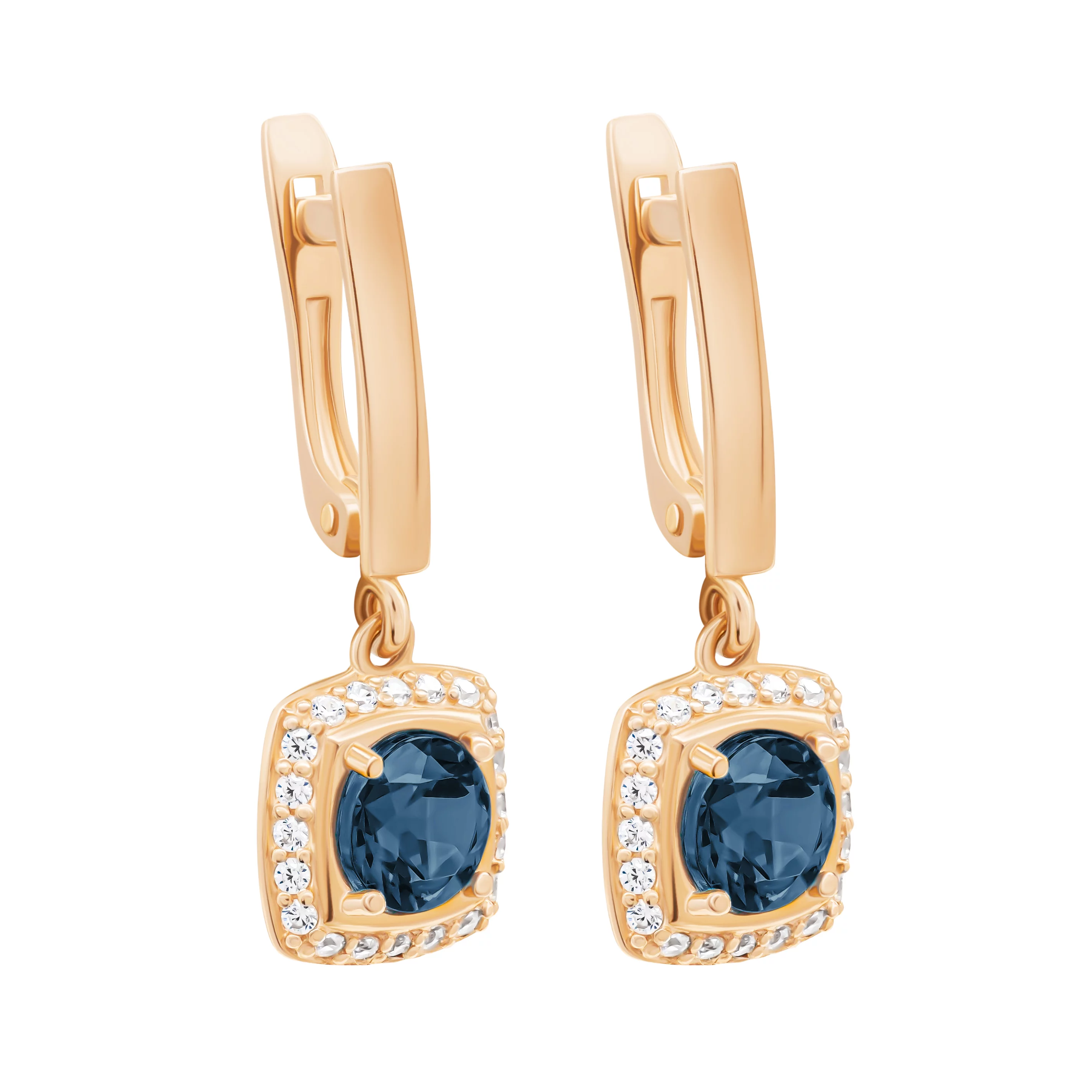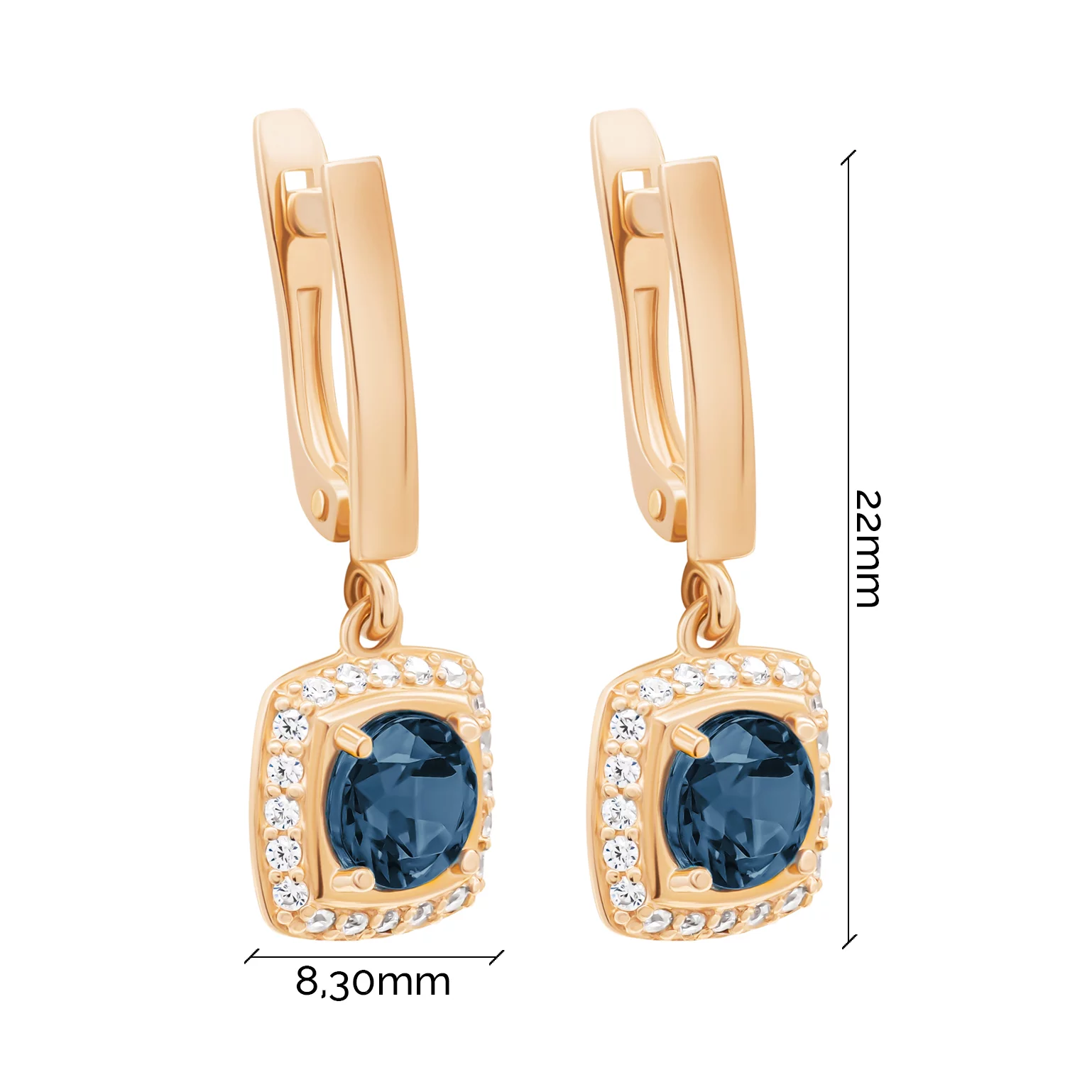 Сережки з підвісами з червоного золота з топазом лондон і фіанітами - 1919551