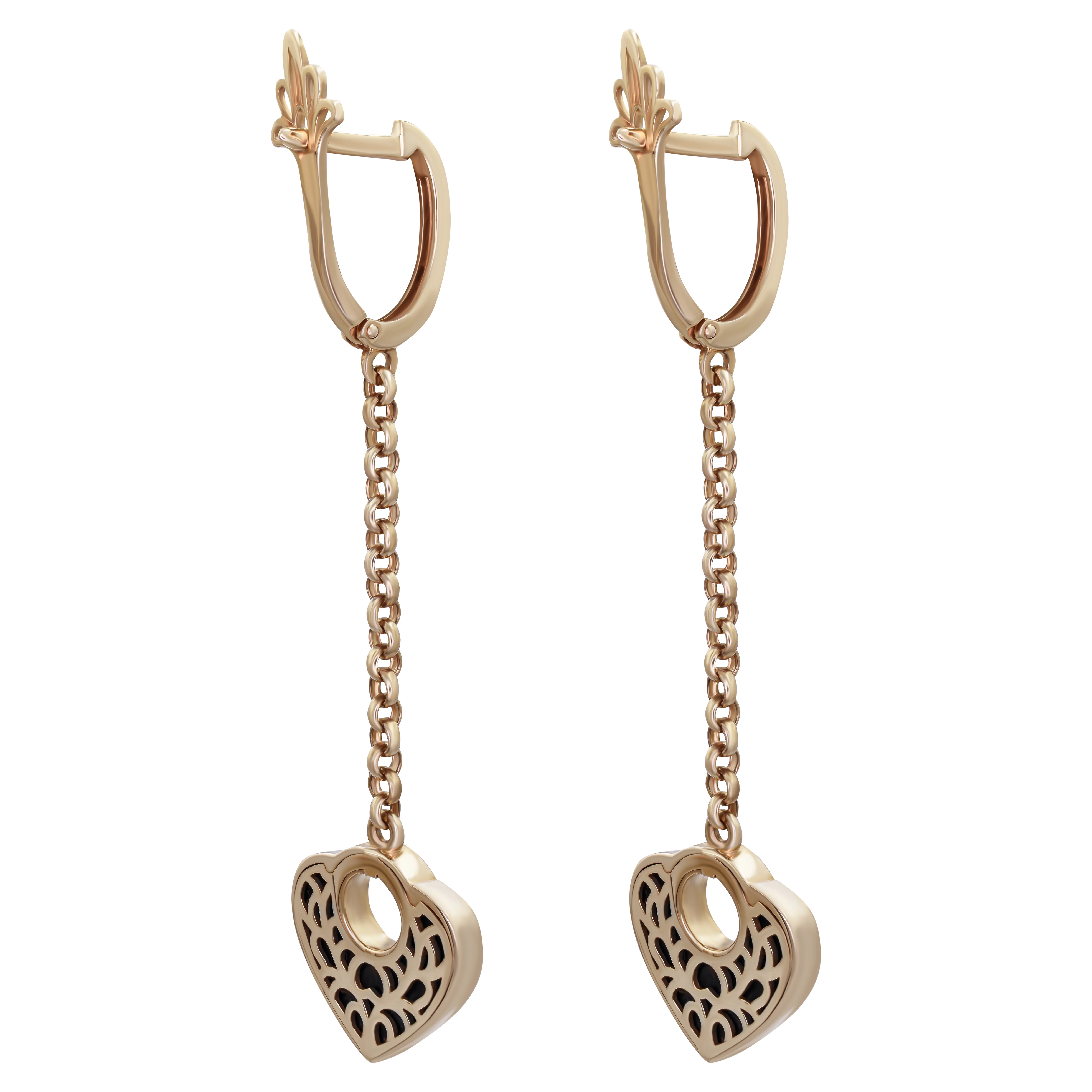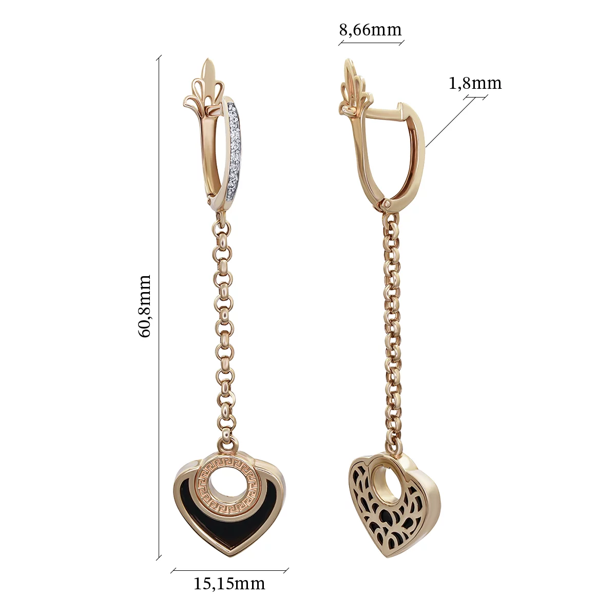 Сережки з червоного золота з підвісами фіанітом і оніксом - 379982