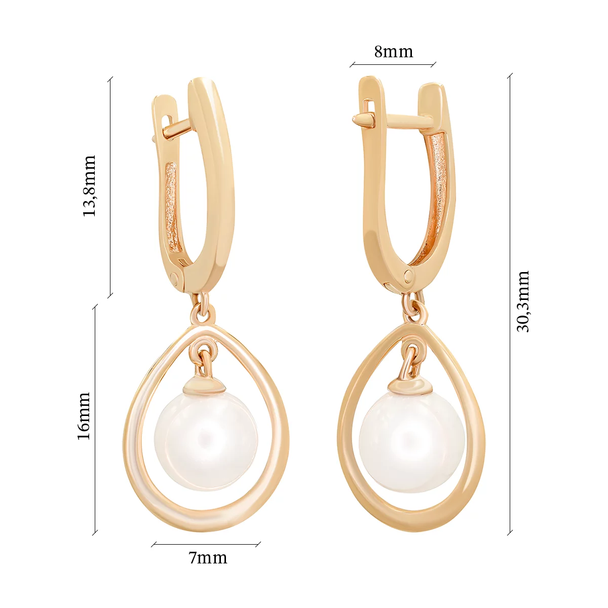 Сережки з червоного золота з підвісами з фіанітами і перлиною - 1690617