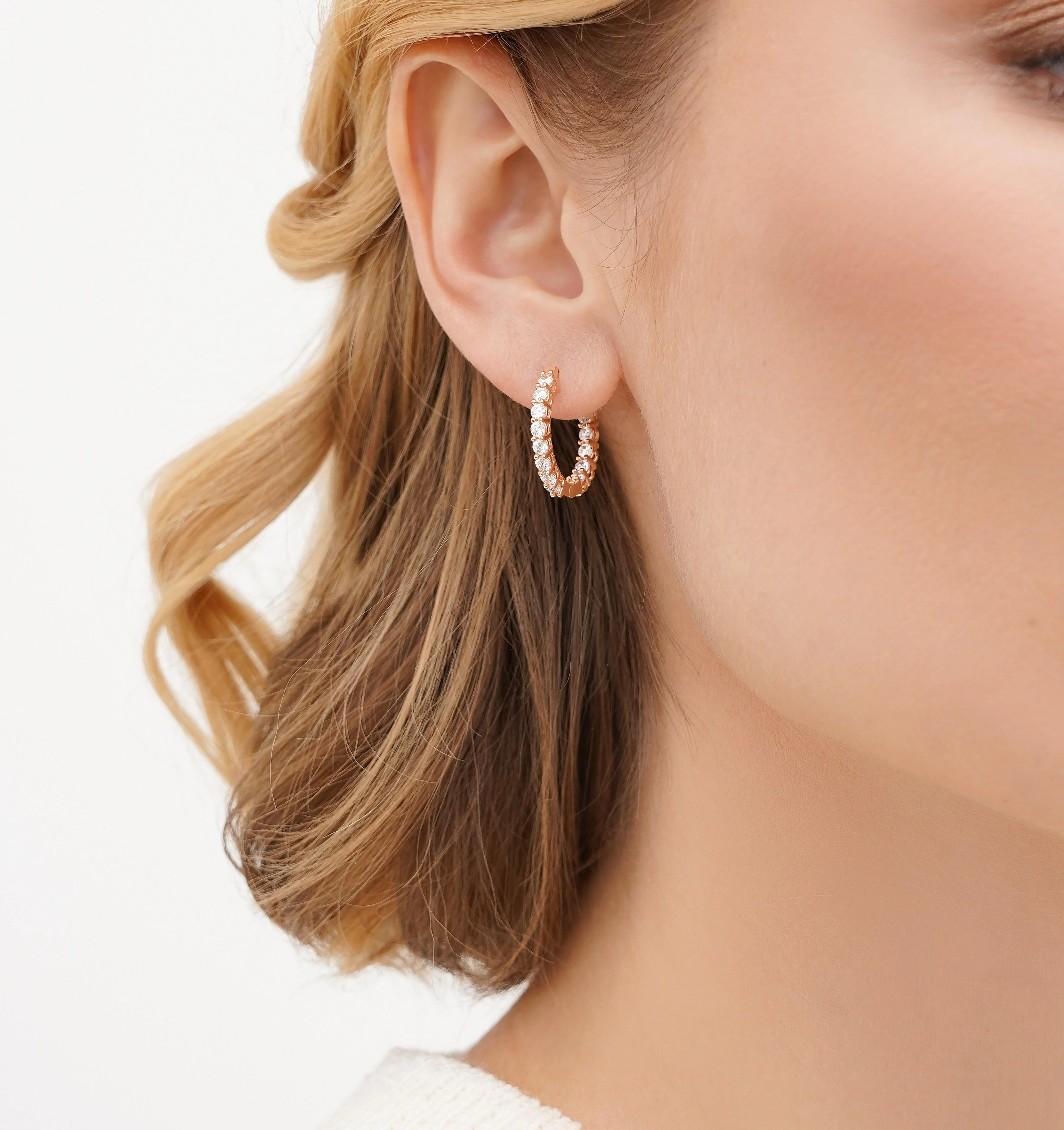 Сережки-кільця з підвісним хрестиком і фіанітами у червоному золоті - 1694131