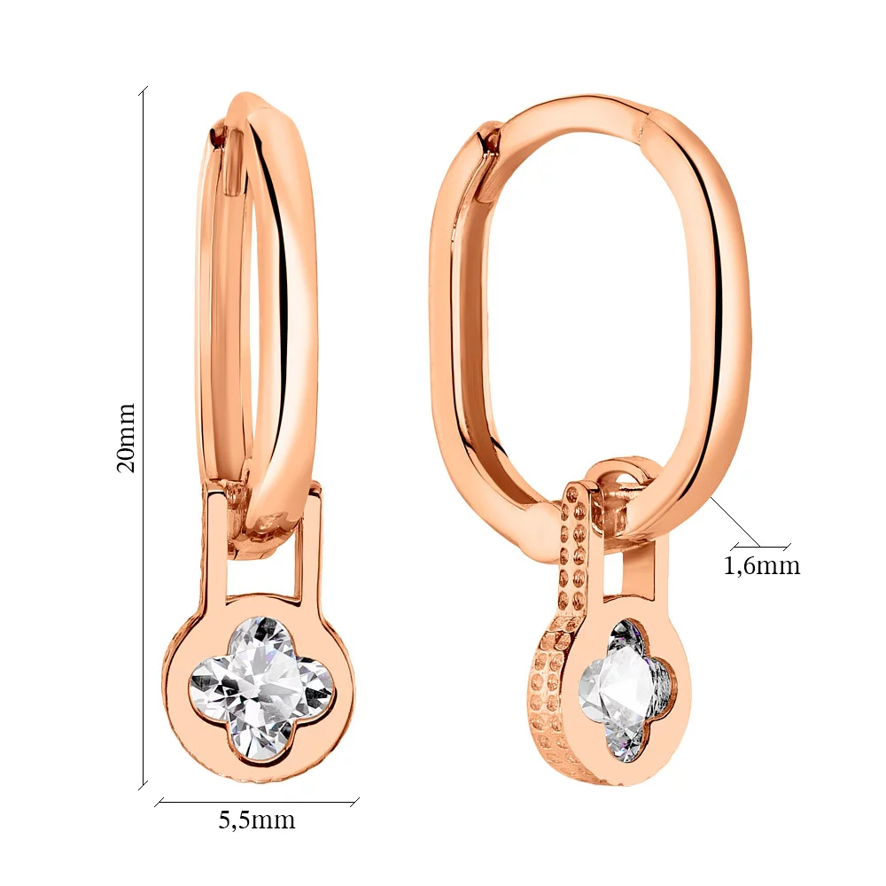 Сережки-кільця з червоного золота з фіанітами з підвісами "Конюшина" - 1499314