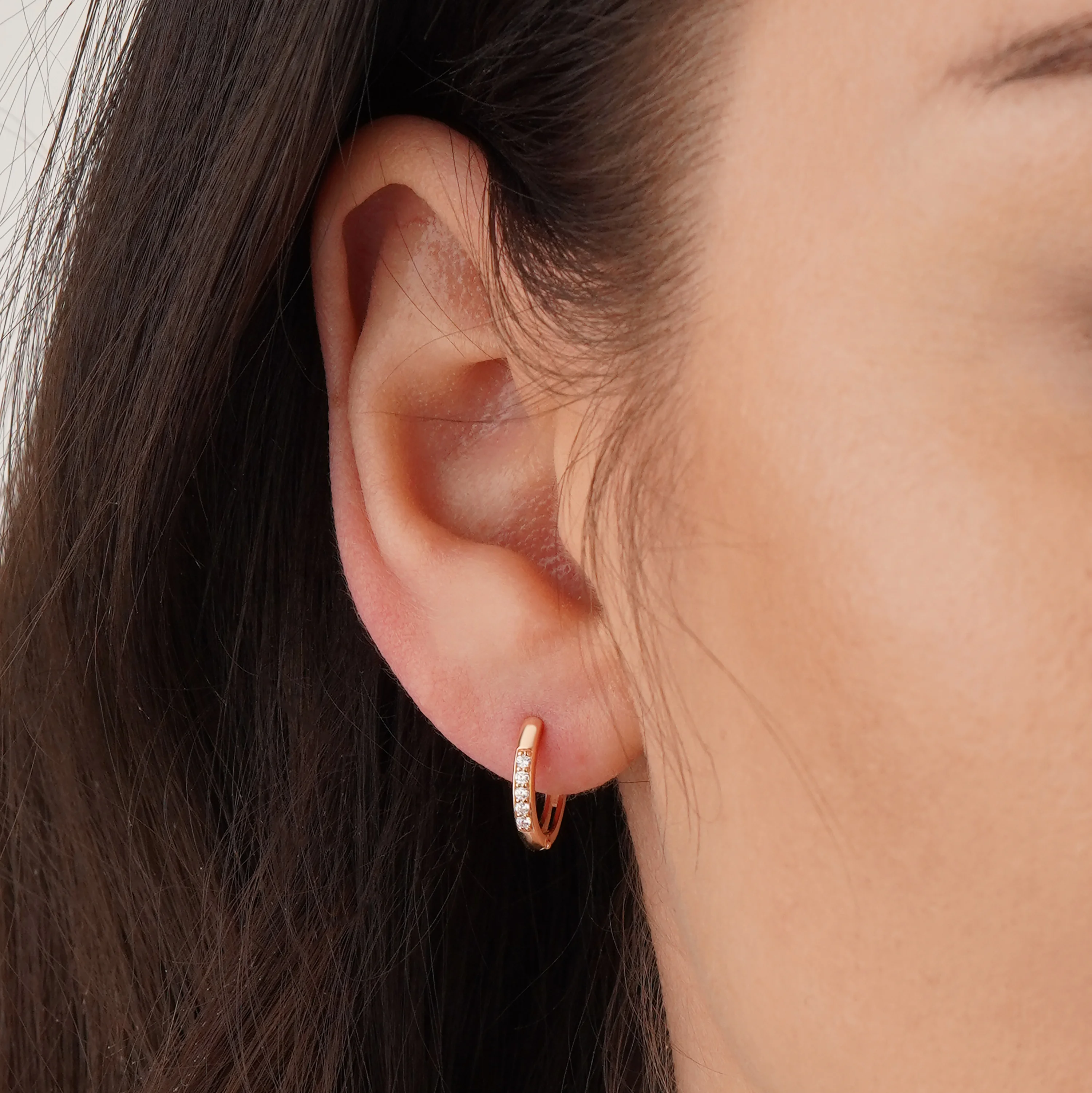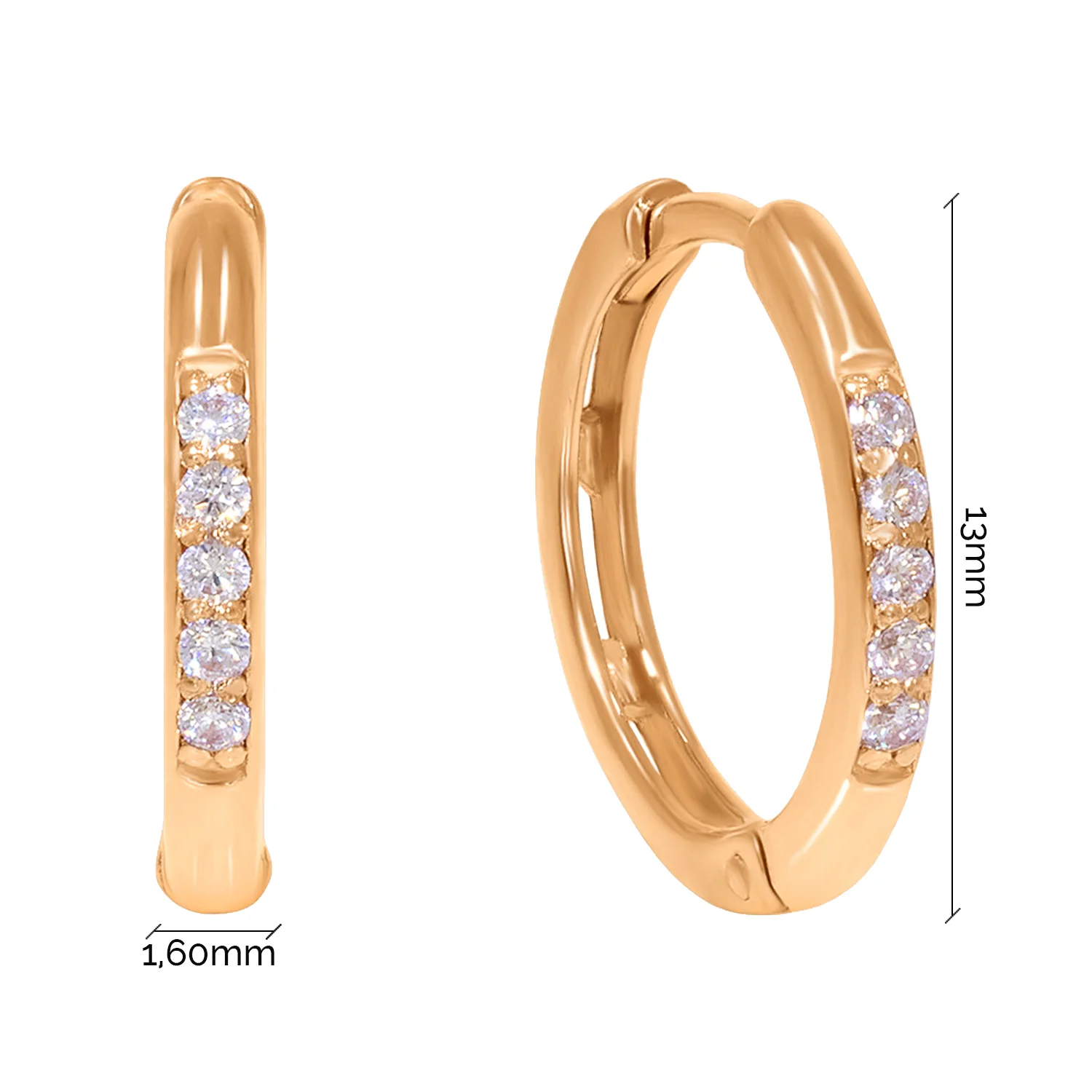 Елегантні сережки-кільця, виготовлені з червоного золота 585 проби. Яскравий відтінок виходить після додавання невеликої кількості міді. Метал надає ювелірному виробу міцності. На лицьовій стороні прикраси розташовано п'ять невеликих цирконіїв. Під ними знаходиться поглиблення, кожен камінь посаджений у спеціальний отвір та додатково фіксується стовпчиками (корнерами). Огранювання круглого типу, фасети красиво відбивають сонячне світло. У вусі сережки тримаються за допомогою застібки-кільця. Тонкий, короткий штифт, який продівається в мочку, ховається у виробі.