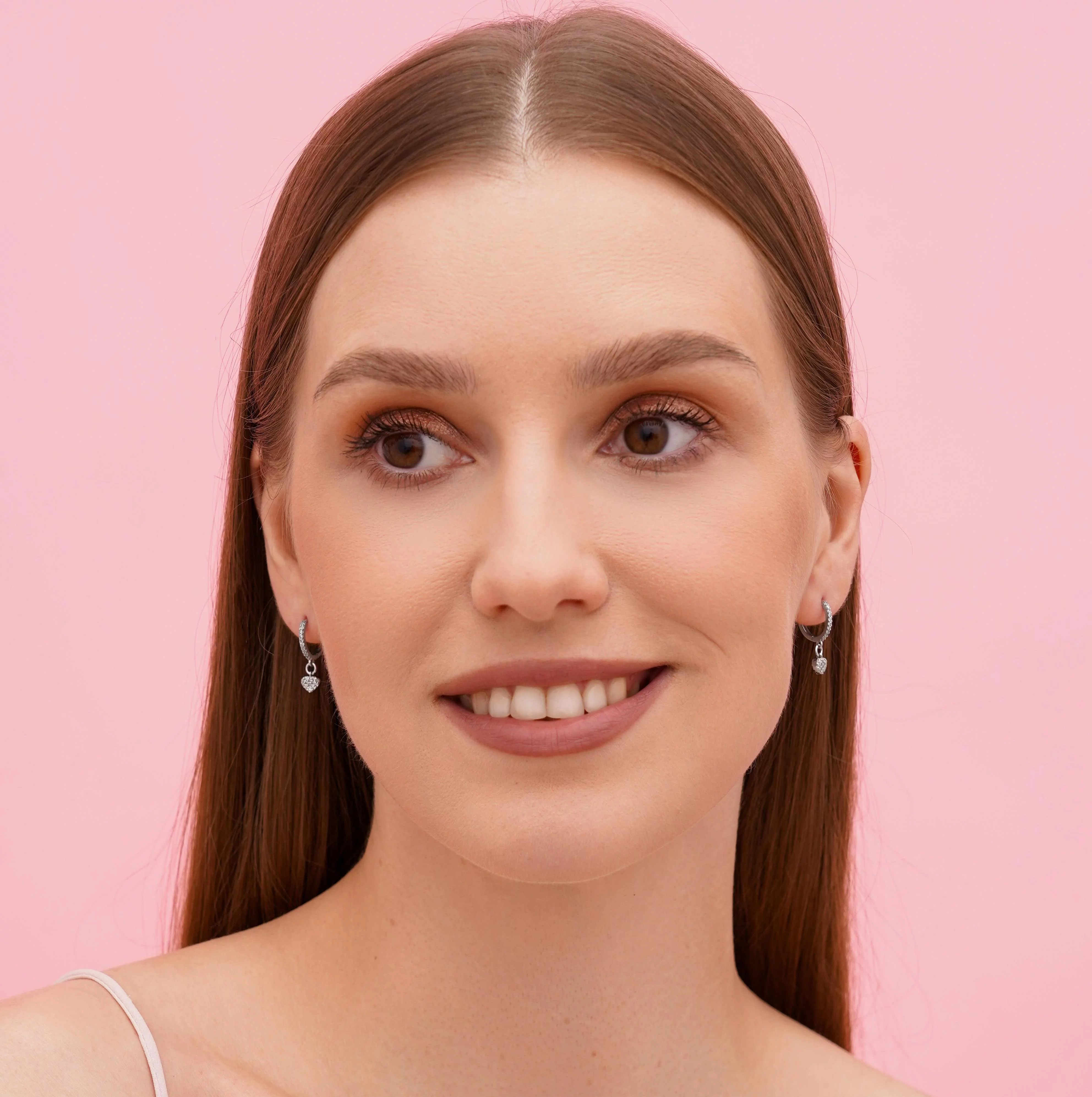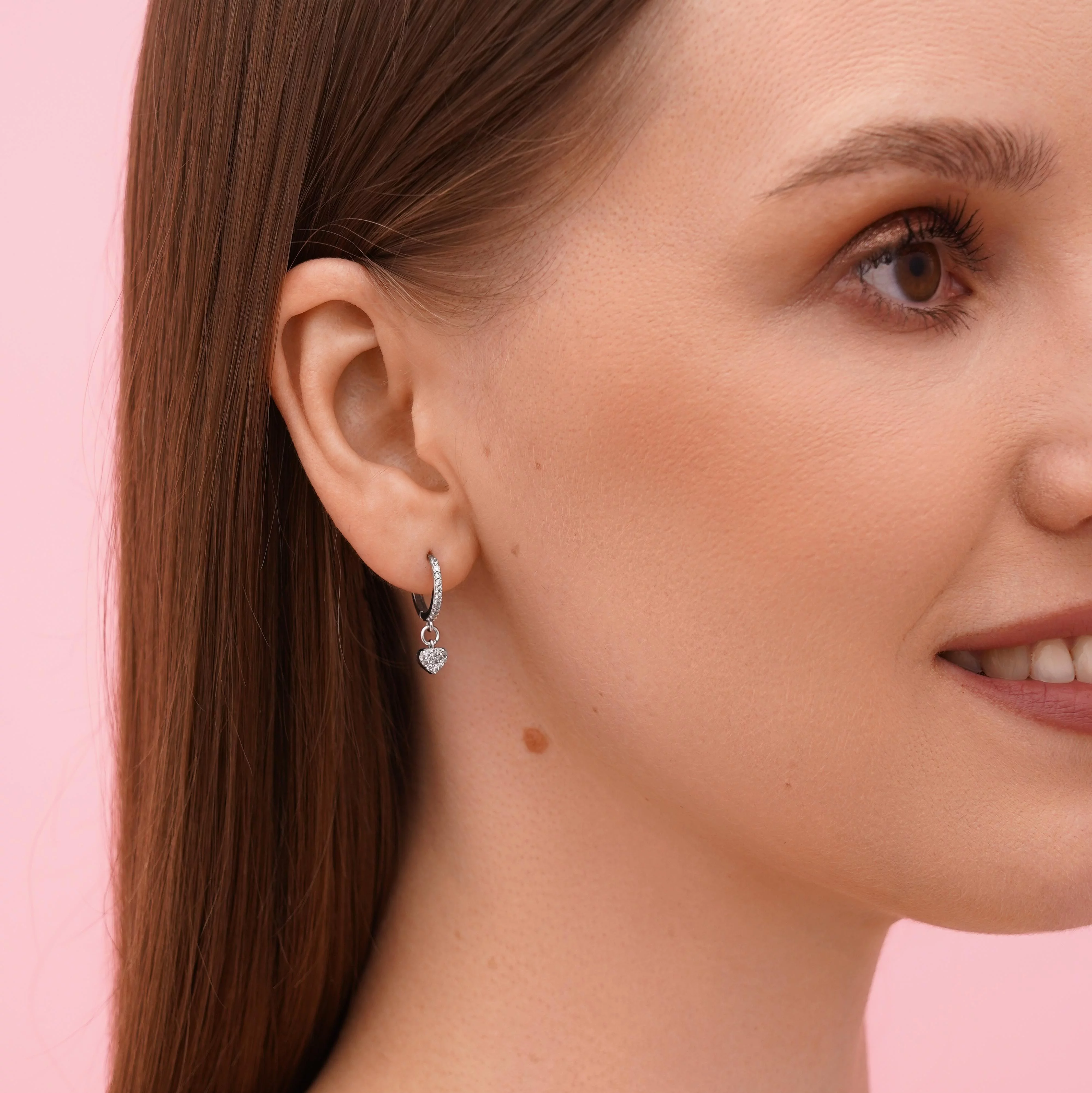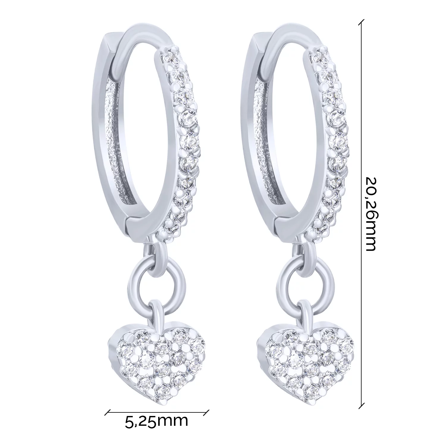 Срібні сережки-кільця з підвіскою "Сердечко" з емаллю та фіанітами - 1683297