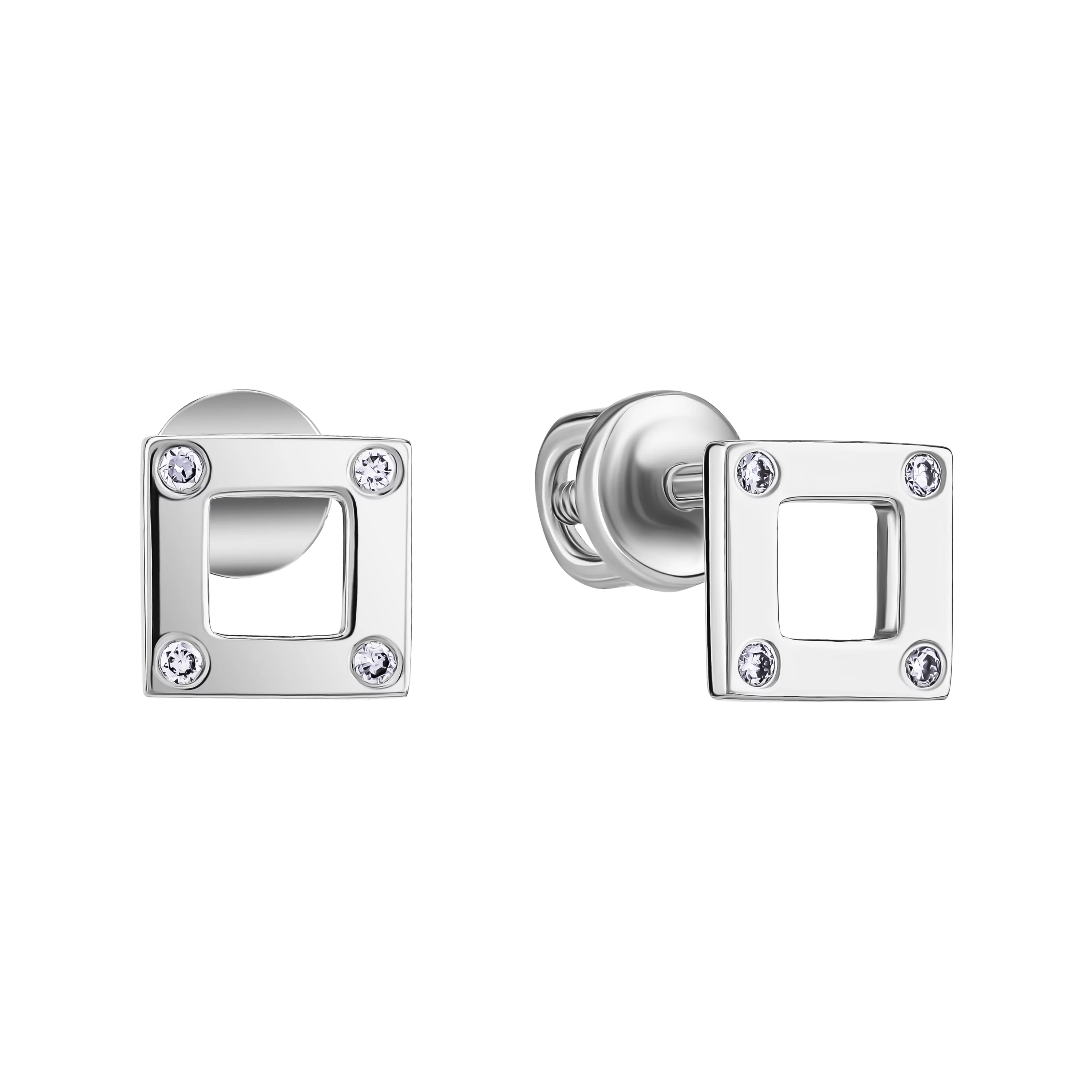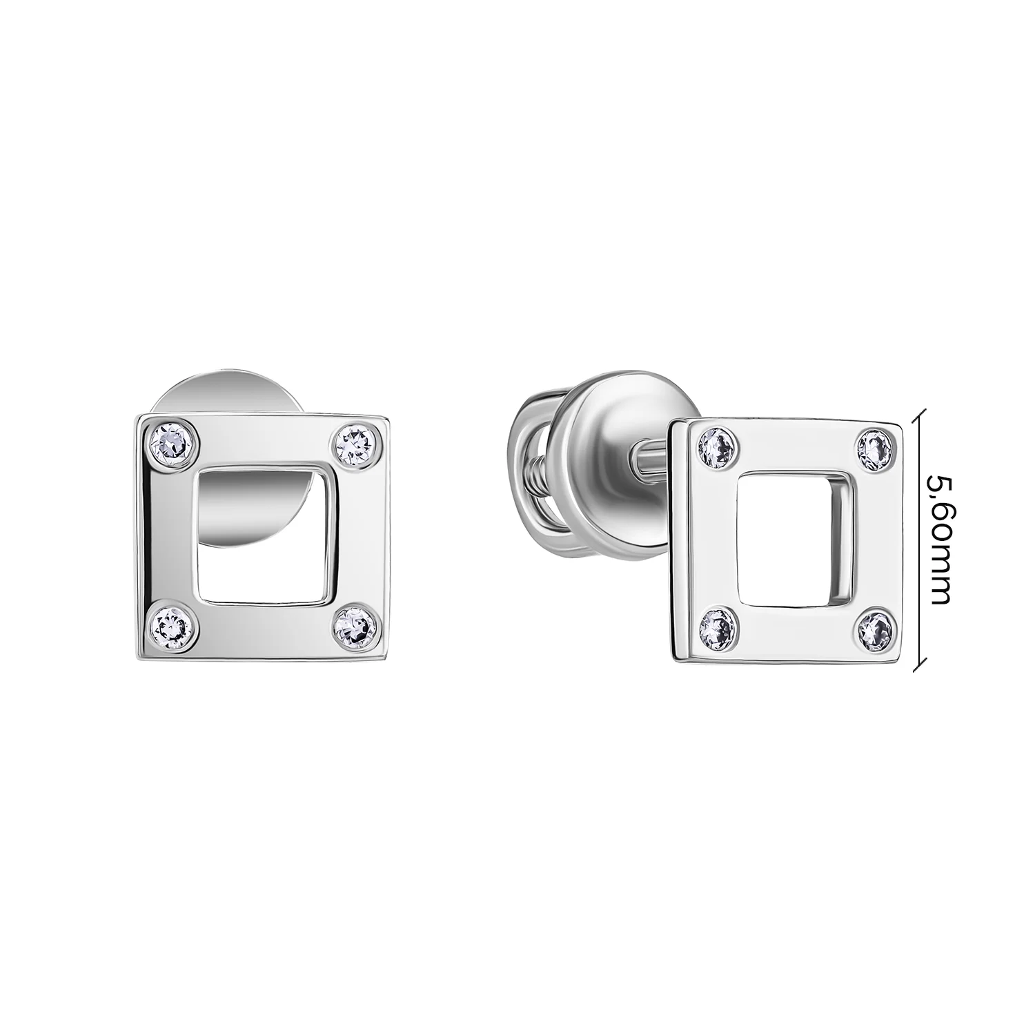 Сережки-гвоздики "Квадрат" у мінімалістичному стилі з білого золота з діамантами - 1876382