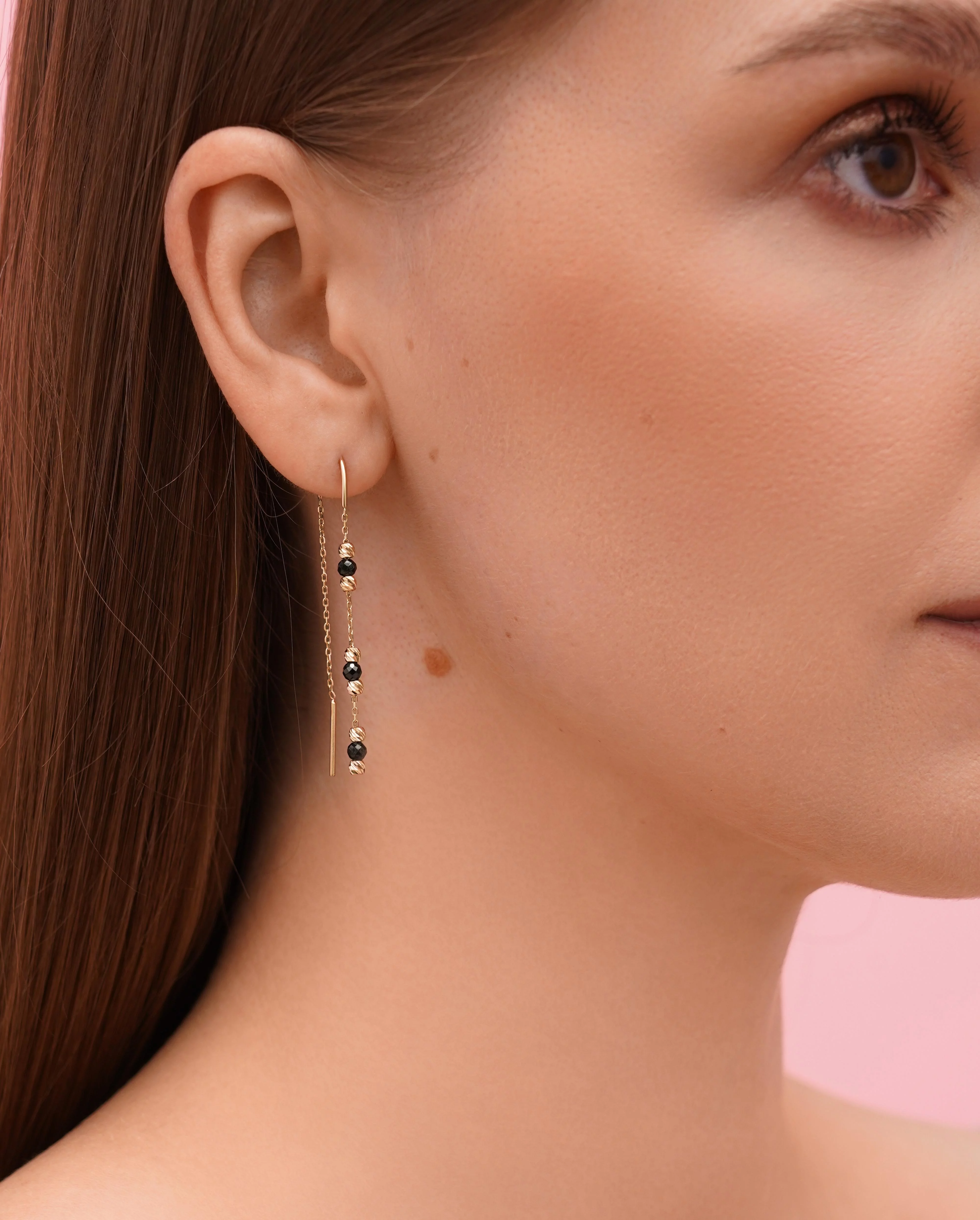 Стильні сережки-протяжки "Конюшина" з жовтого золота з оніксом - 1872762