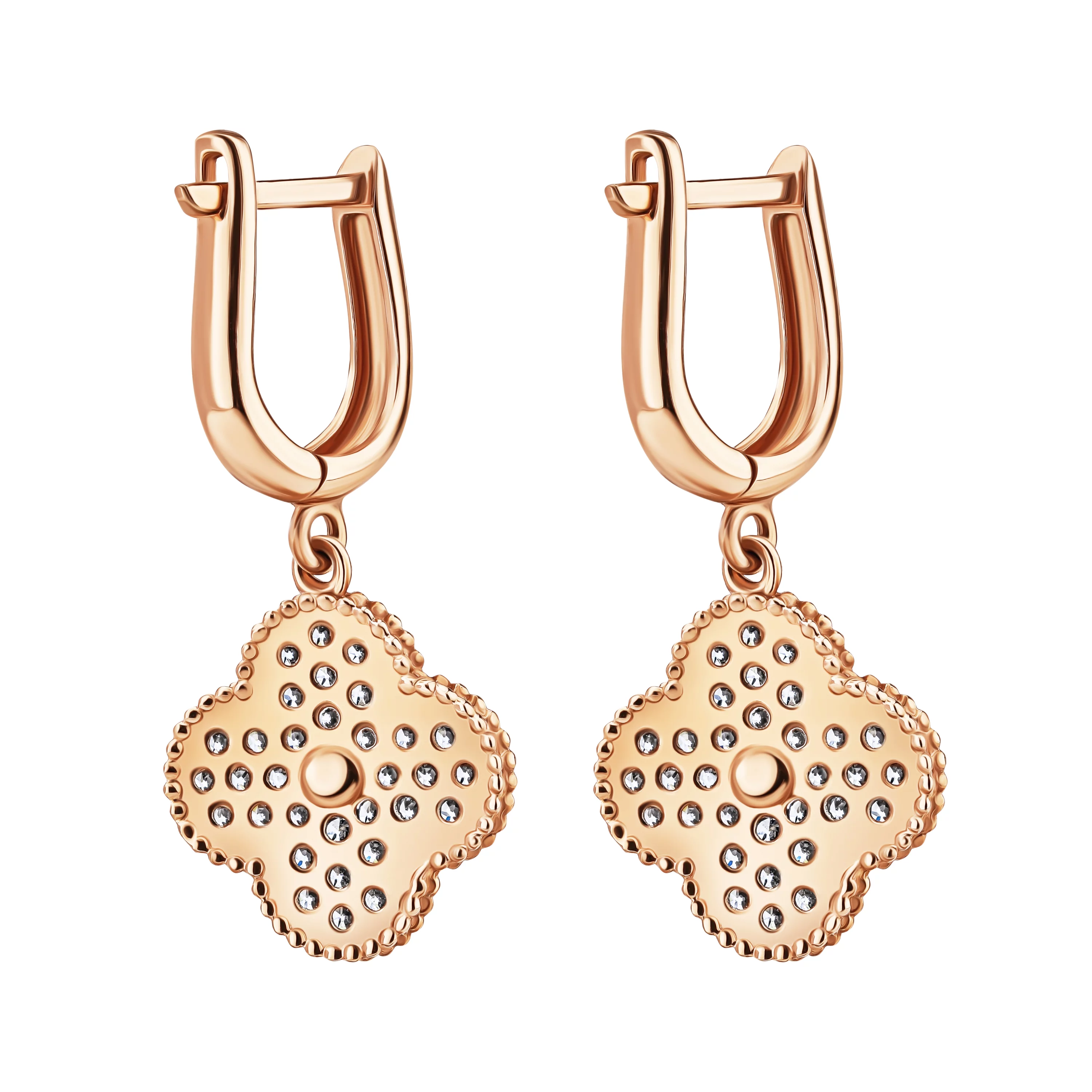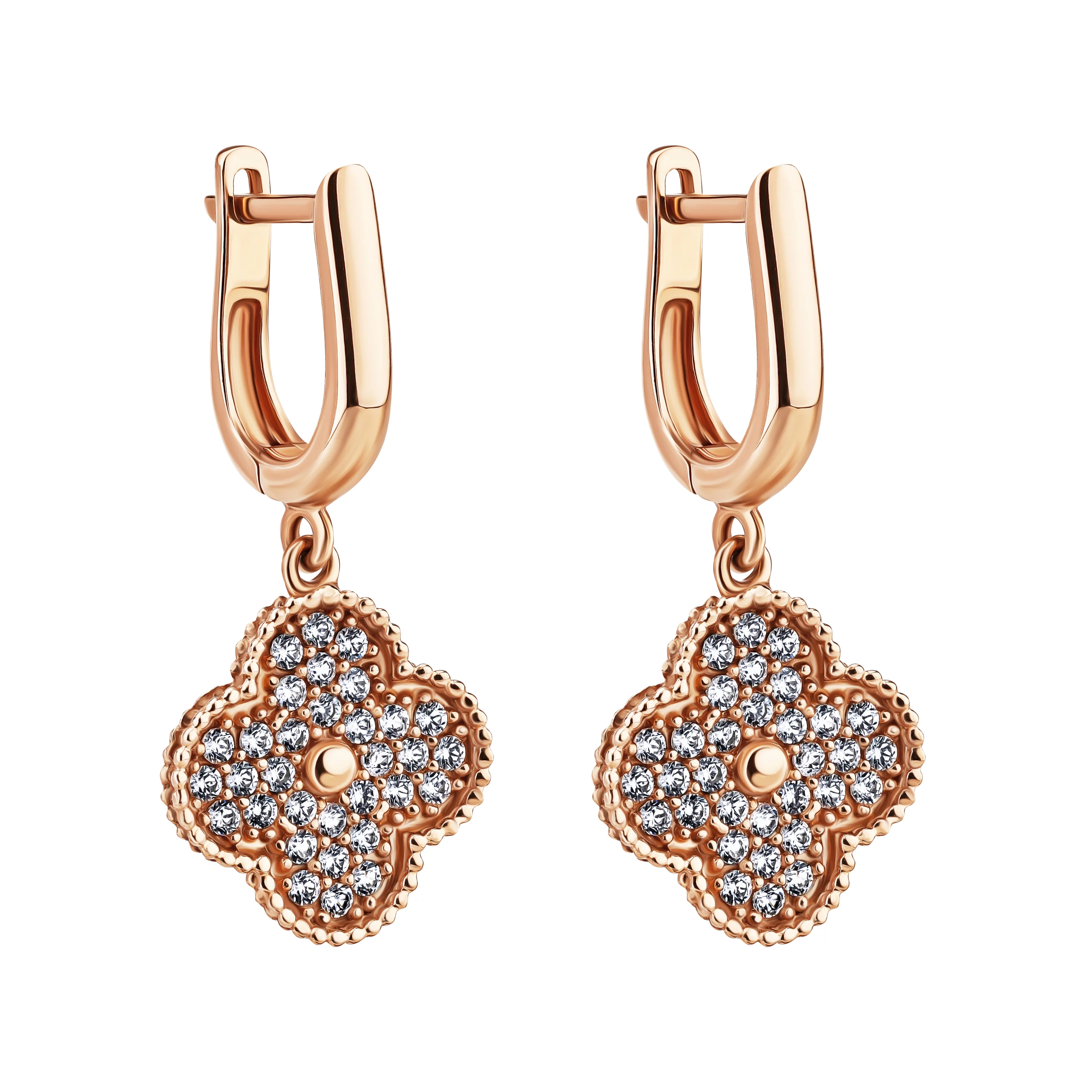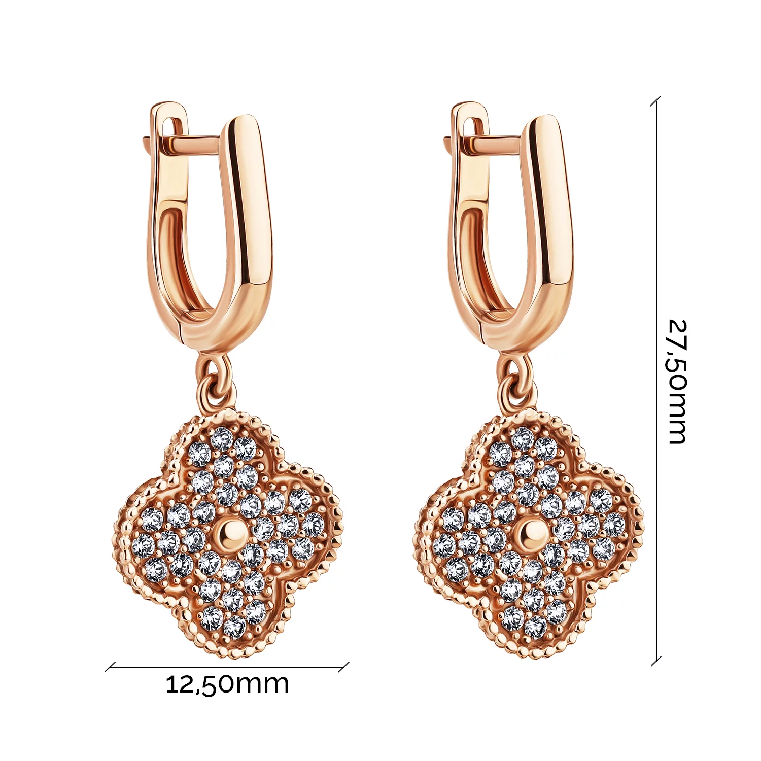 Сережки з підвісками "Конюшина" з фіанітами з червоного золота - 1745094