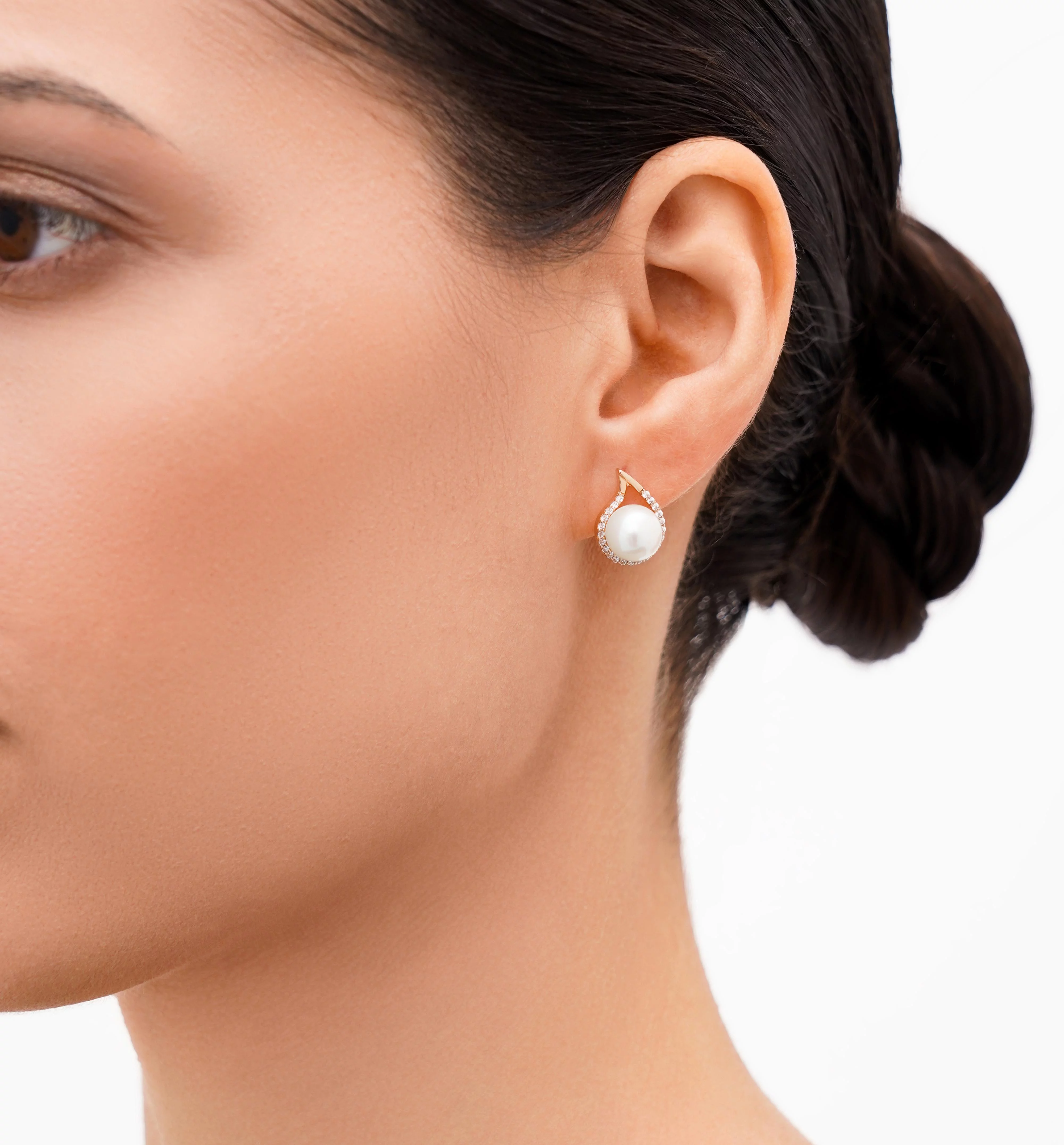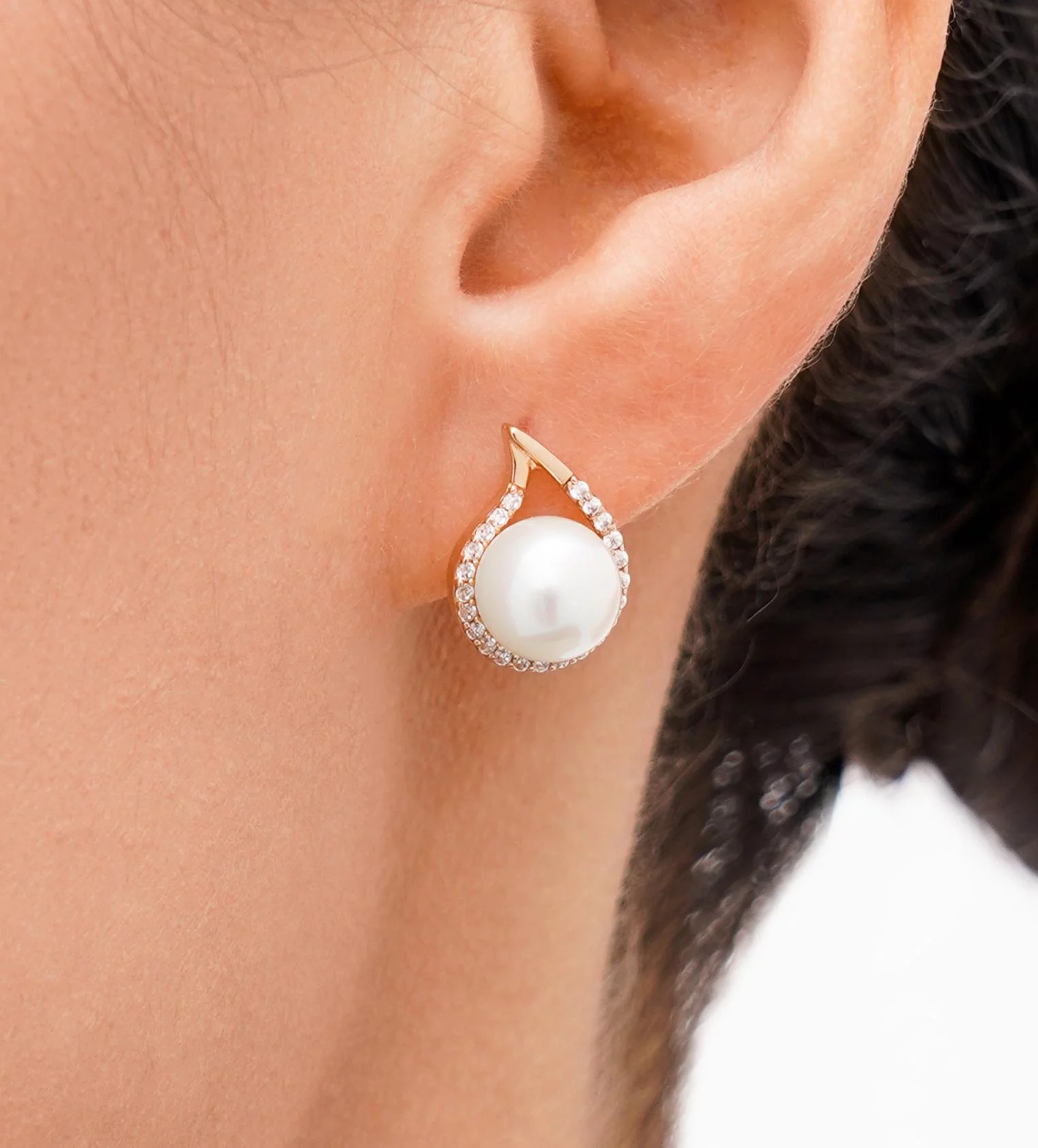 Сережки у формі листочка з червоного золота з перлиною і фіанітами - 1630904