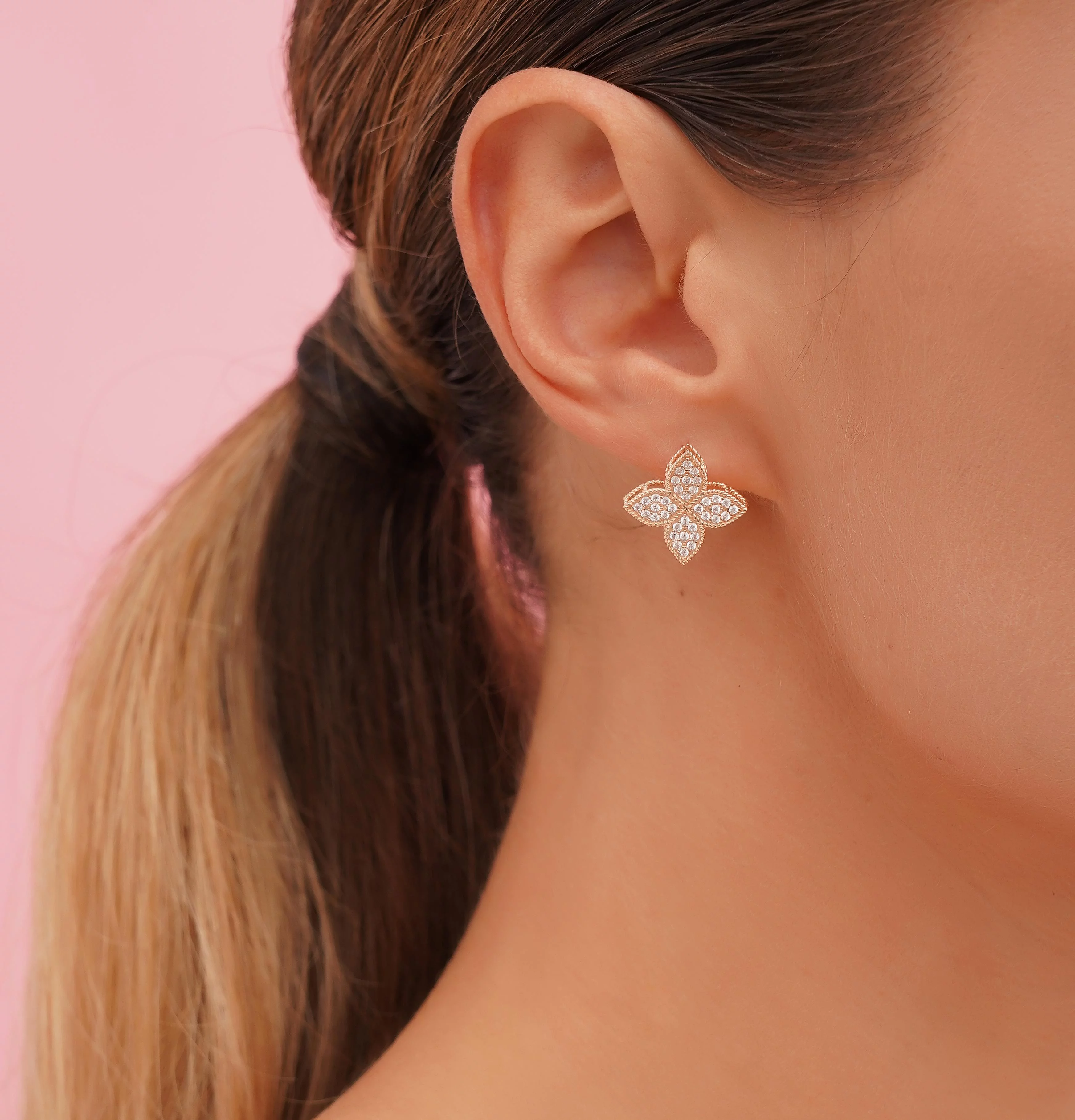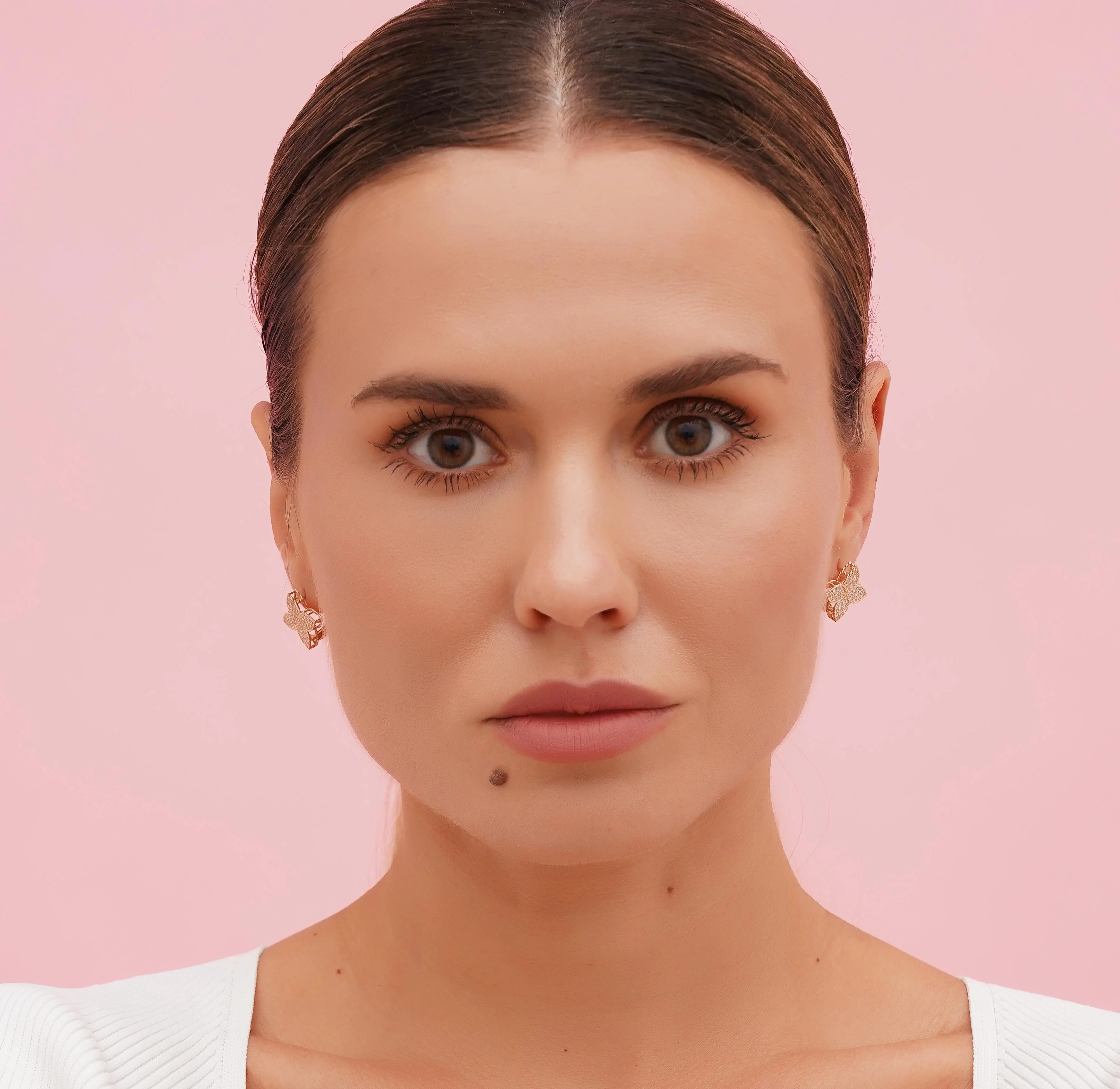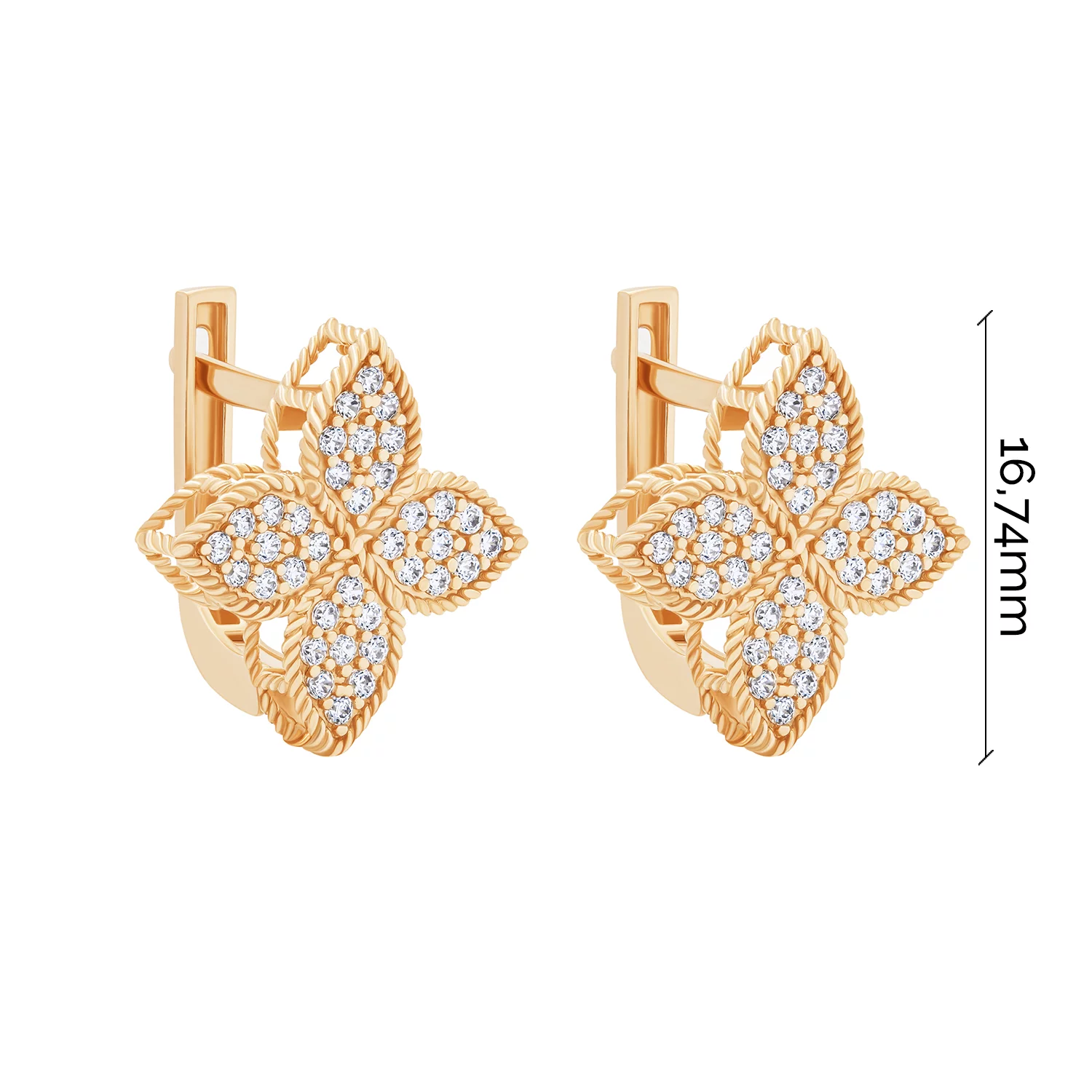 Стильні сережки-гвоздики "Флора" з червоного золота з емаллю та фіанітом - 1927691