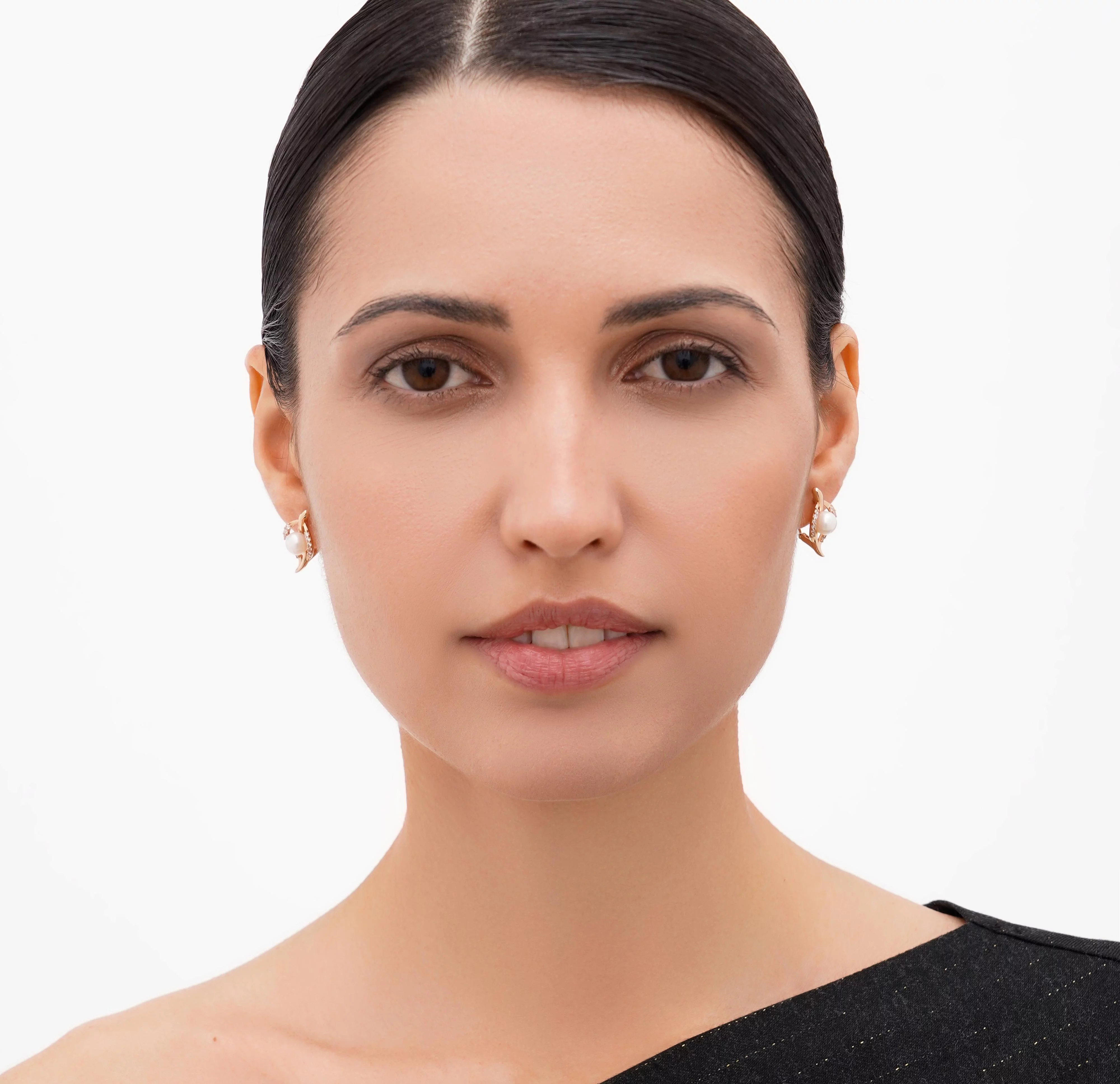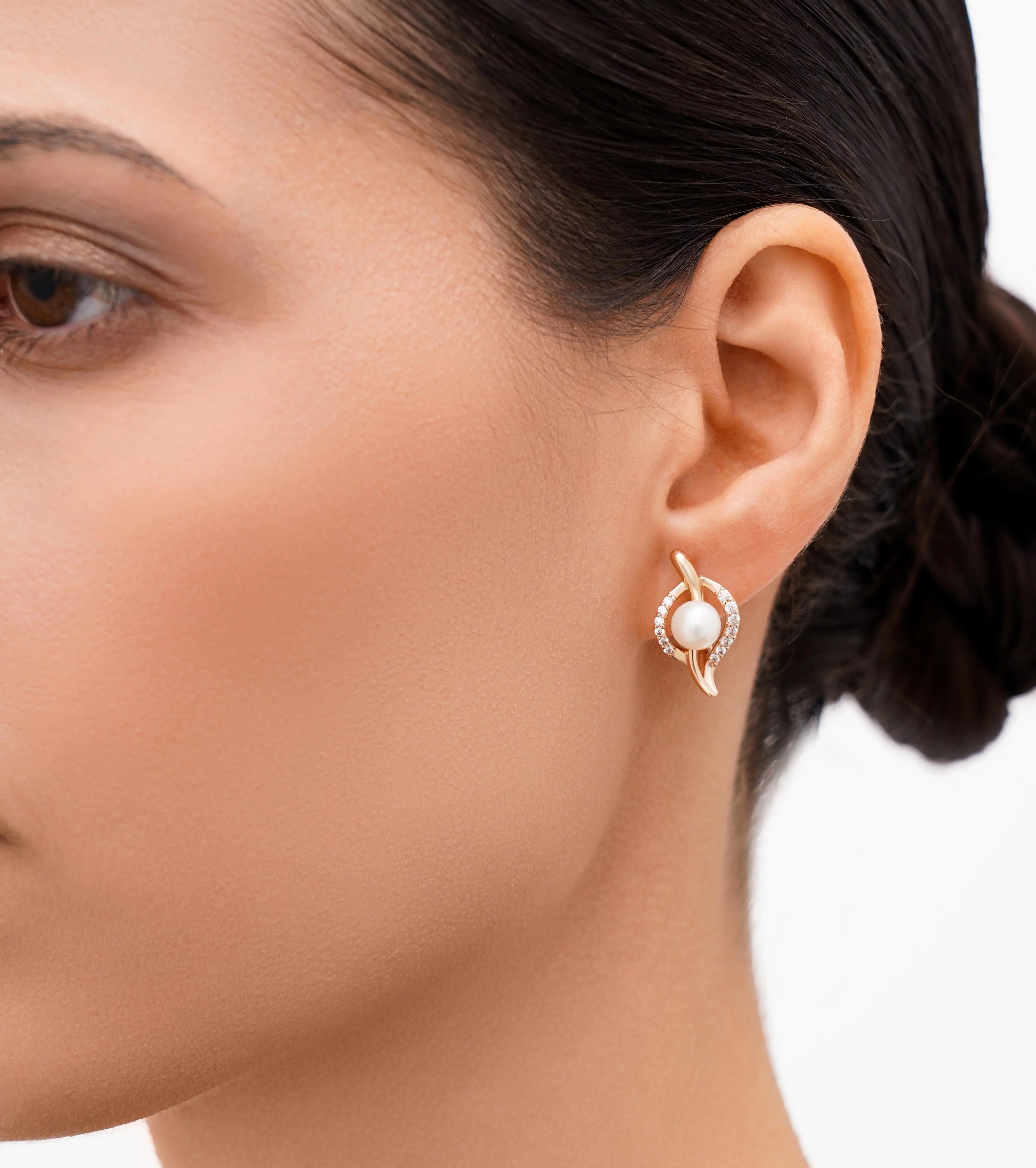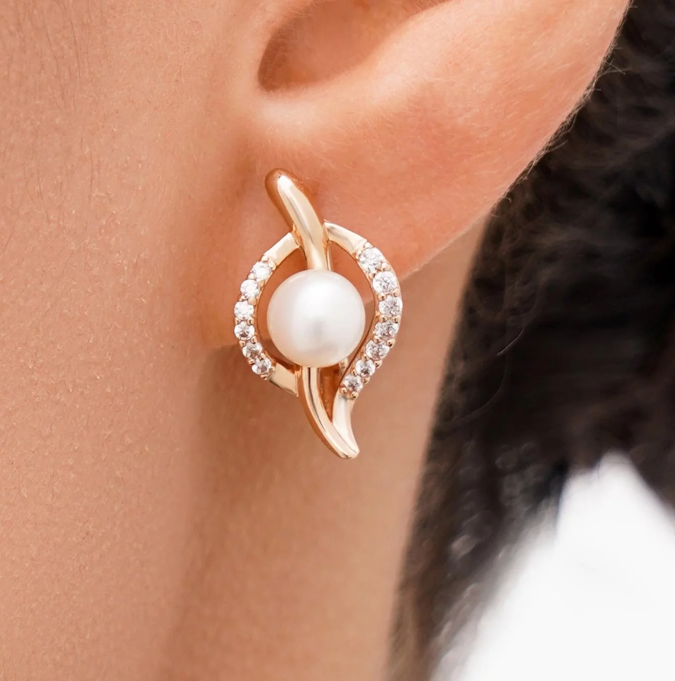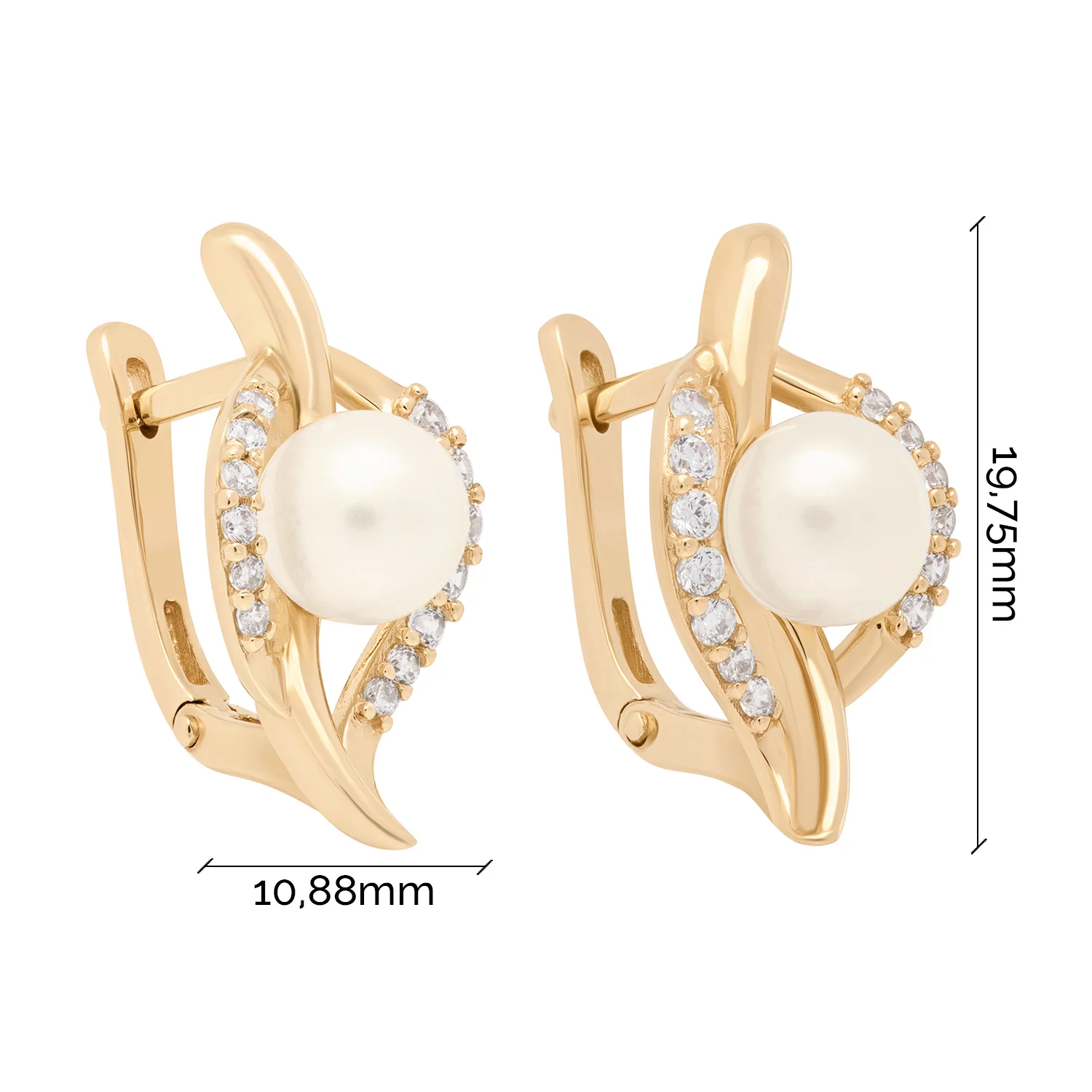 Стильні сережки-гвоздики "Флора" з червоного золота з перлинами, емаллю та фіанітами - 1927148