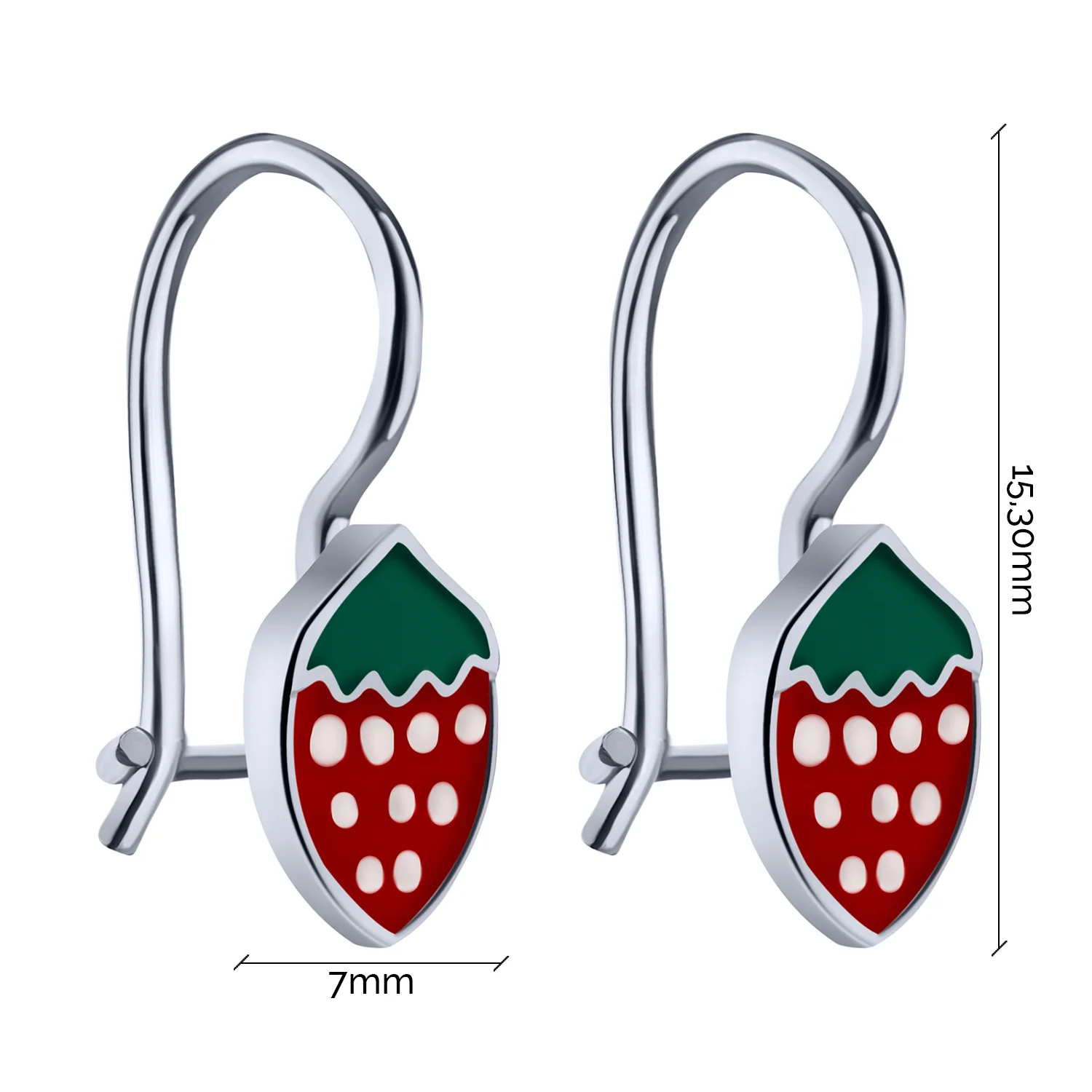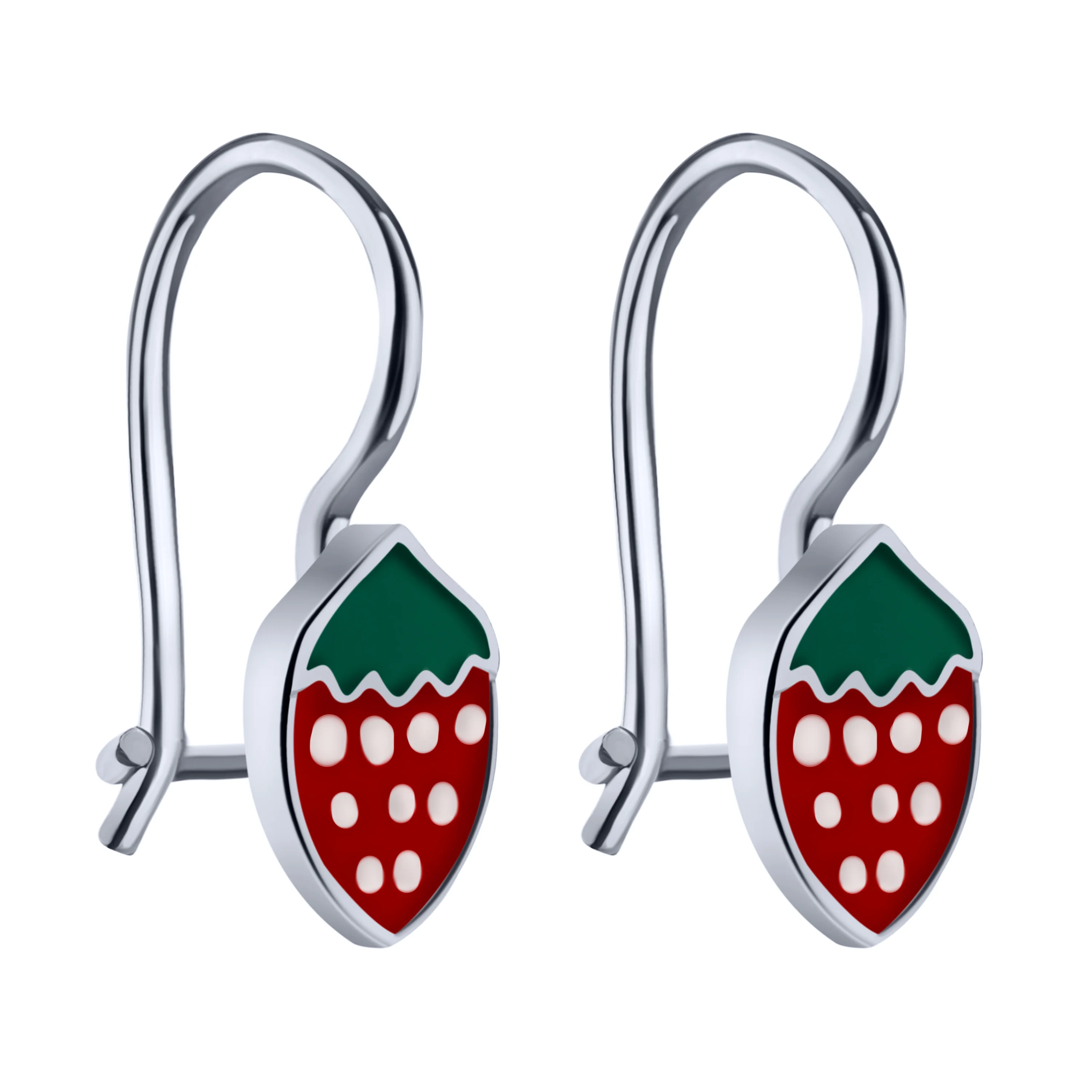 "Полуничні" сережки-петлі для дівчаток різного віку. Зроблені із срібла високої якості, прикрашені фіанітами. Першокласний подарунок крихіткам, які стежать за новомодними трендами.