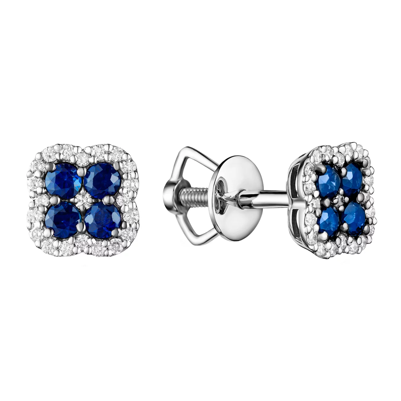 Сережки-гвоздики з білого золота "Квіточка" із сапфірами та діамантами - 1542770