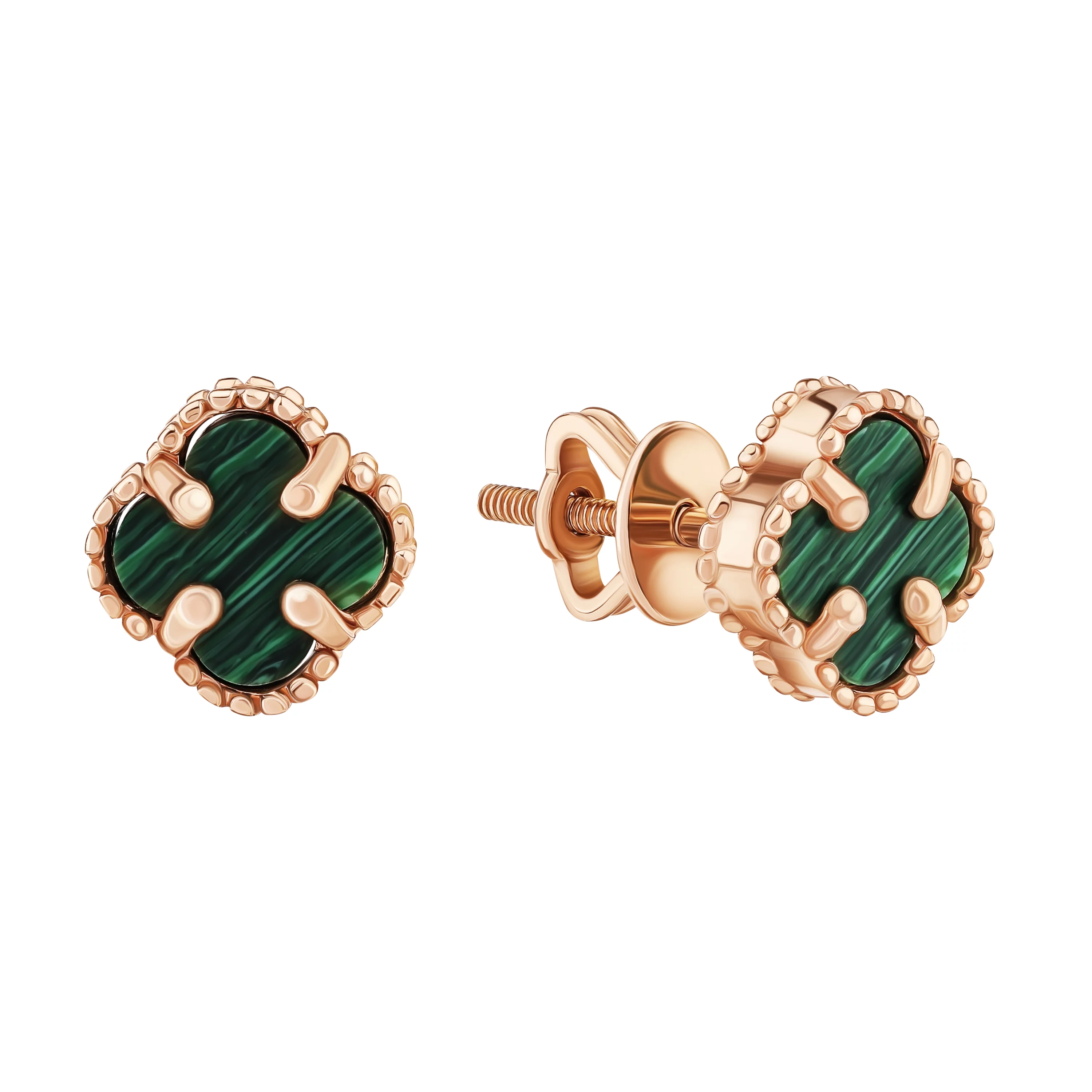 Срібні сережки-гвоздики "Конюшина" з жовтим родіюванням з малахітом та фіанітами - 1880151