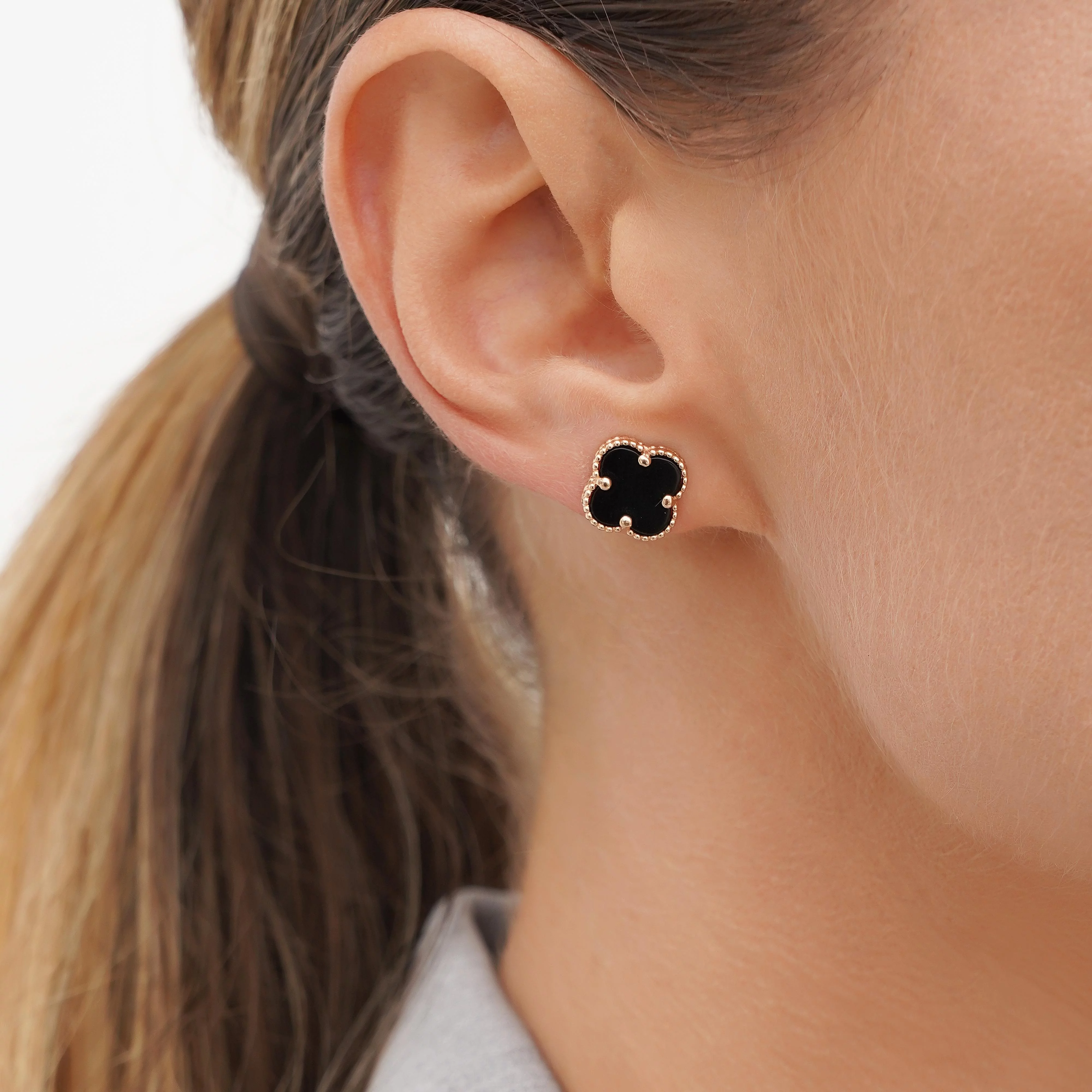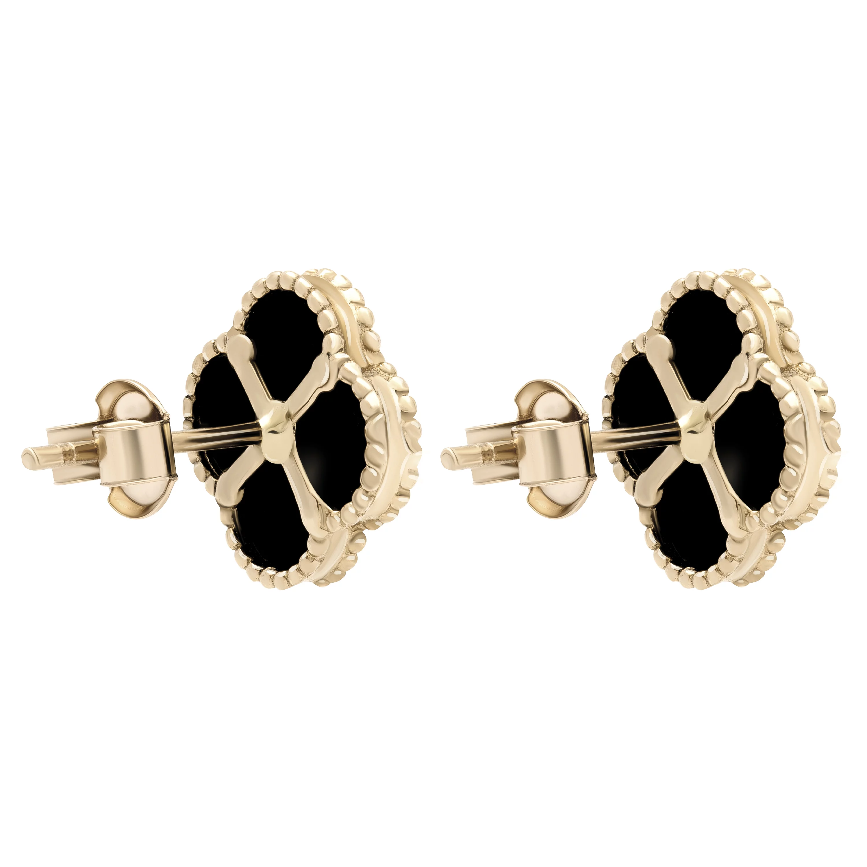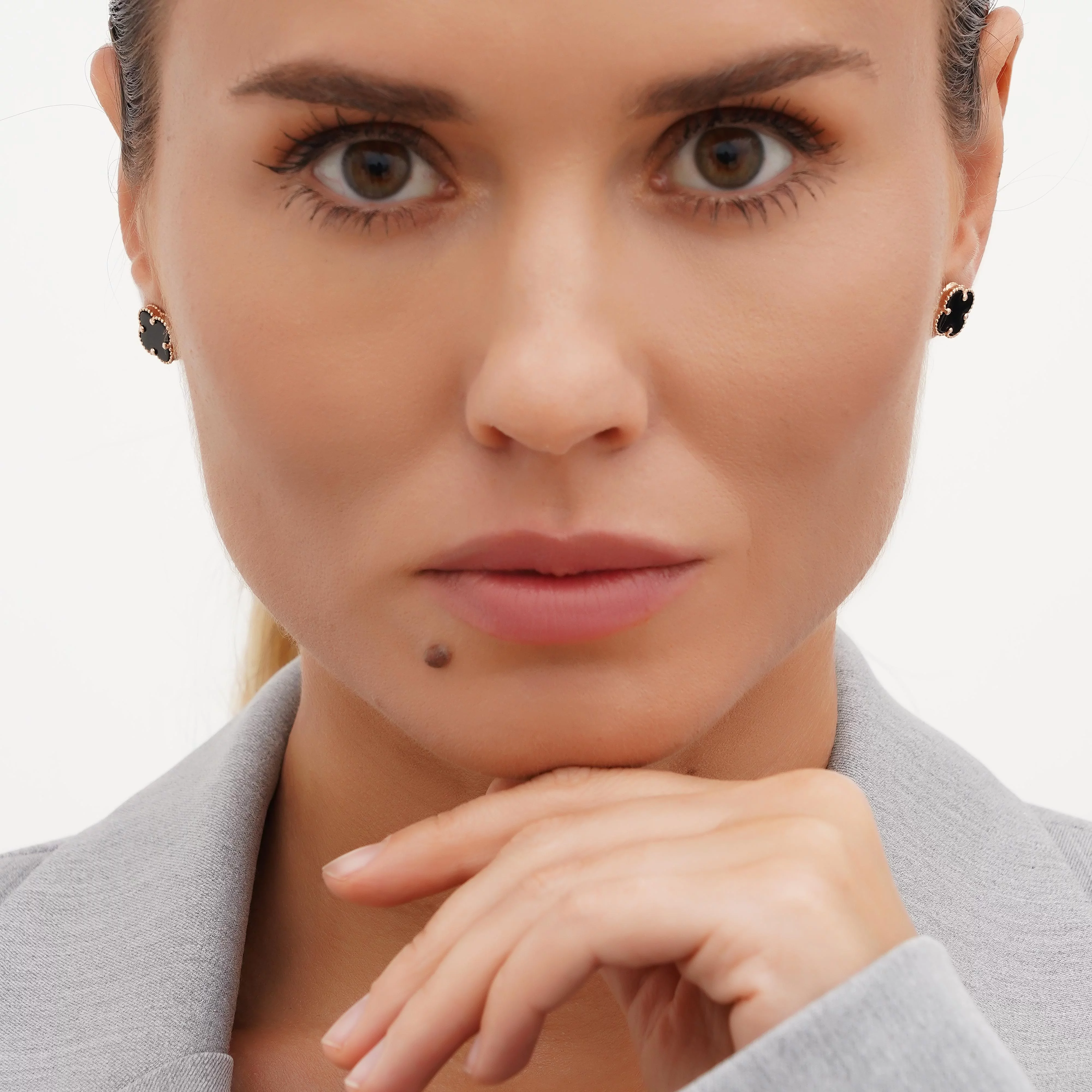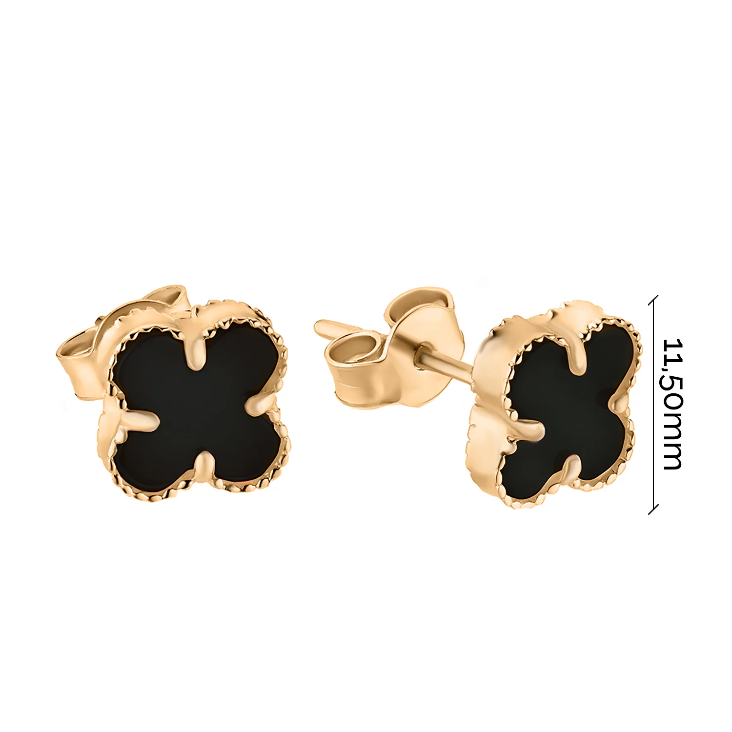 Стильні сережки-гвоздики "Конюшина" з червоного золота з оніксом - 1878296
