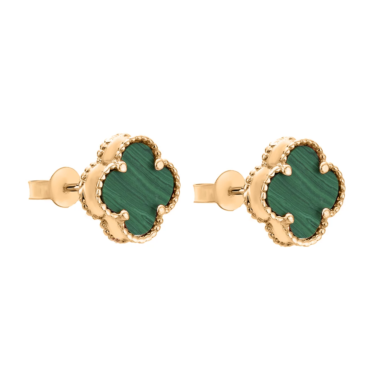 Додати яскравість та оригінальність в образ допоможуть сережки-пусети в червоному золоті «Конюшина» з малахітом. Компактні, але водночас помітні прикраси виготовлені з дорогоцінного металу 585 проби з додаванням міді, що надає йому м'якого червоного відтінку. Насичений зелений колір малахіту, що прикрашає основу сережок, освіжає та тішить око. Такі ювелірні вироби є самодостатніми й мають бути головним елементом дорогоцінної композиції. Сережки гармонійно доповнюють вбрання в білих, чорних, бежевих та пастельних тонах.