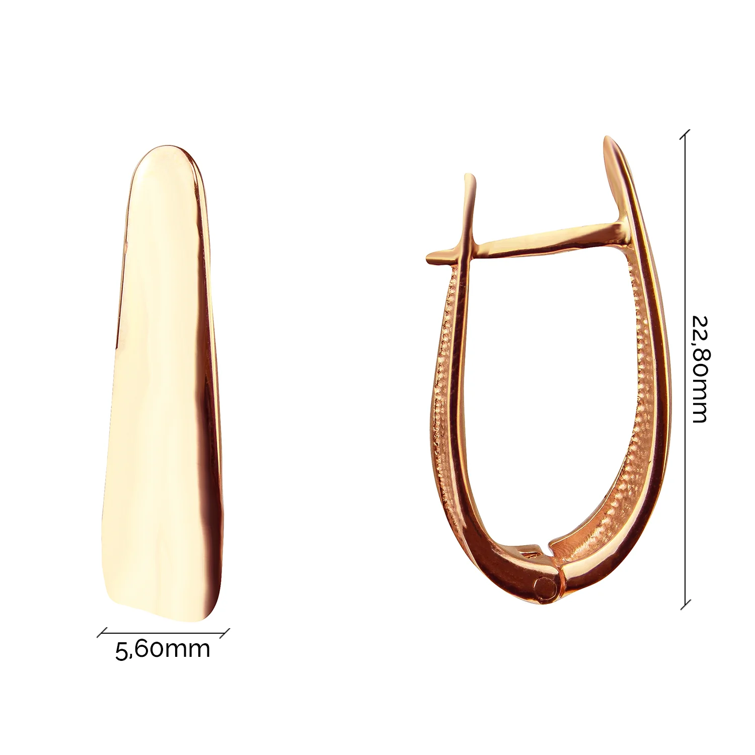 Сережки відрізняються стриманим універсальним дизайном. У них просте оформлення, модель підійде під будь-який образ. Подовжена краплеподібна основа плавно переходить у швензу та застібається на англійський замок. Прикраси з червоного золота 585 проби актуальні незалежно від моди. Вони поєднуються з діловим костюмом, жіночною сукнею та неформальним одягом. Модель сподобається любителям класики та лаконічного стилю. Декоративні елементи відсутні, красу передають полірований метал та проста форма. Сережки зручні в носінні, якісні та довговічні.