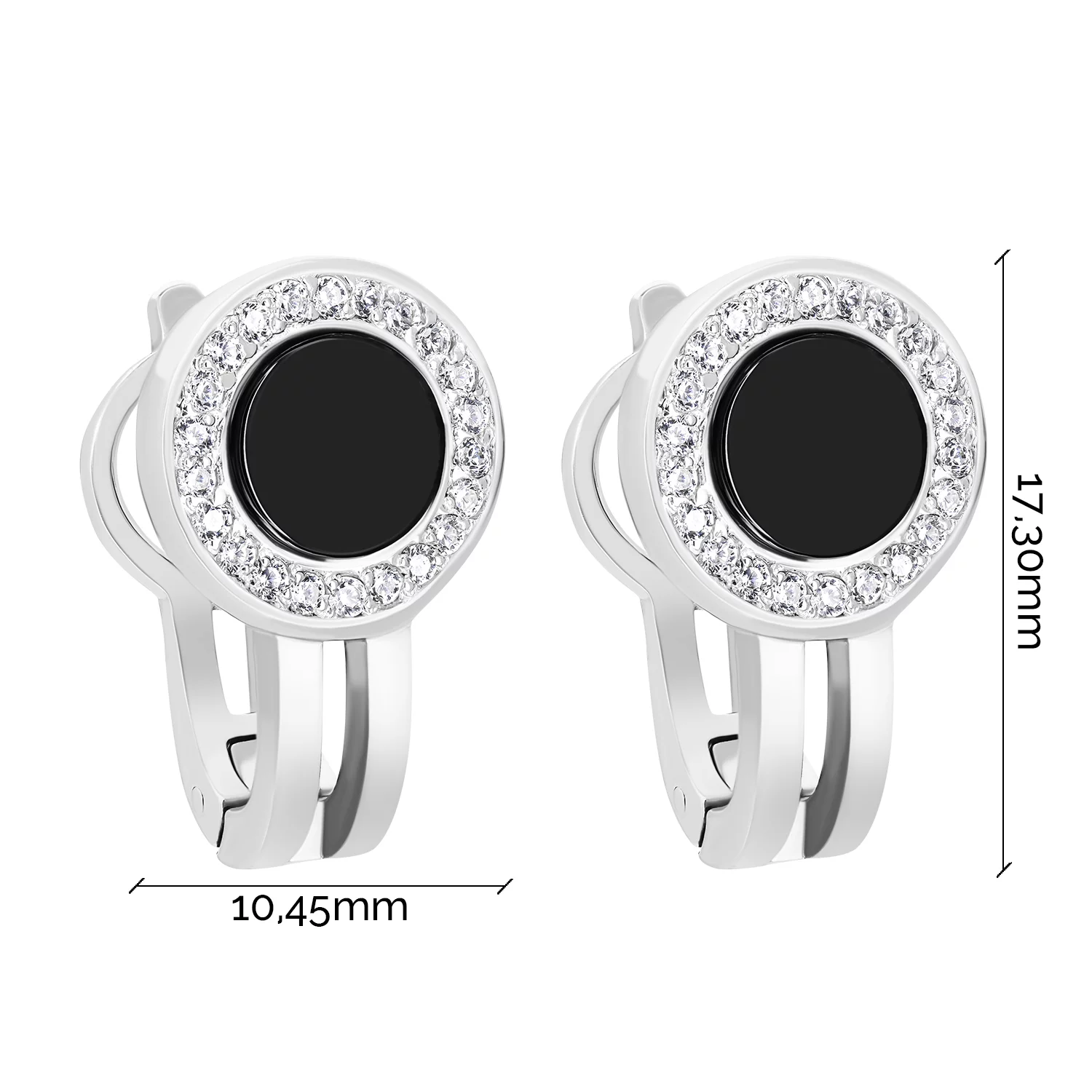 Срібні стильні сережки-пусети "Конюшина" з оніксом та фіанітами - 1940309