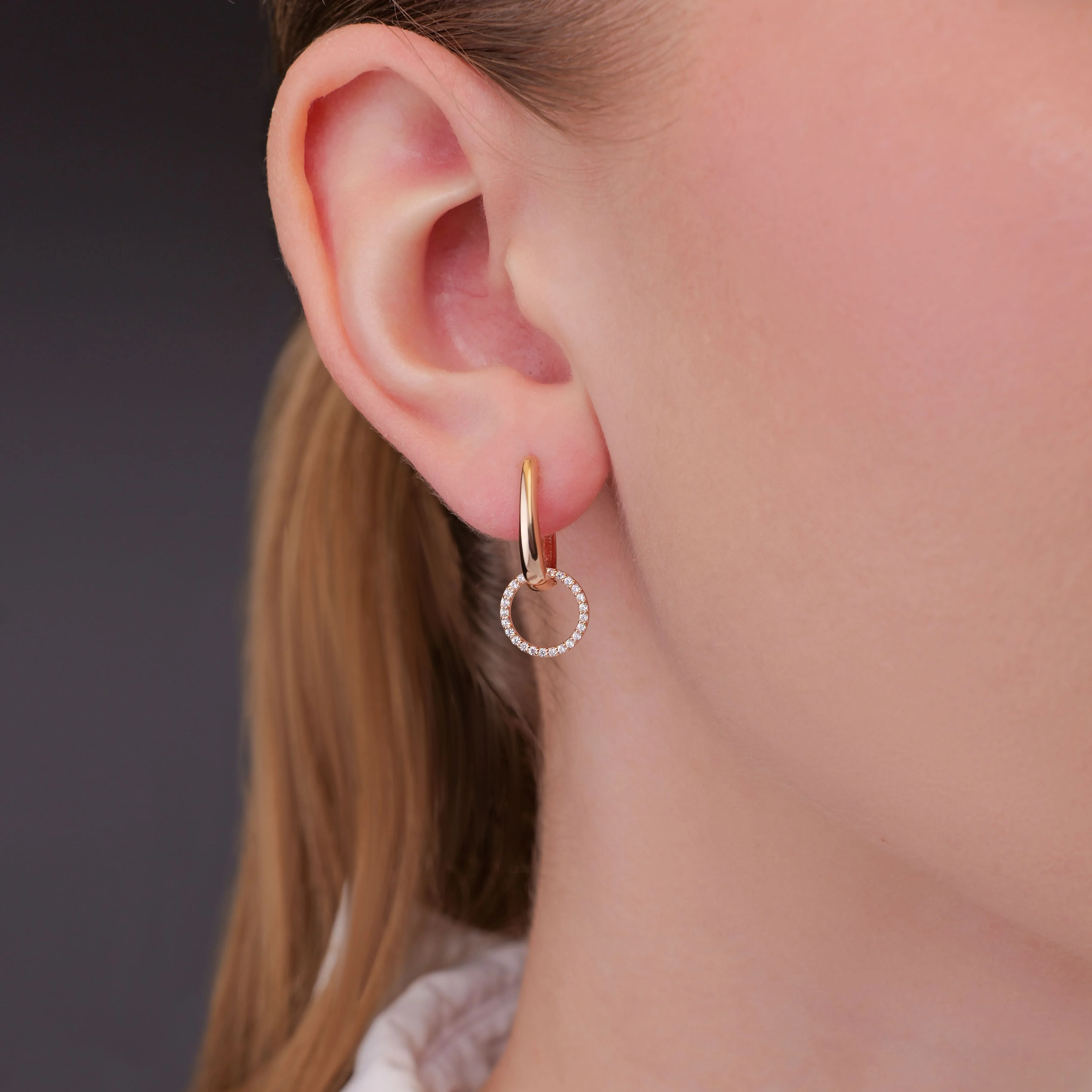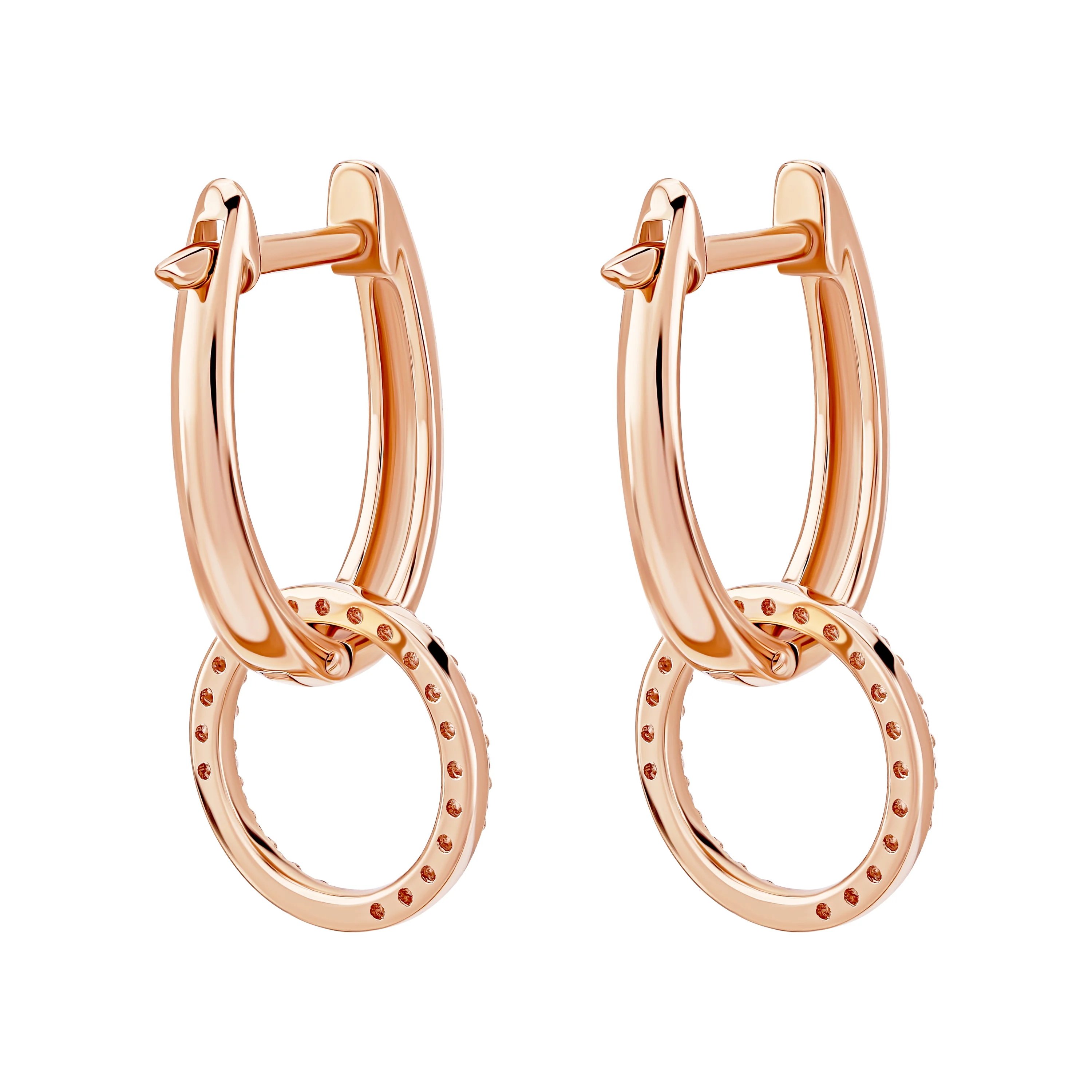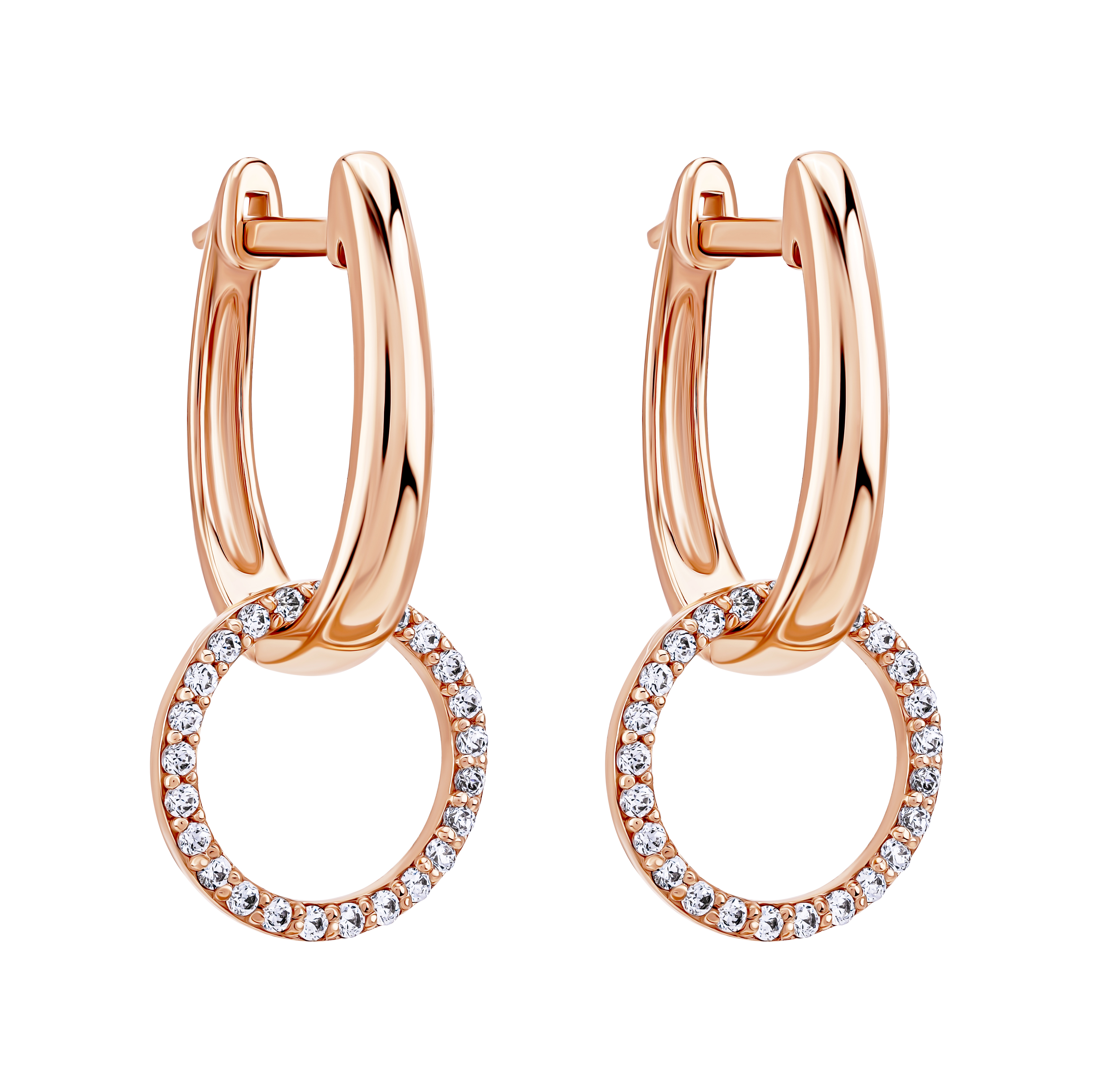 Дивовижні сережки-кільця з круглими підвісами – ідеальний за формою та розміром виріб, котрий легко поєднується з різними стилями одягу та аксесуарів. Виготовлений із червоного золота, що притягує погляди завдяки «гарячому» блиску та теплоті. Родзинка коштовності ще й у тому, що вона прикрашена фіанітами і не обтяжена декоративними елементами. Класичний фешн: тонка філігранна робота з акцентом на сучасну асиметрію. Можна дарувати з будь-якого приводу, носити в повсякденності, на урочисті заходи та й не тільки.