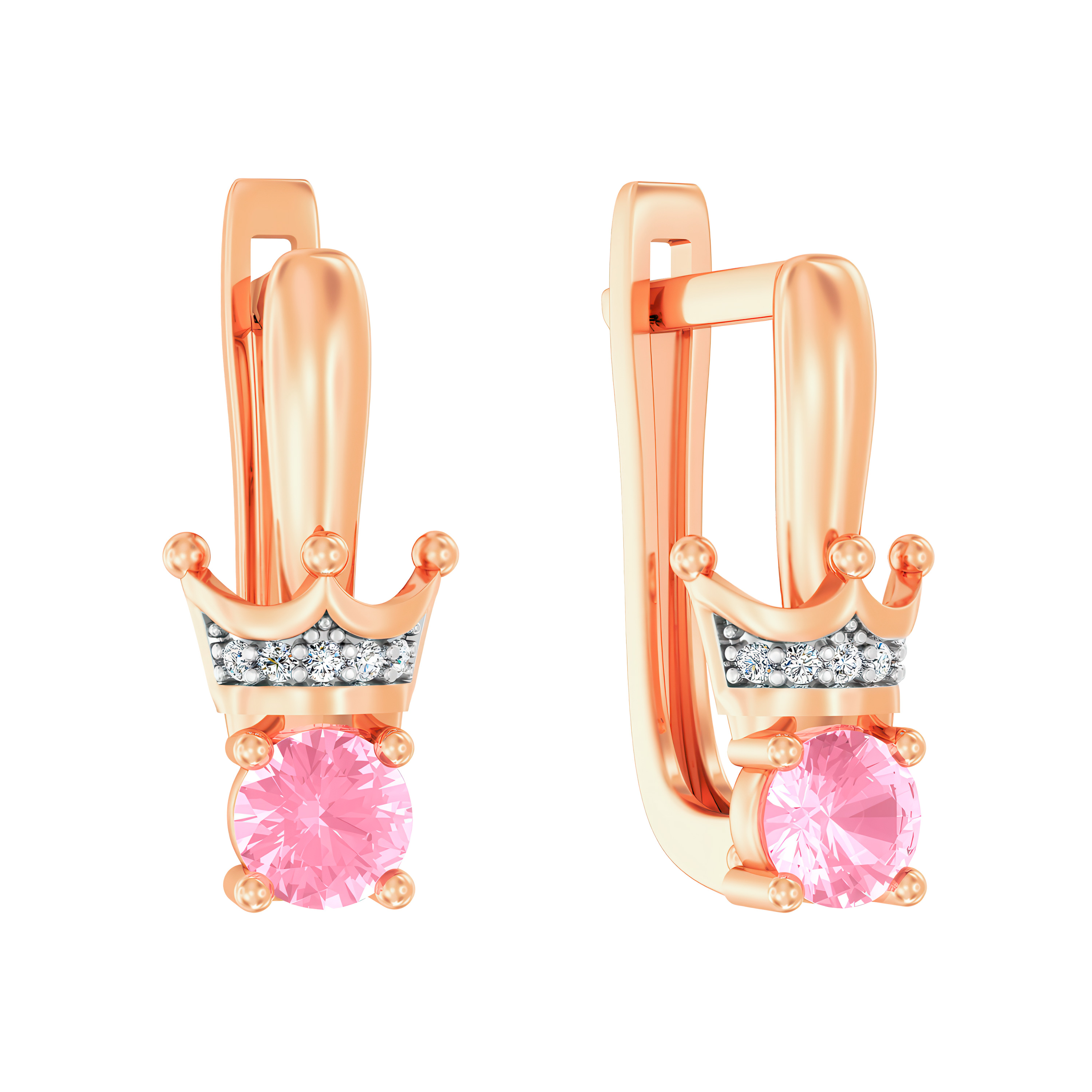 Сережки "Корона" у комбінованому золоті з рожевими і білими фіанітами - 2117862