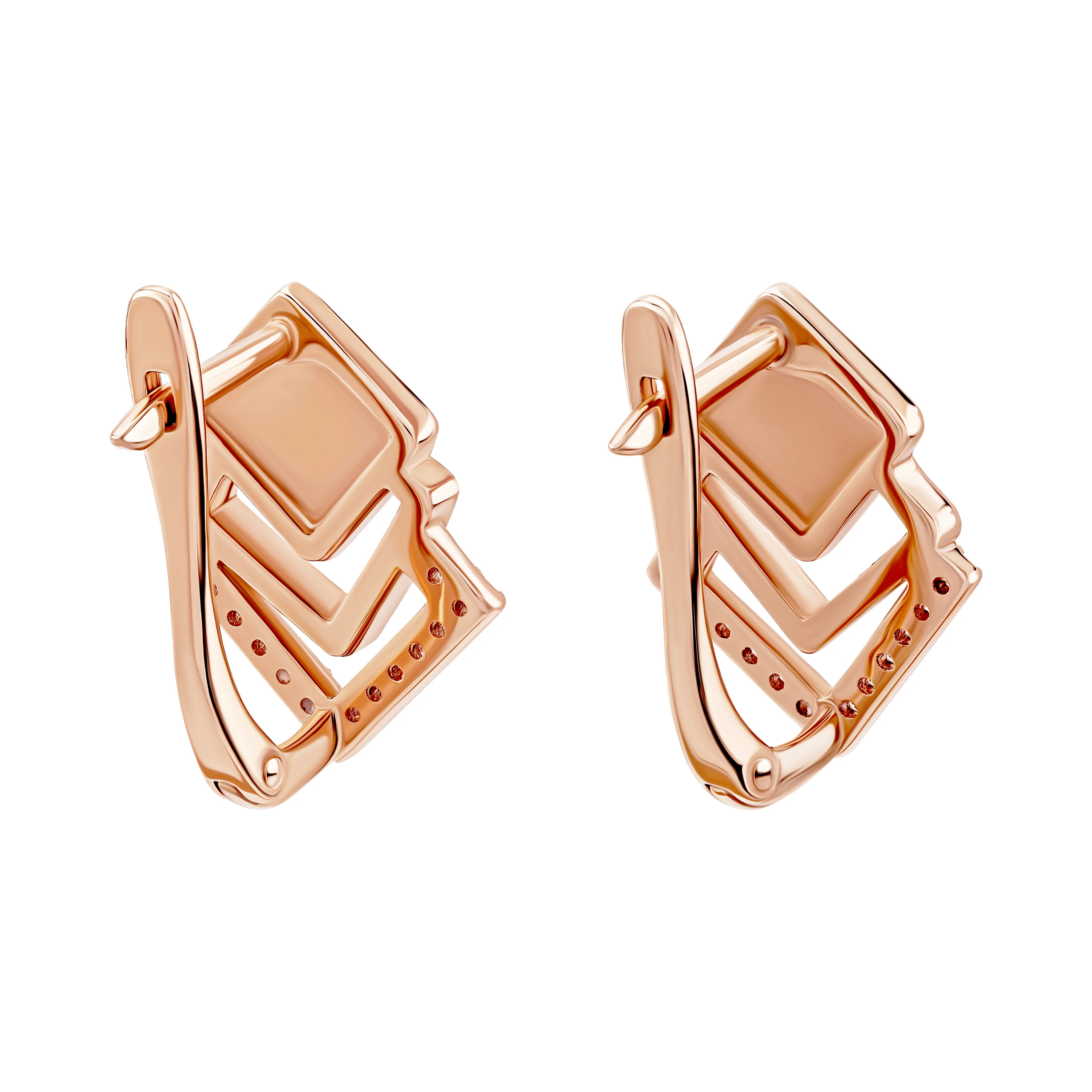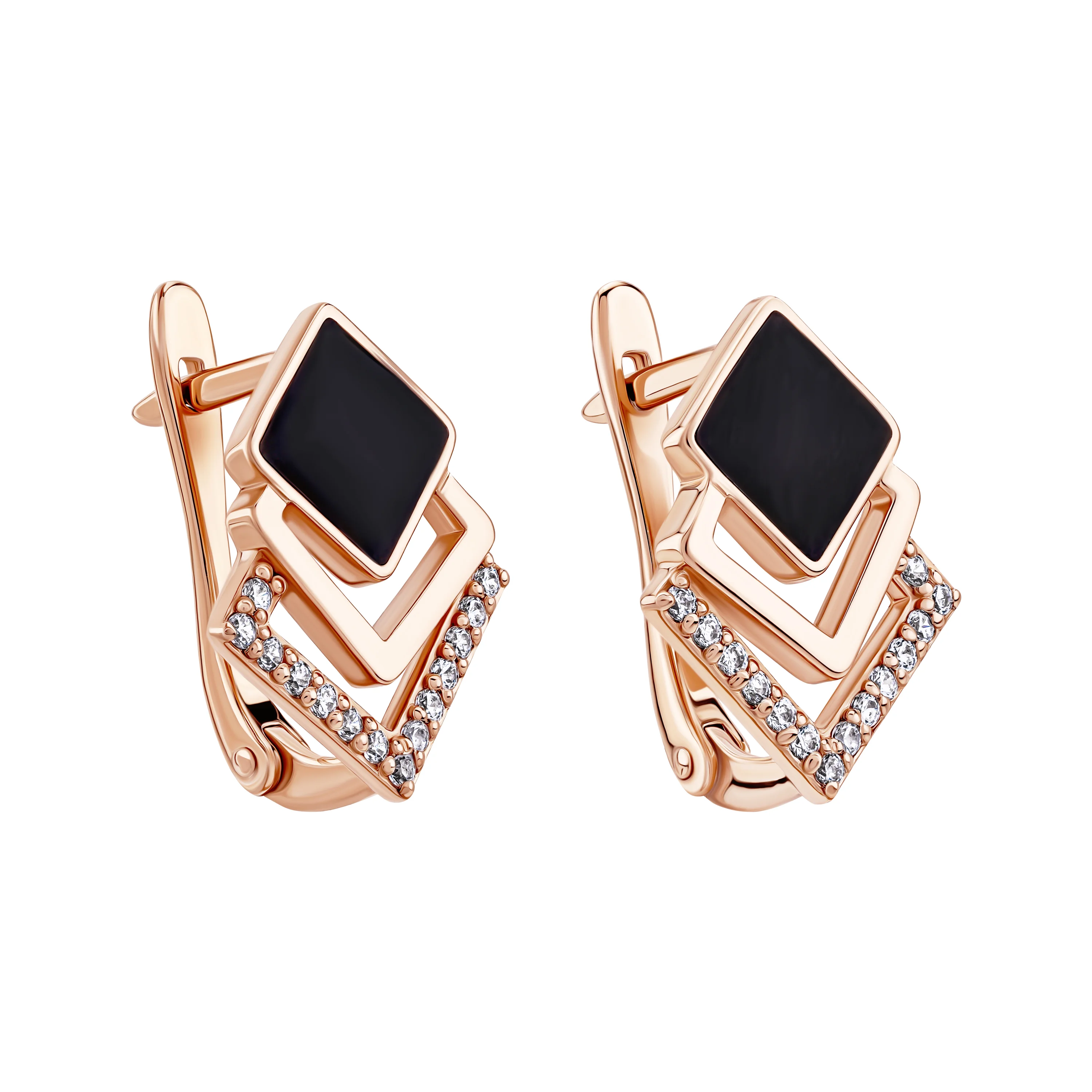 Сережки "Квадрати" з емаллю та фіанітами у червоному золоті - 1987414