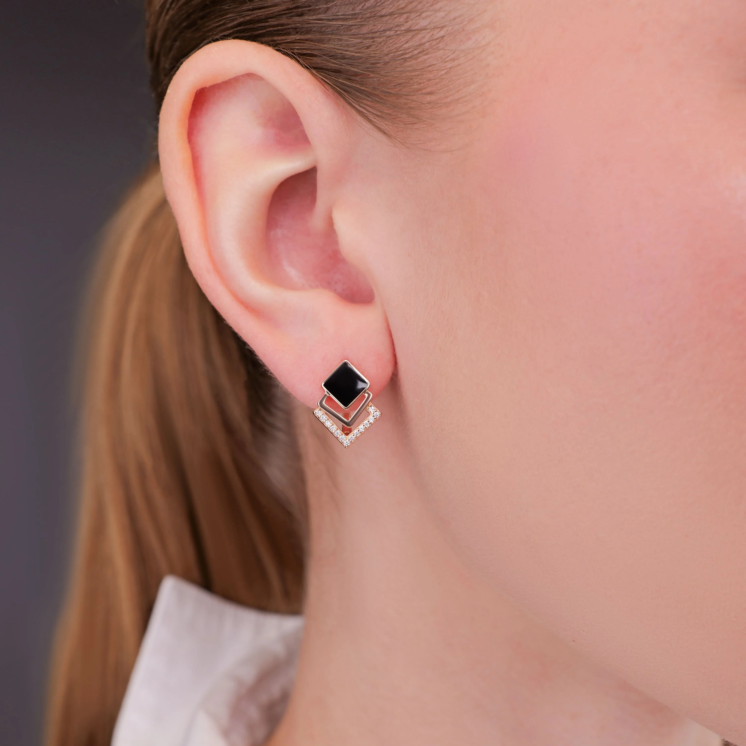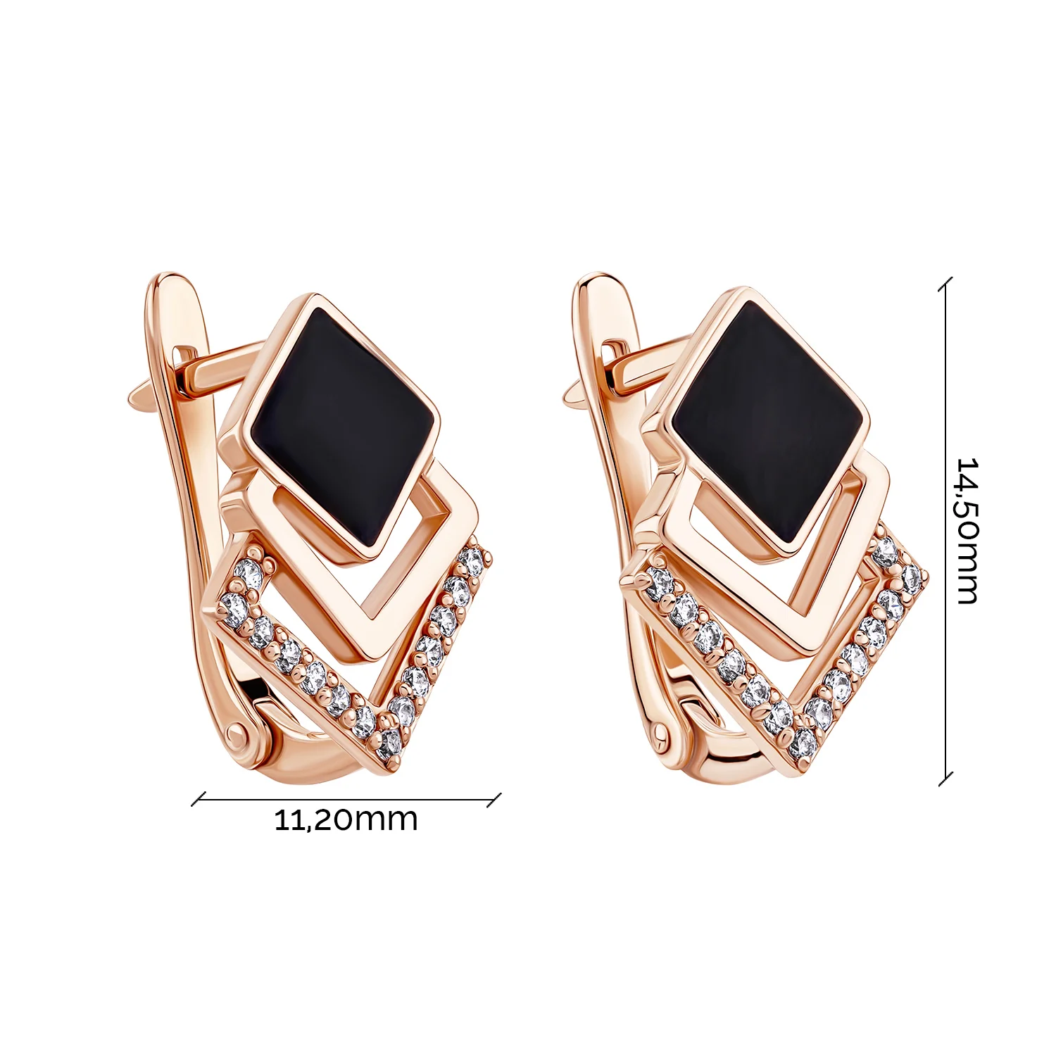 Коштовність, яка в одну мить може затьмарити “Чорний квадрат” Казимира Малевича. Тут красиве червоне золото покрите чорною емаллю. Сама коштовність складається з кількох квадратів, переплетених між собою геометрією.¶Емалеве оздоблення додає виробу ще більшої декоративної унікальності. Потужна енергія темного кольору плавно переходить у світлі відблиски фіанітів. Камінці, розташовані по периметру одного з квадратиків, розсипаються рівною доріжкою. Витончена англійська застібка надійно закріплює виріб на жіночому вушку.¶Розкішні сережки бездоганно пасують до ювілею, Дня народження, світського рауту, званого вечора, випускного. Їх також можна носити під час прогулянок і роботи, одягати на побачення. Коштовну річ дарують на знак поваги, гарного ставлення та любові. Виглядає чудово – а в поєднанні з ошатним вбранням і взагалі щось неземне!