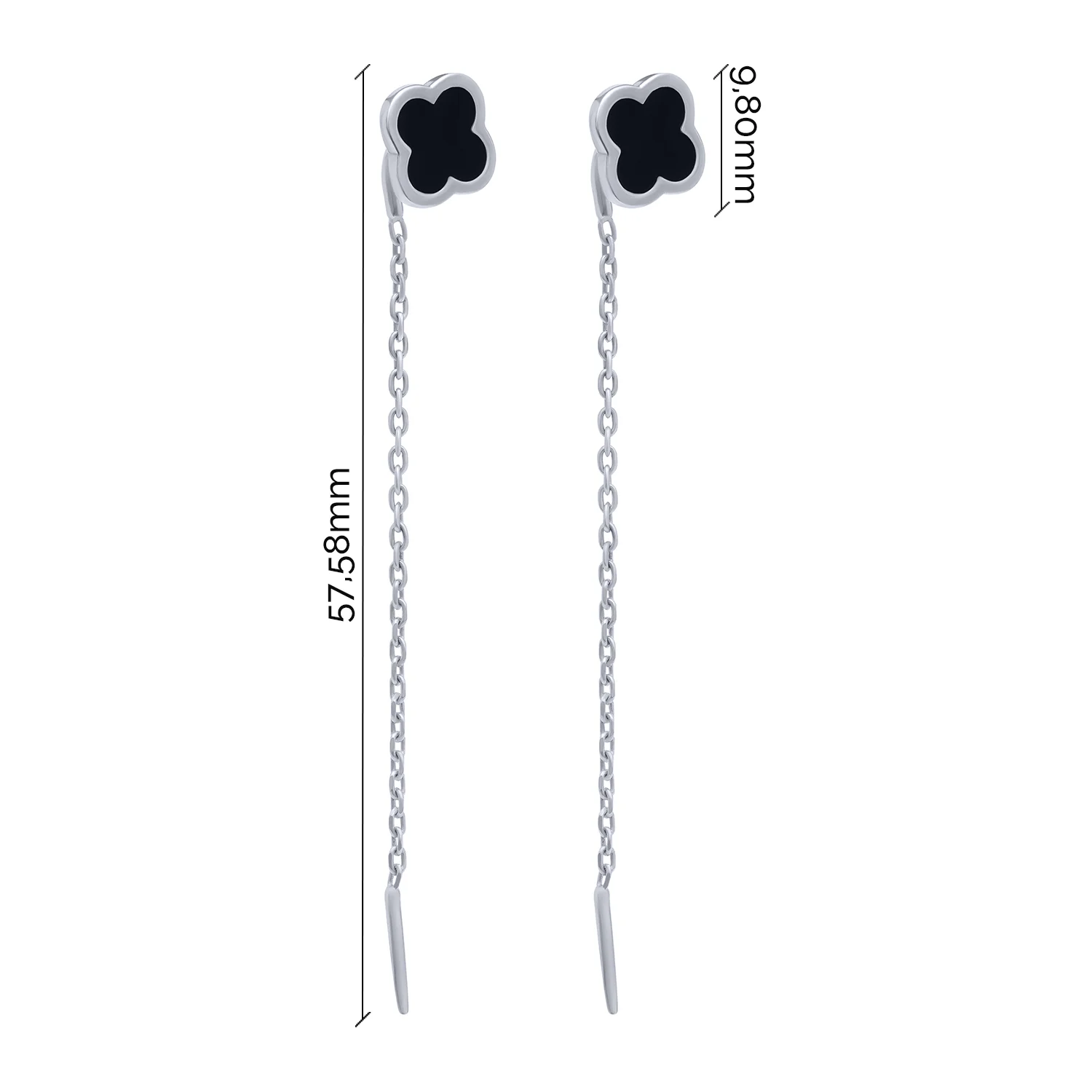 Сережки-протяжки «Конюшина» срібні з емаллю — витончені прикраси, які привертають увагу оточення, оскільки залишитися непомітними ці елегантні квіти з підвісками не можуть. Такі вироби мають яскравий вигляд завдяки поєднанню білого дорогоцінного металу 925 проби з темними вставками. Їхня основа виконана у формі конюшини із чотирма пелюстками, прикрашеними емаллю. Зафіксувати кожну сережку в мочці вуха допомагає ланцюжок-протяжка з паличкою-голкою. Такі прикраси візуально видовжують обличчя, а носити їх краще із зачісками, у яких волосся зібране догори.