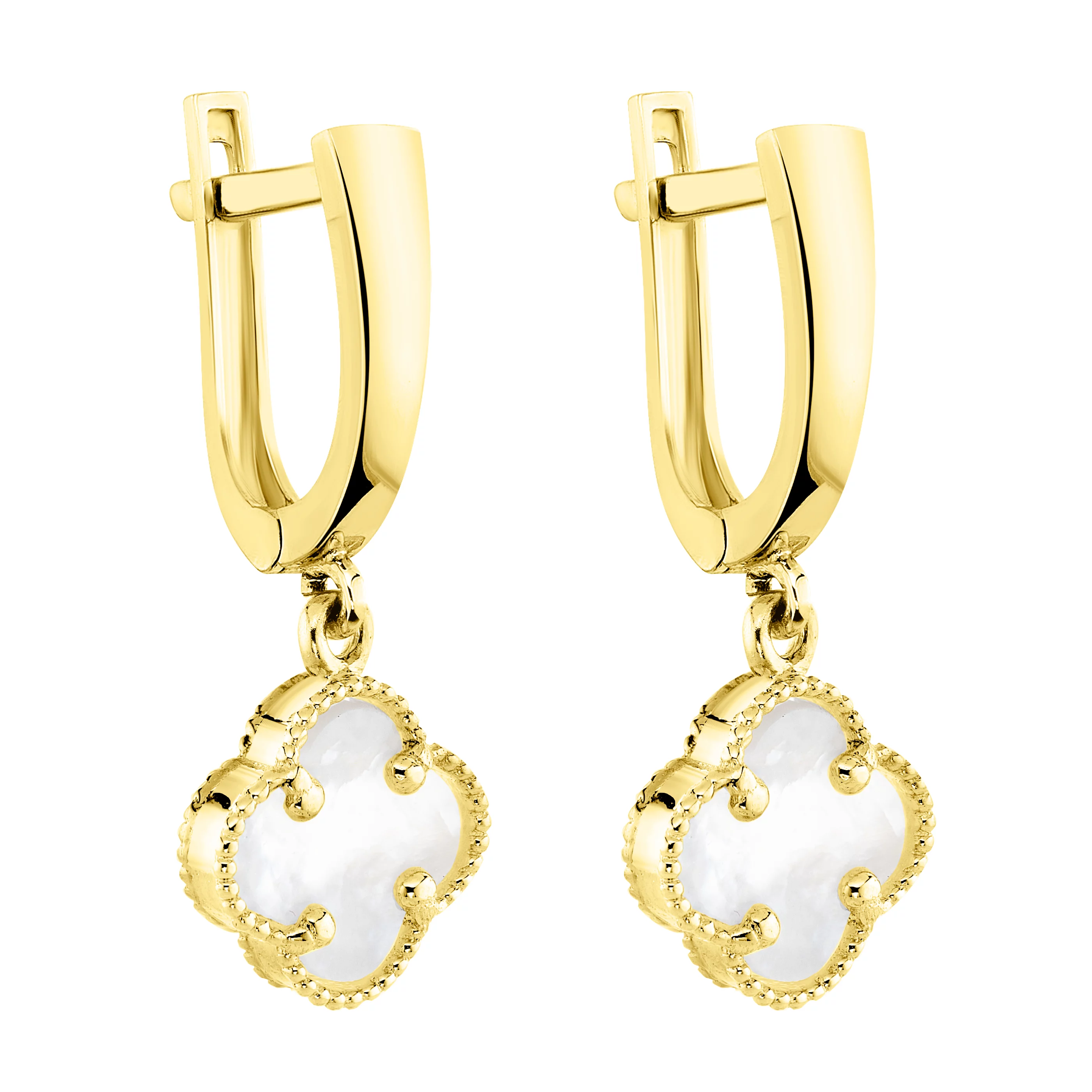 Сережки з жовтого золота з підвісами "Конюшина" з перламутром - 1866488
