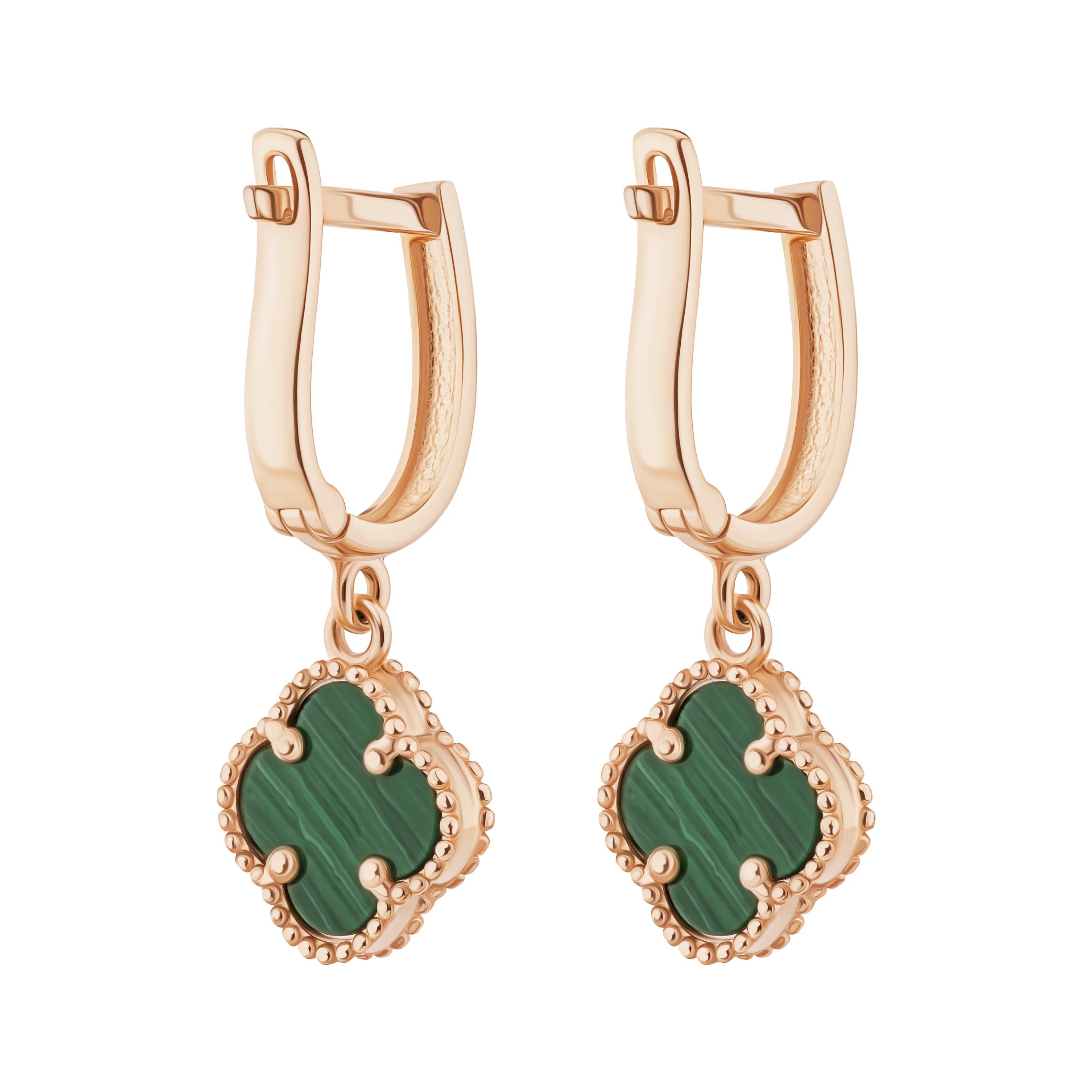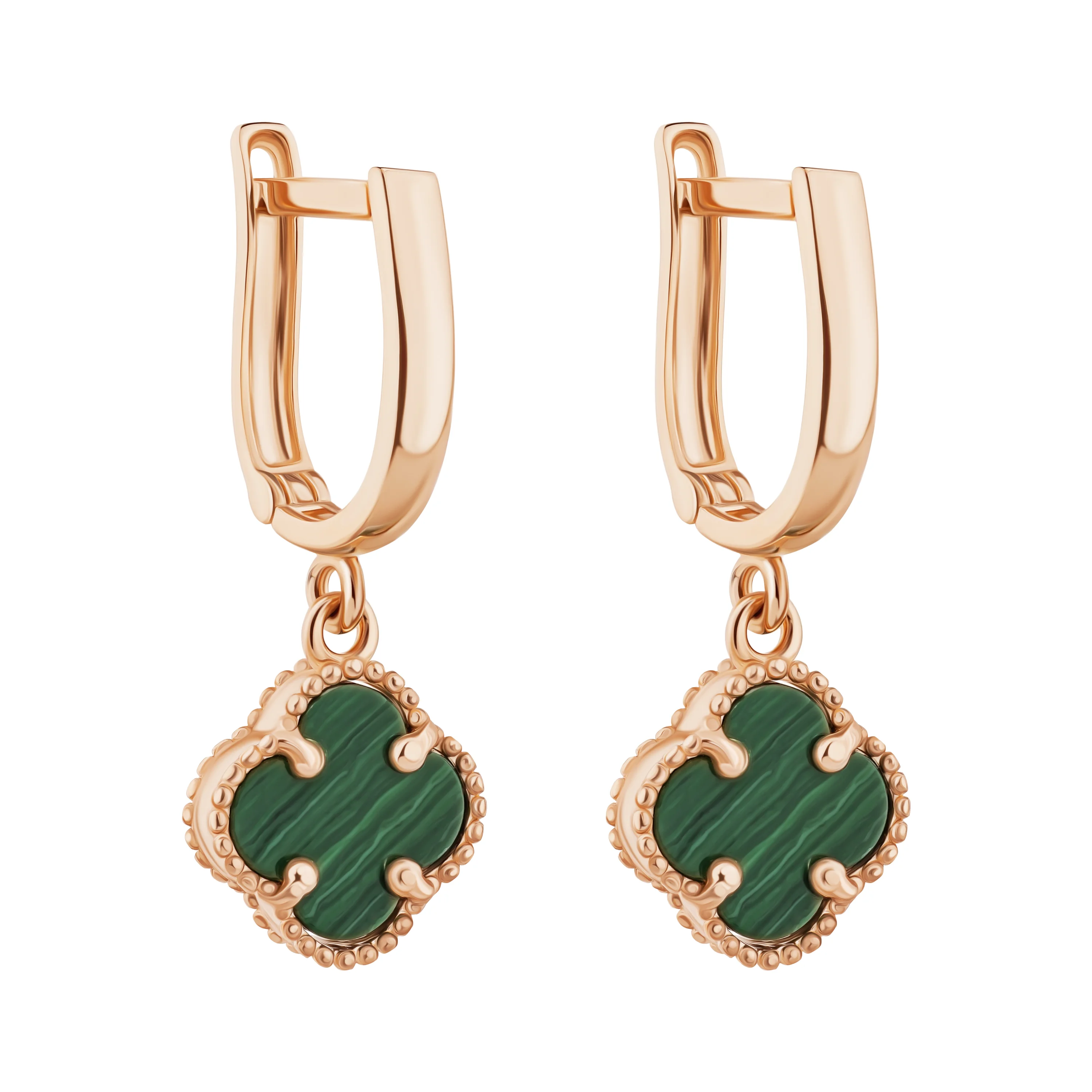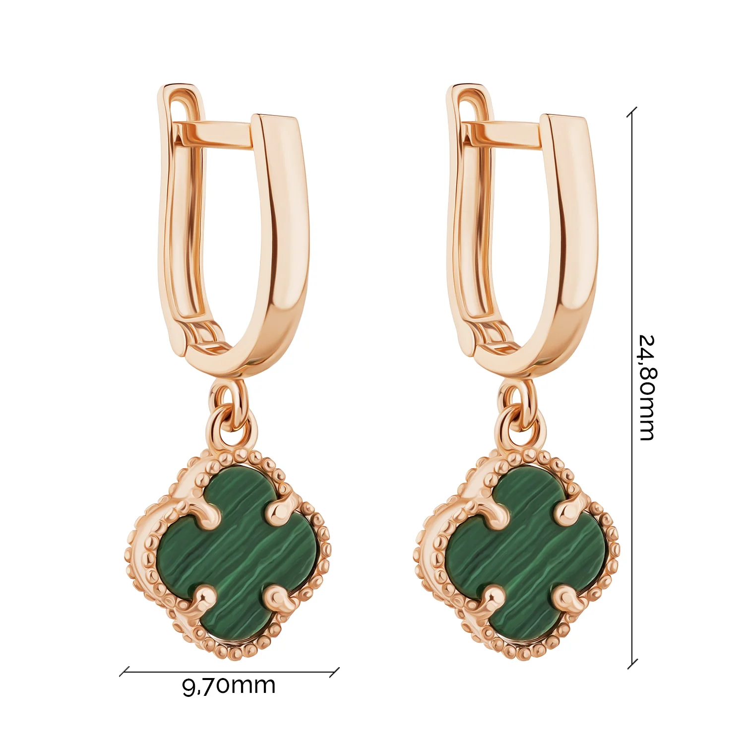 Сережки з підвісом у червоному золоті "Конюшина" з малахітом - 2179820