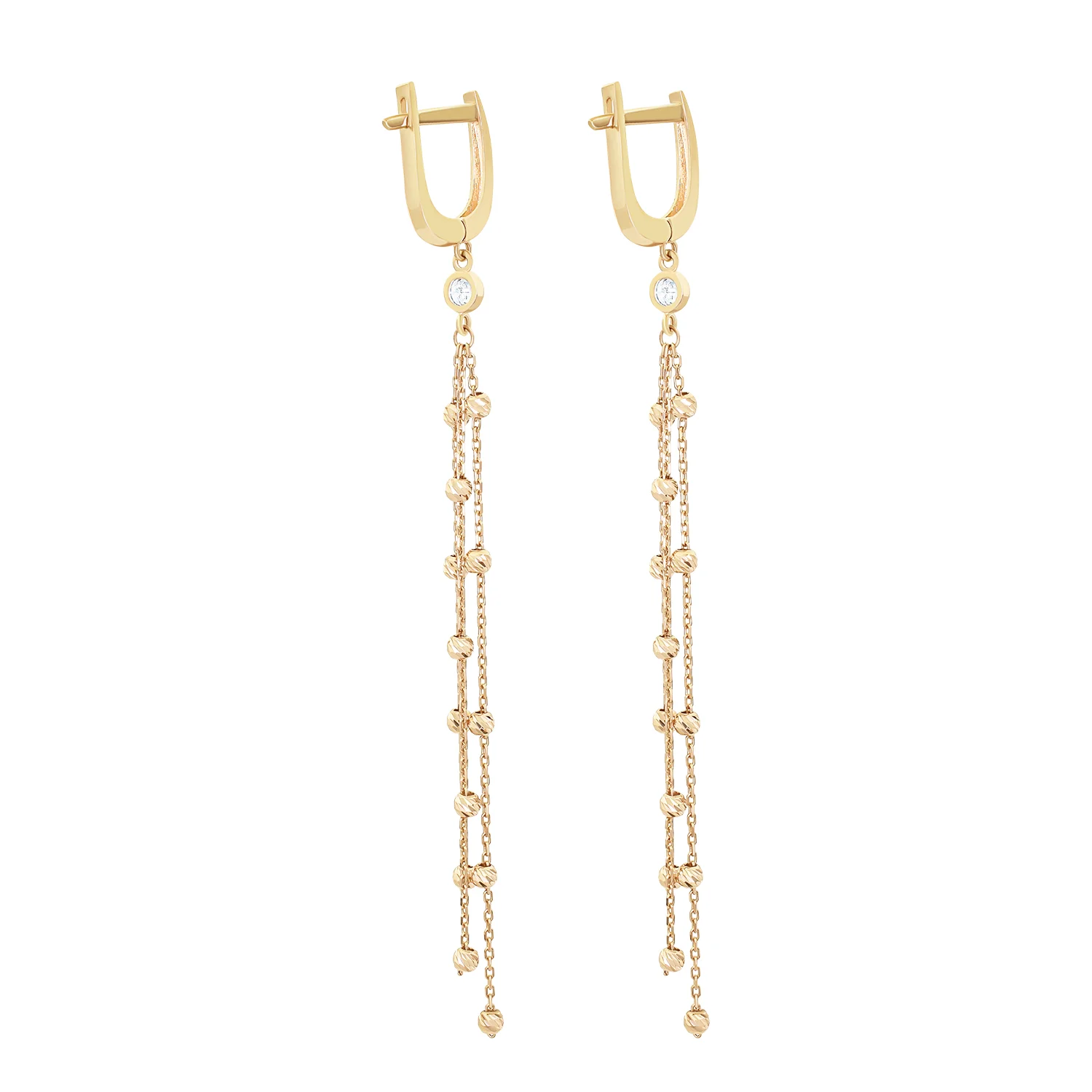 Сережки з підвісами "Ланцюжки з Кульками" з алмазною гранню та фіанітом у червоному золоті - 1530963