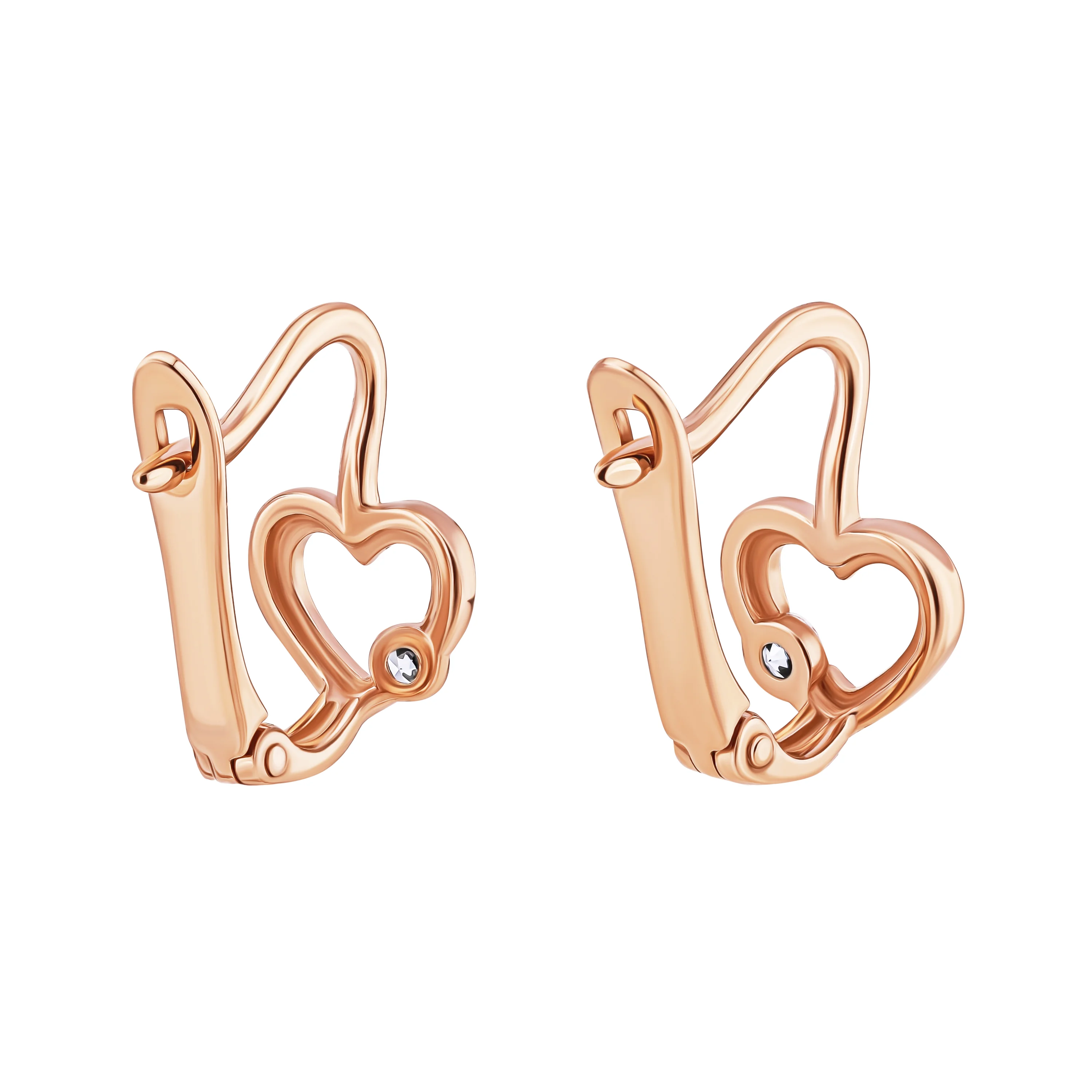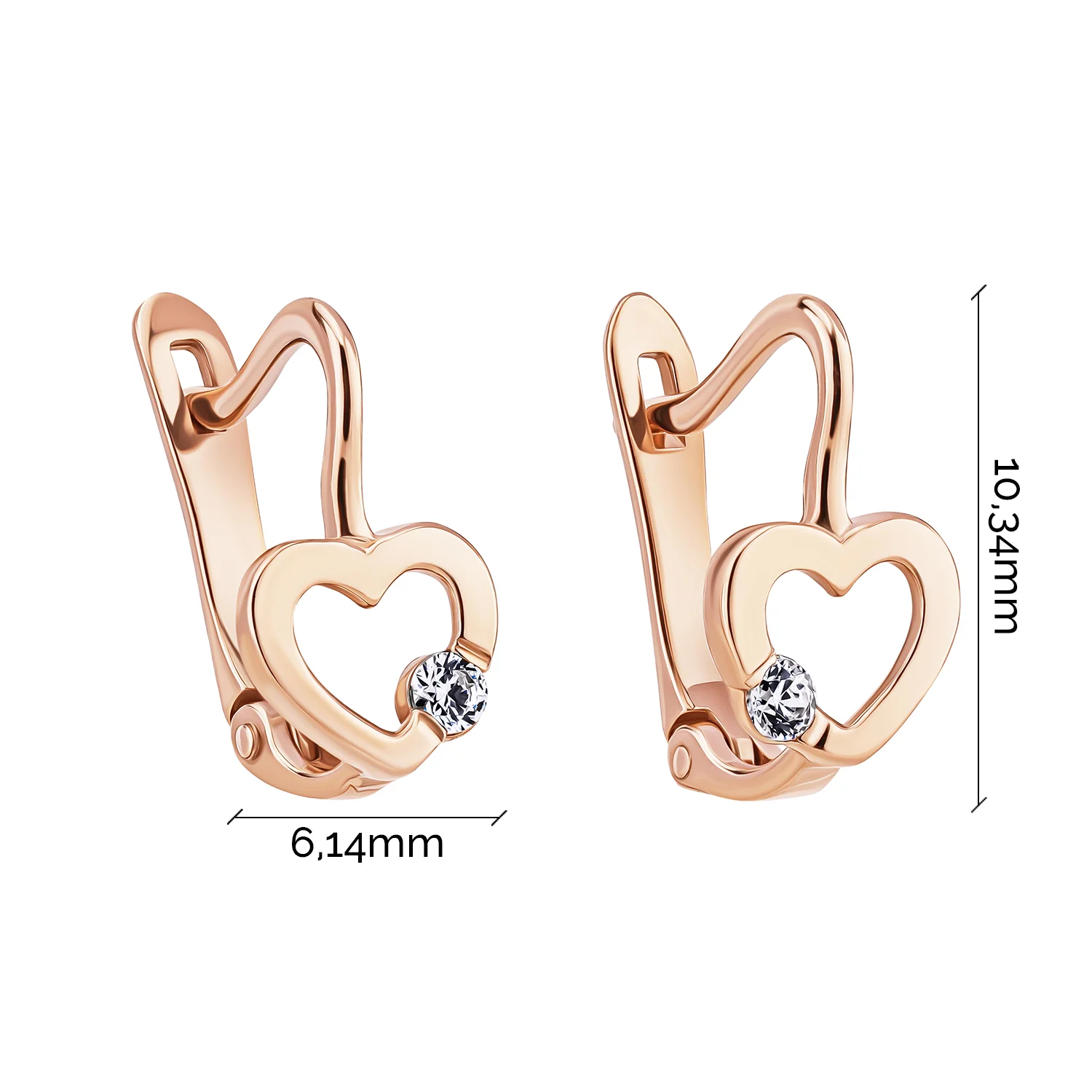 Сережки-гвоздики "Серце" в романтичному стилі з червоного золота та з фіанітами - 1859350